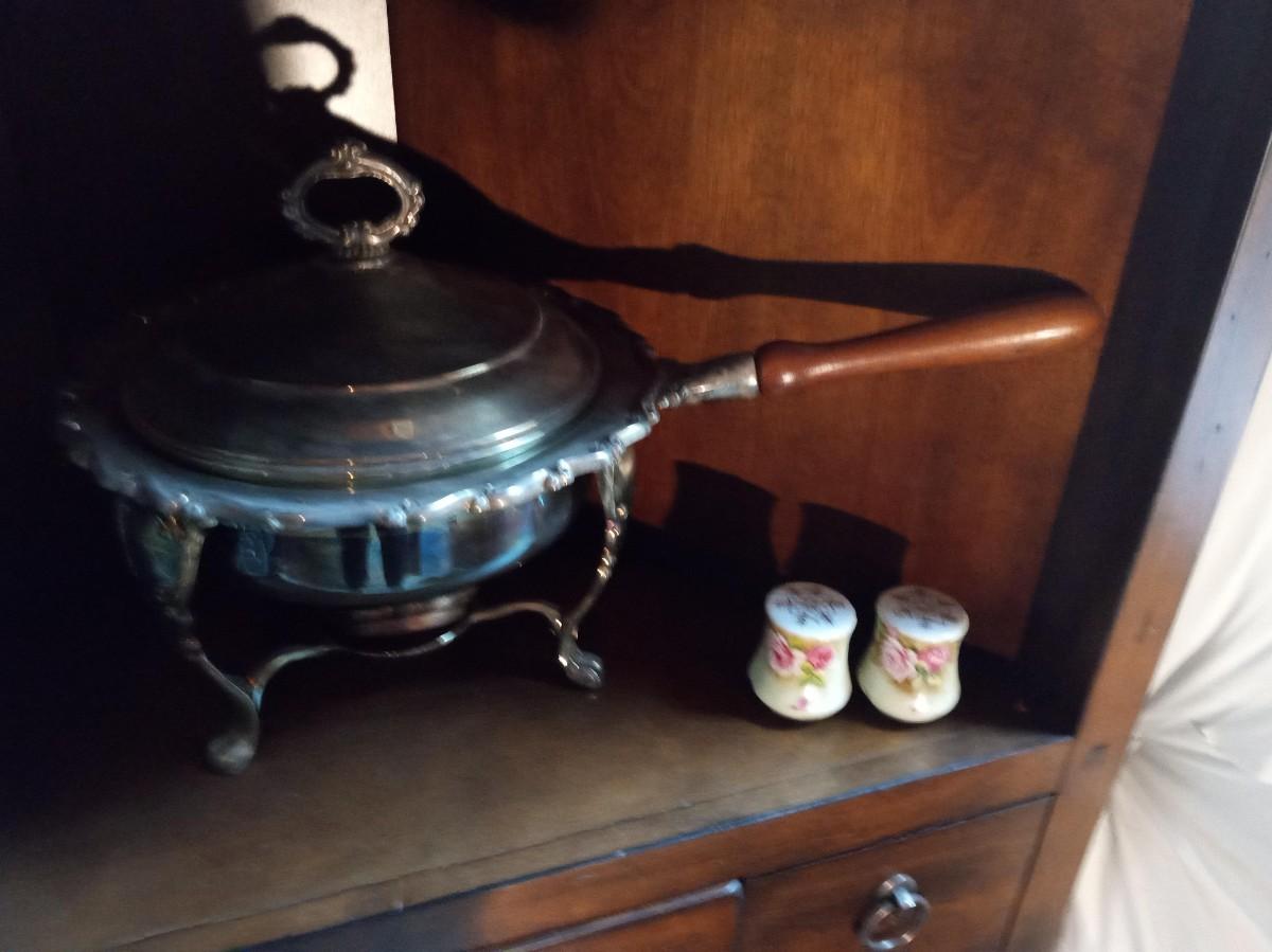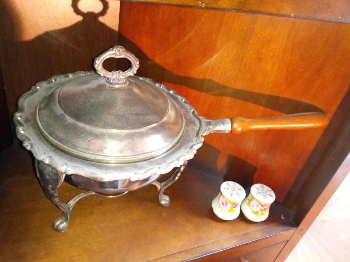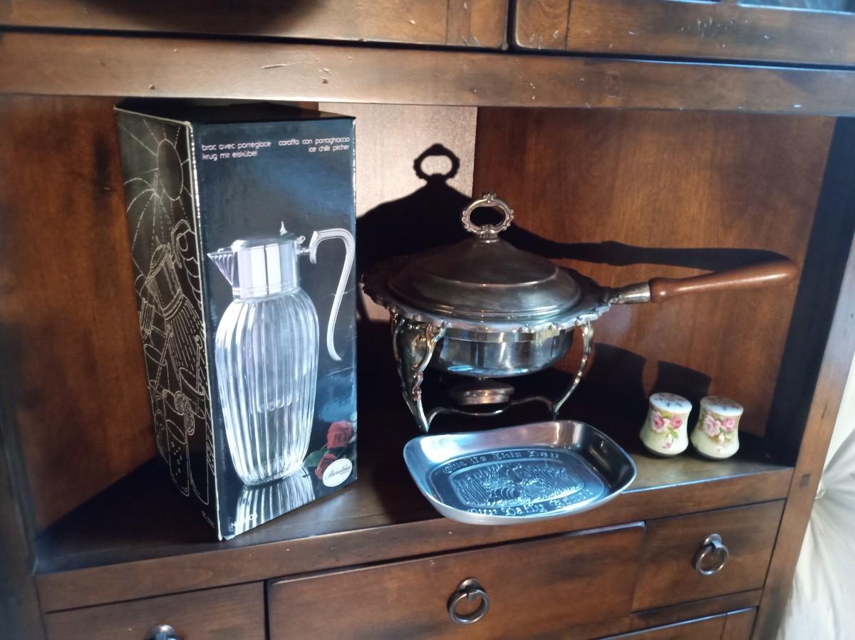 SILVER PLATED CHAFING DISH, PEWTER TRAY, GLASS PITCHER AND PORCELAIN SHAKERS