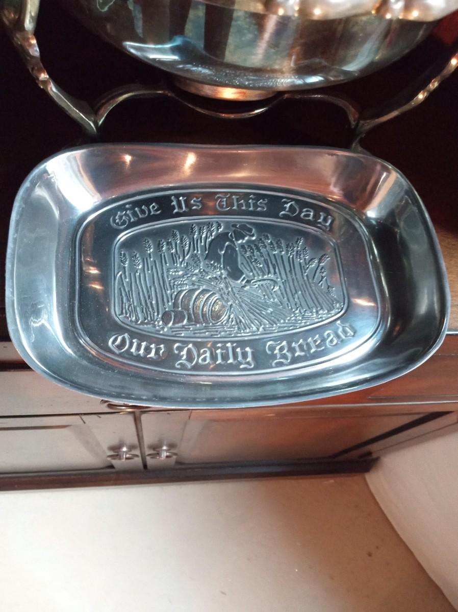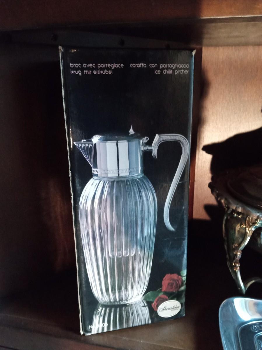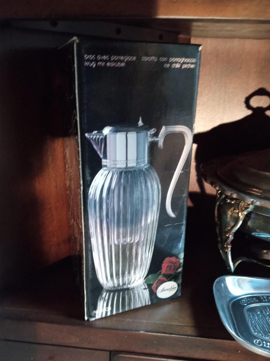 SILVER PLATED CHAFING DISH, PEWTER TRAY, GLASS PITCHER AND PORCELAIN SHAKERS
