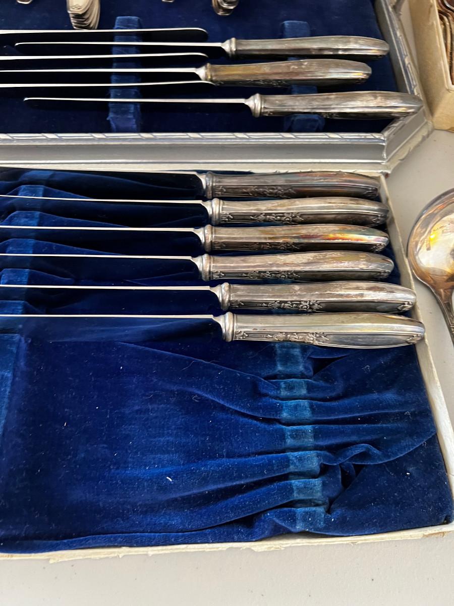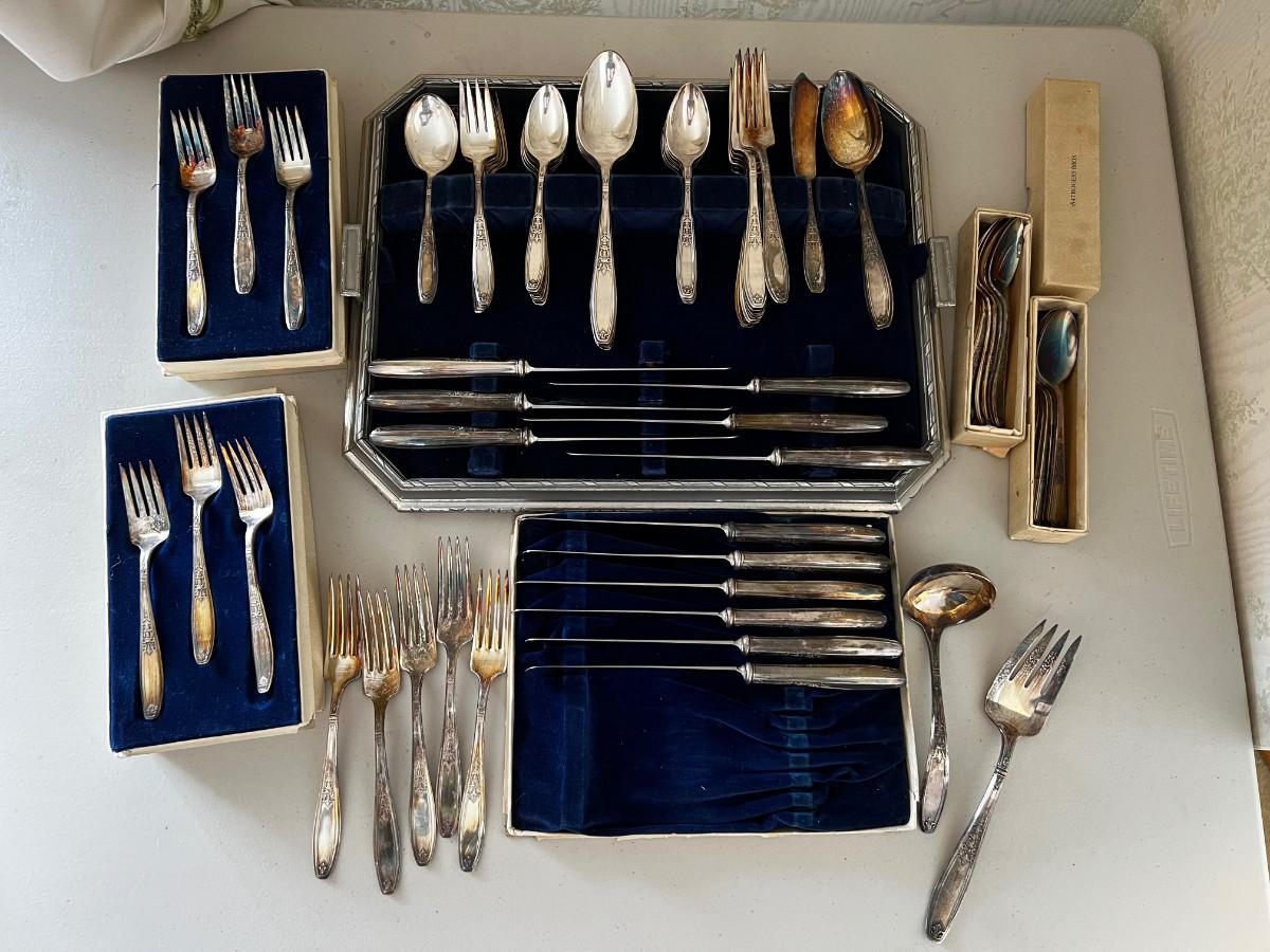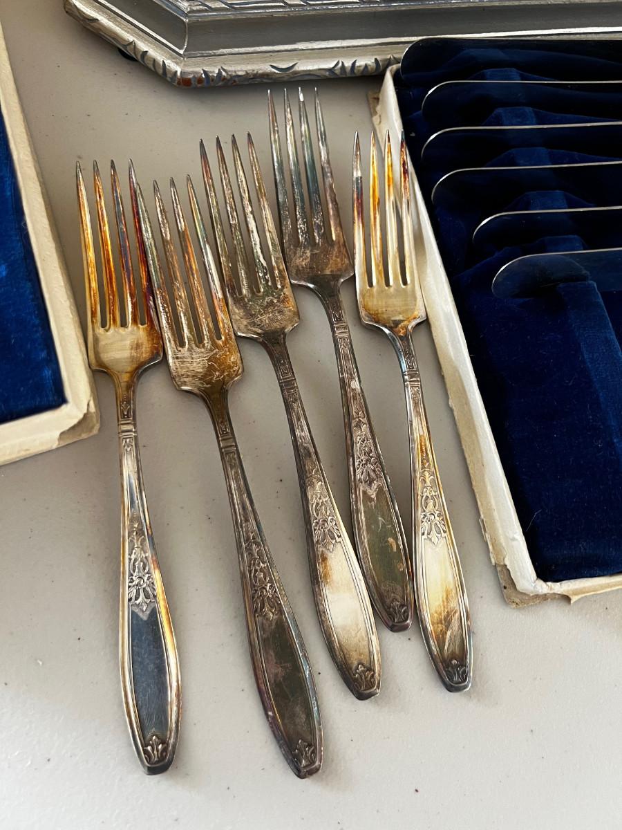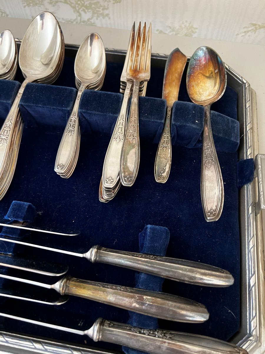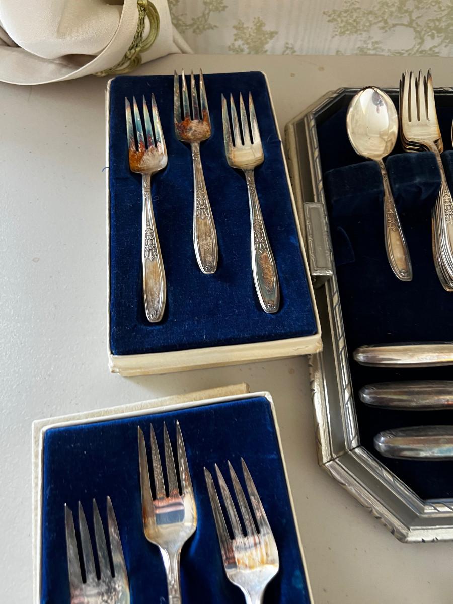 Used Shows Wear, Tarnished. Would clean up lovely!. Neat Patter! Has several boxes and has a wood painted box and flat display case for buffet.