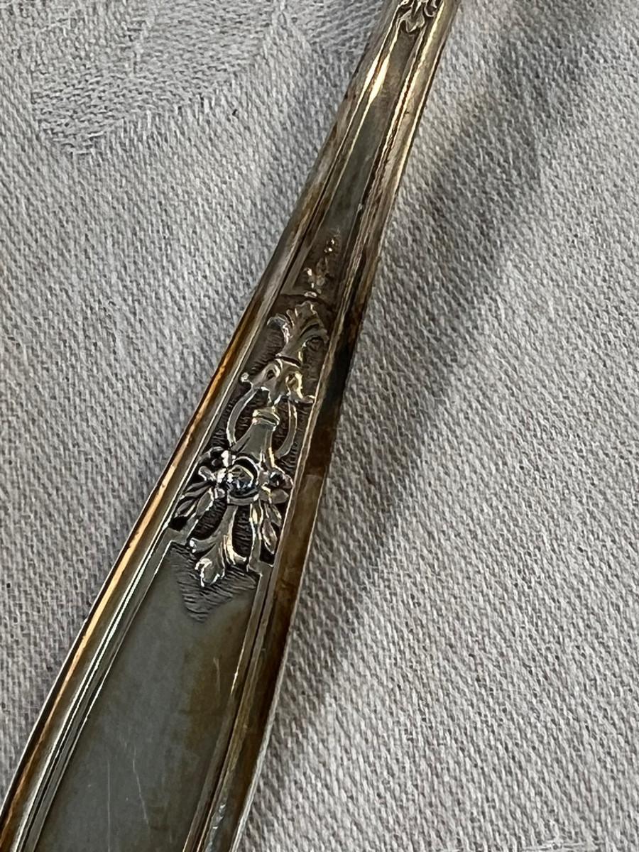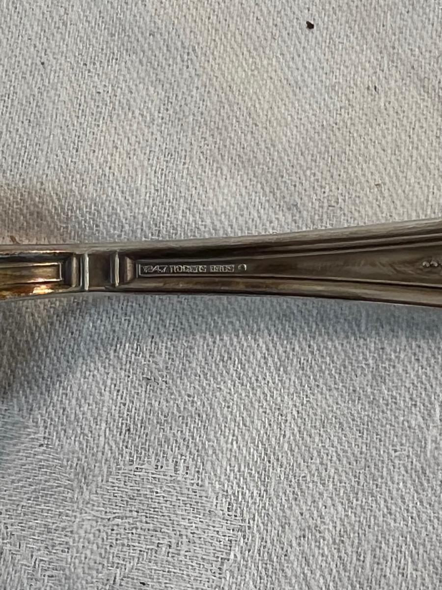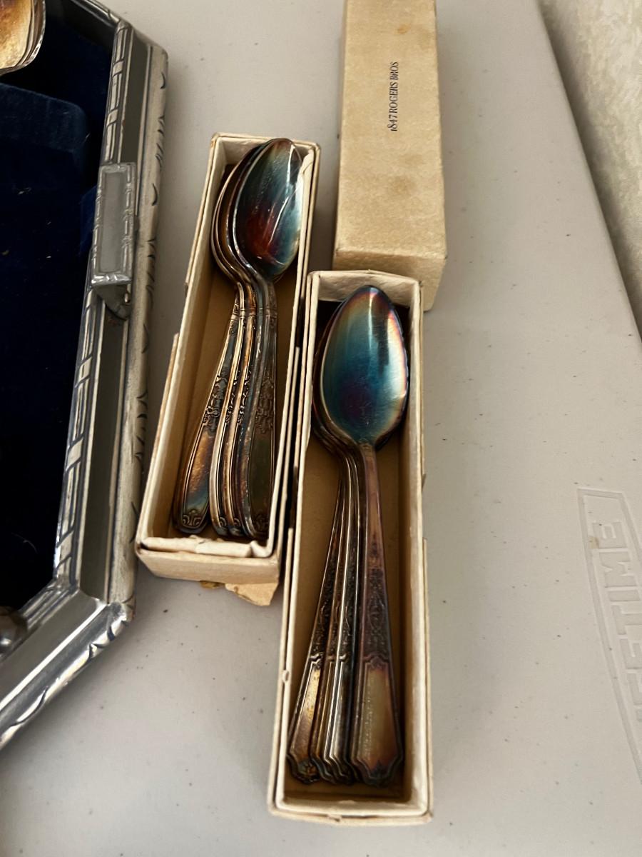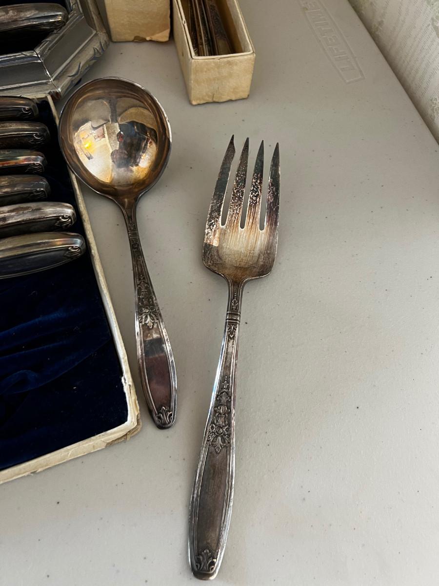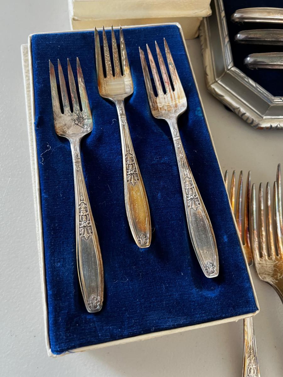 Used Shows Wear, Tarnished. Would clean up lovely!. Neat Patter! Has several boxes and has a wood painted box and flat display case for buffet.