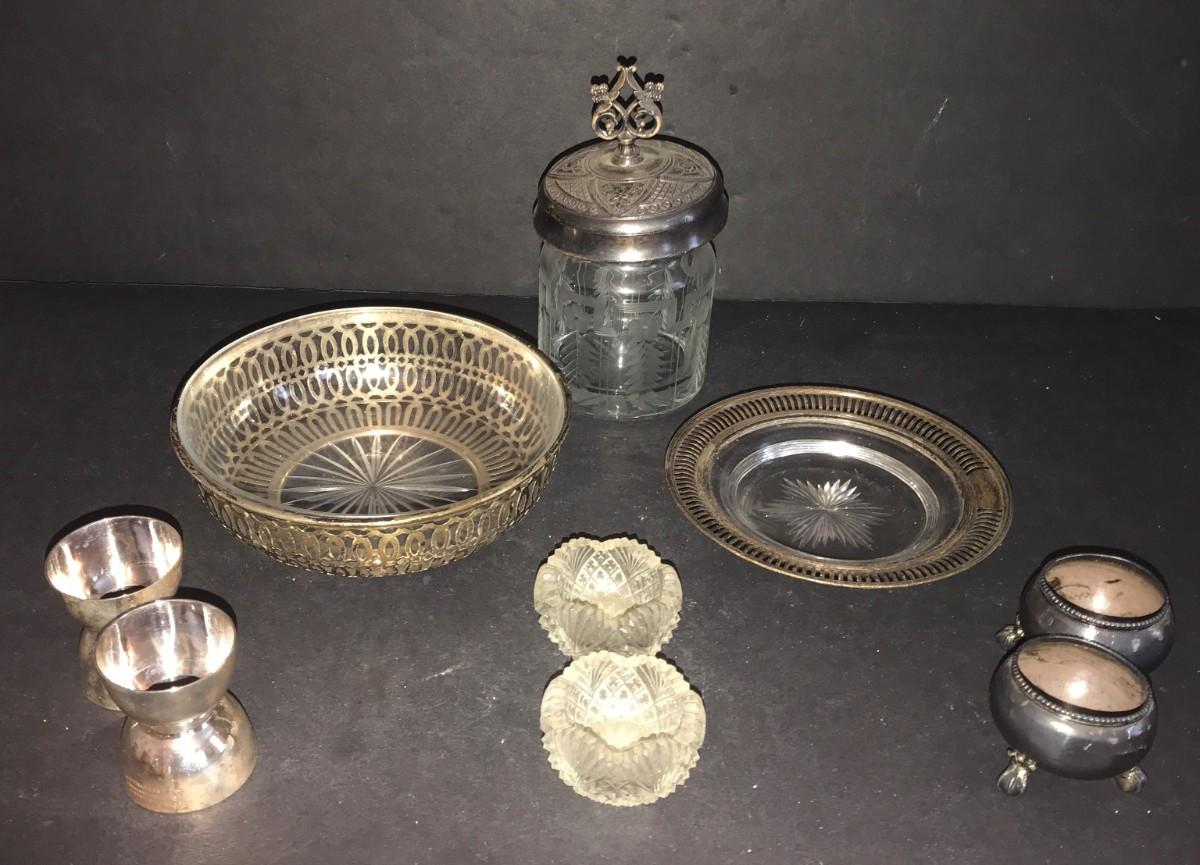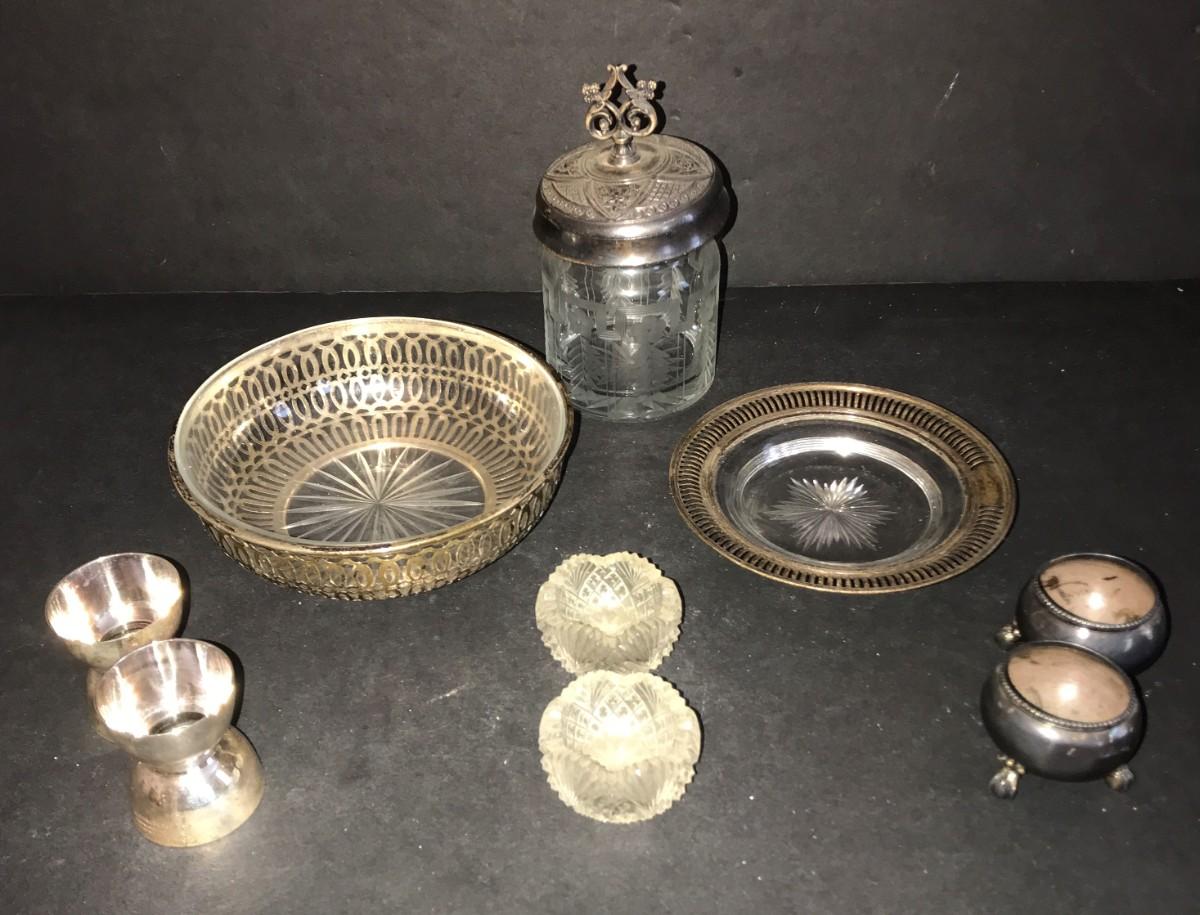 Lot includes etched glass jar with silver plated lid , glass lined silver plated bowl , etched glass and silver plated dish , two silver plated egg holders and two silver plated salts with press cut glass liners.