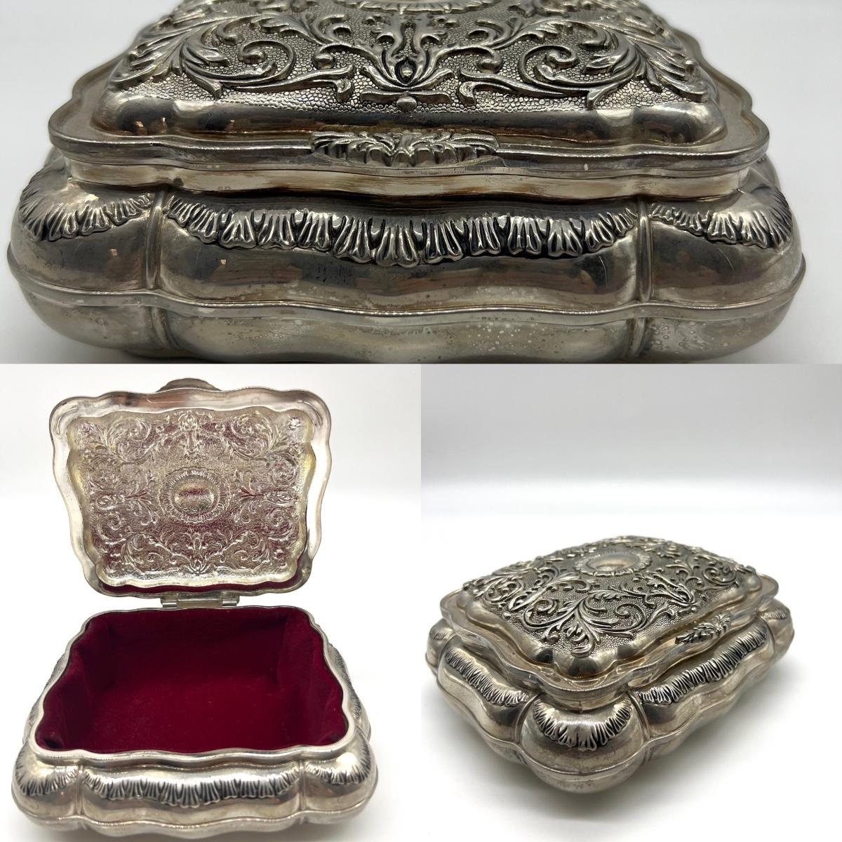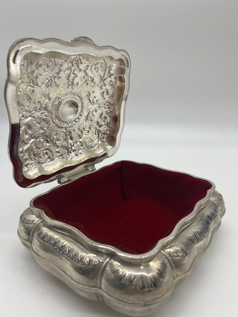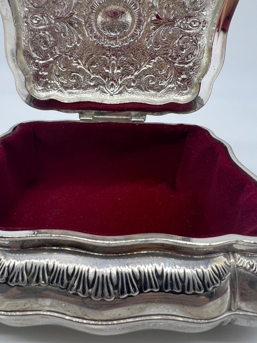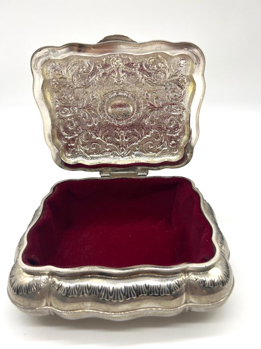 Silver Plated Jewelry box, felt lined in red. Measures 2 1/2 inches tall, 8 inches wide and 6 Inches deep.
