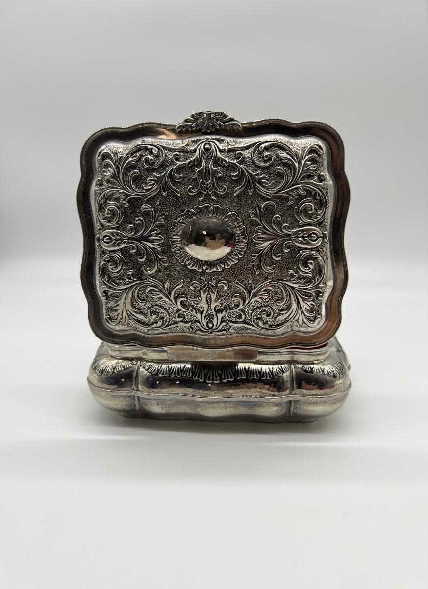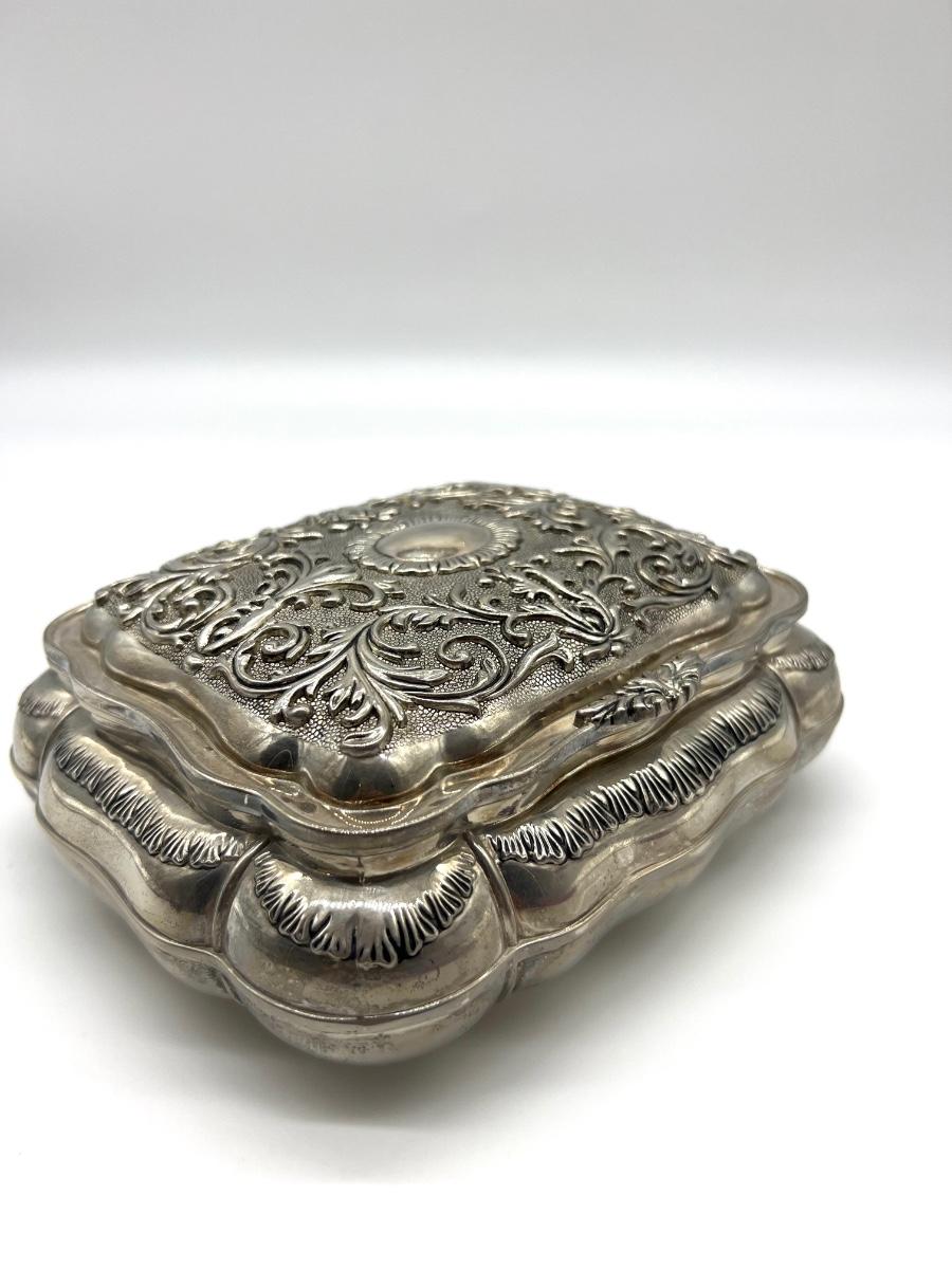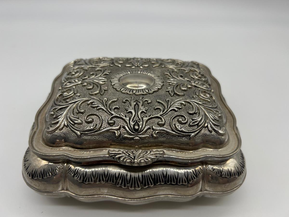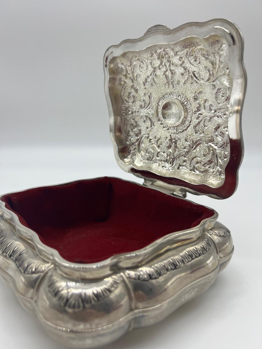Silver Plated Jewelry box, felt lined in red. Measures 2 1/2 inches tall, 8 inches wide and 6 Inches deep.
