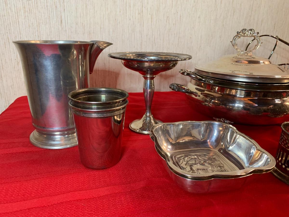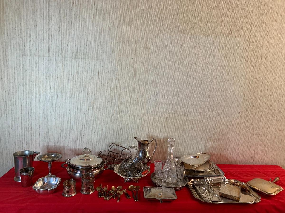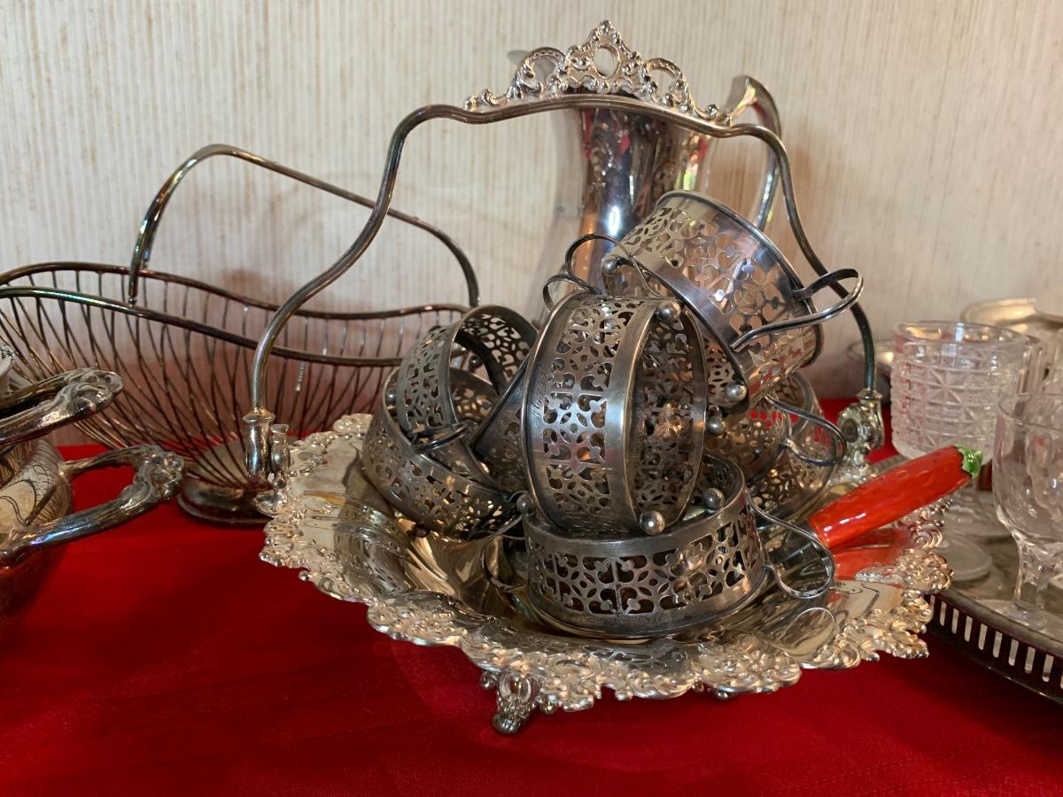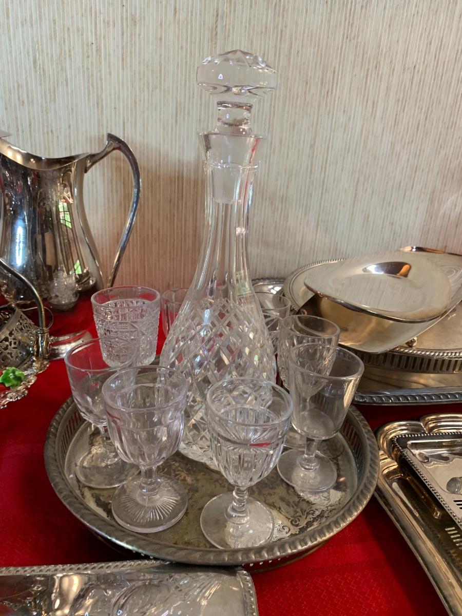 Silver plated entertaining dishes including a pitcher, candle holders, drinking cups a crystal decanter and glasses and more