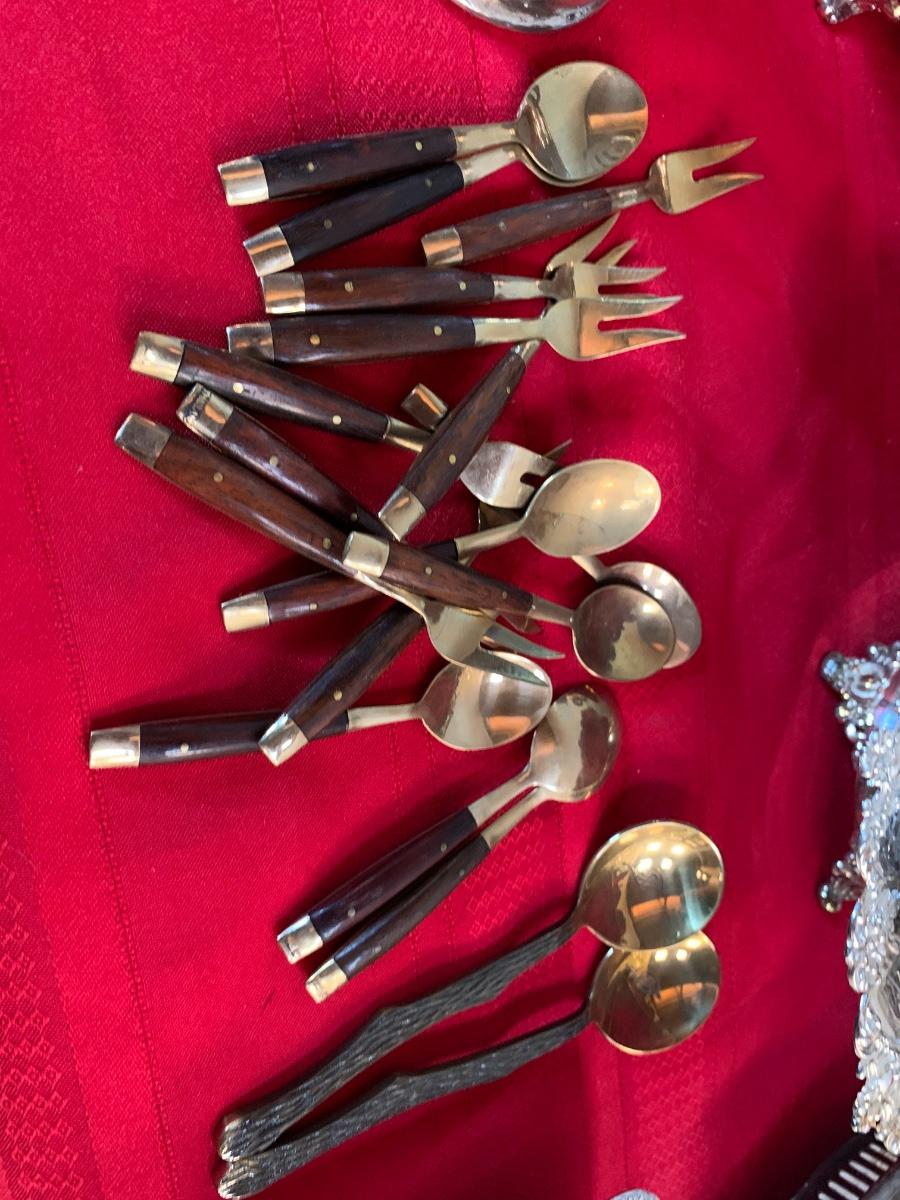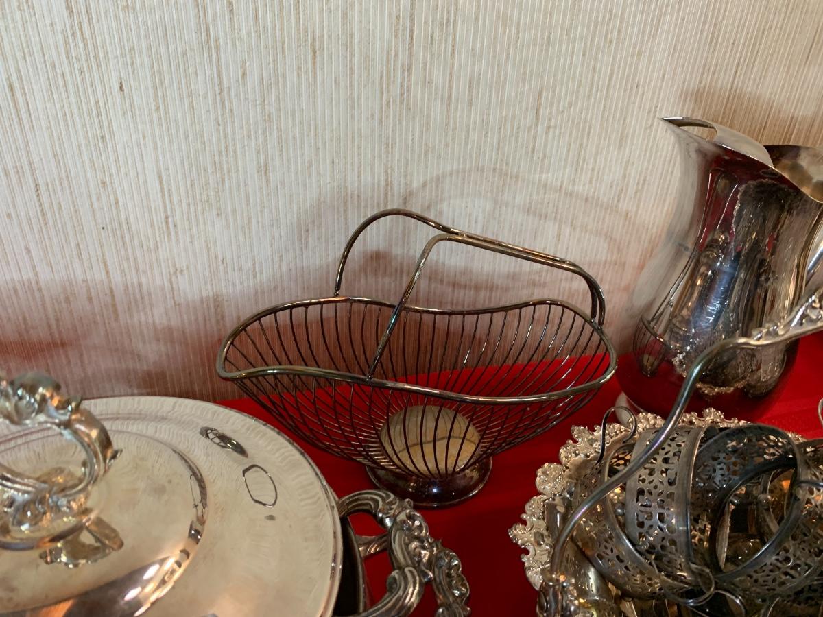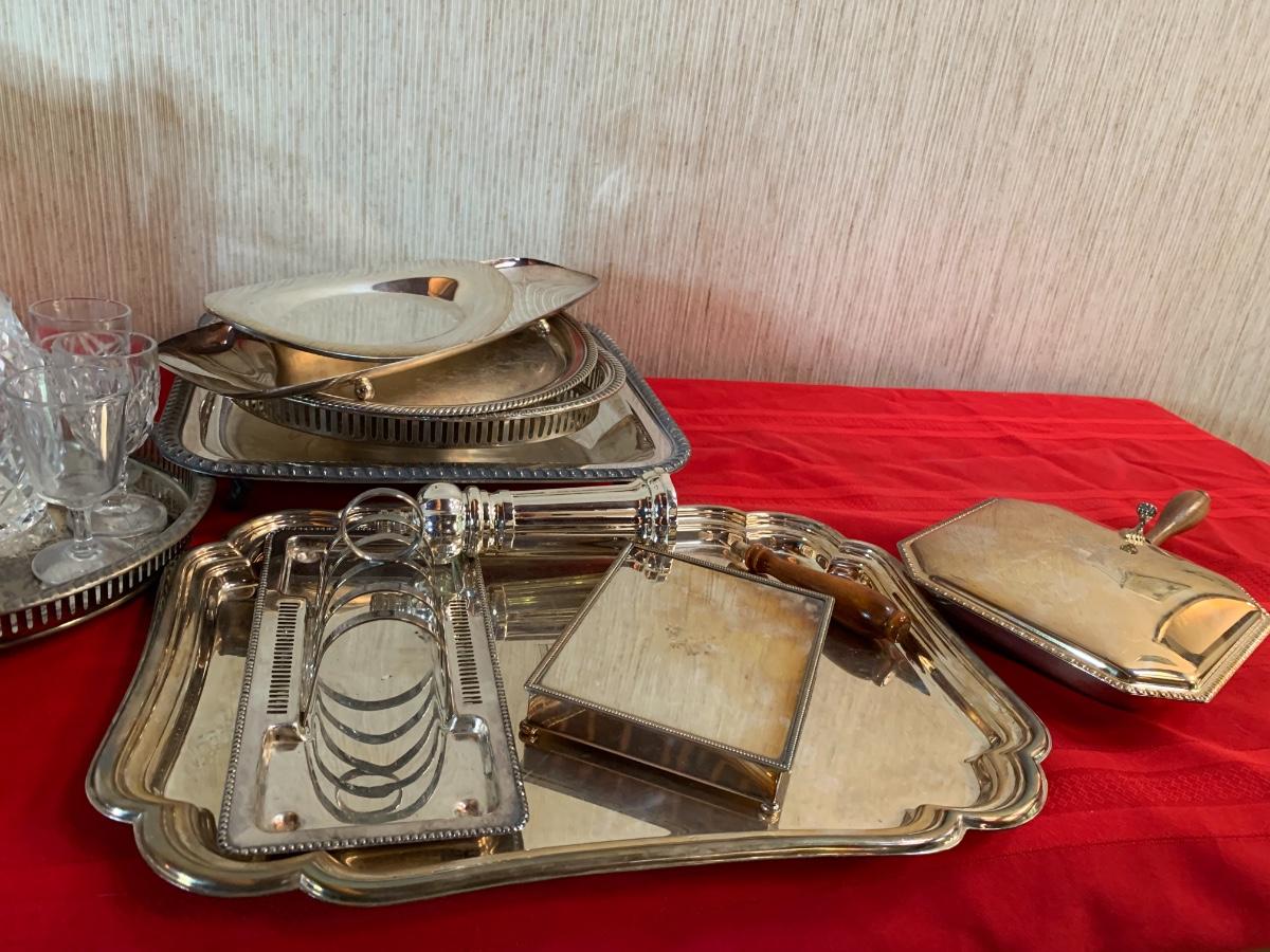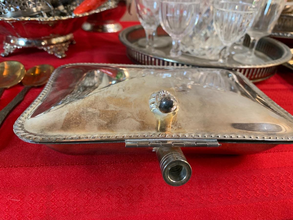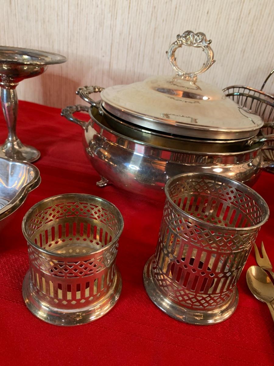 Silver plated entertaining dishes including a pitcher, candle holders, drinking cups a crystal decanter and glasses and more