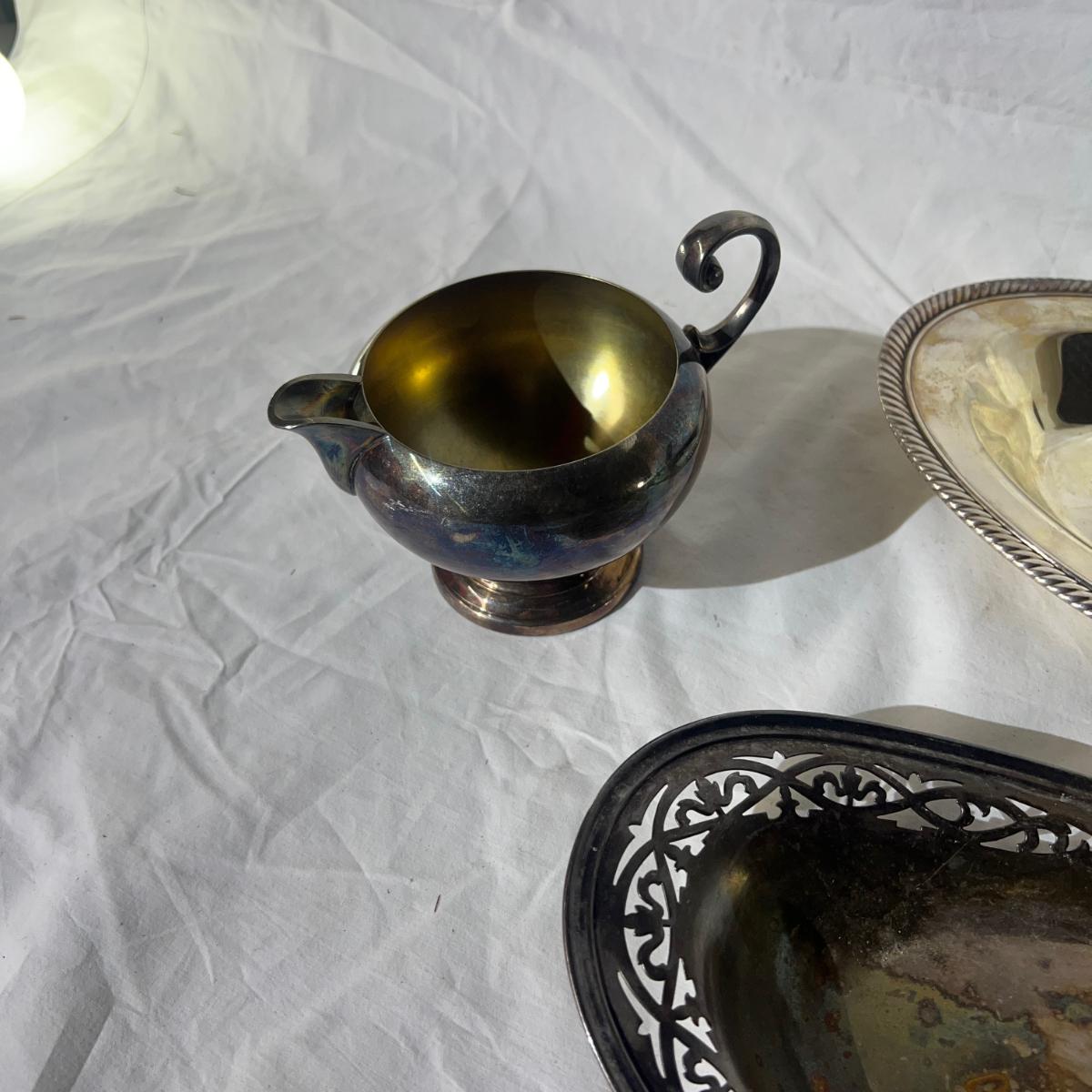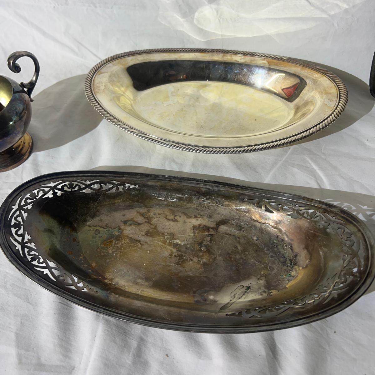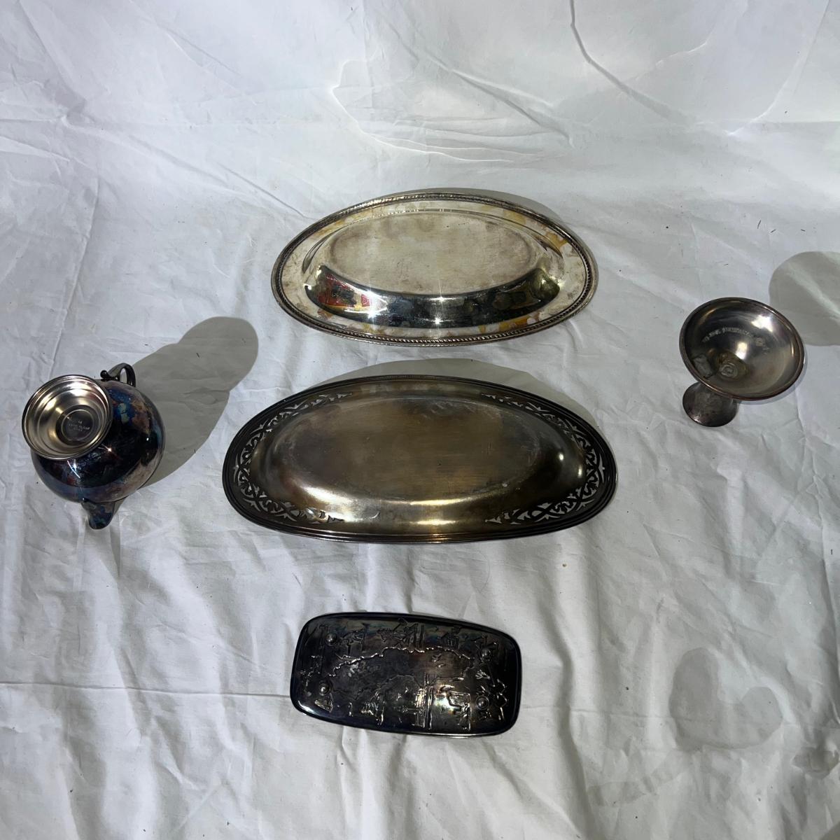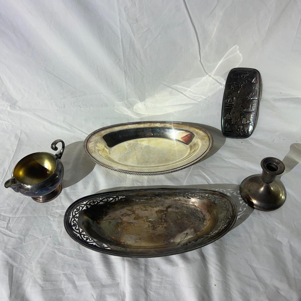 Silver plated Miscellaneous, two serving plates, decorative trinket tray, candlestick and cream pourer