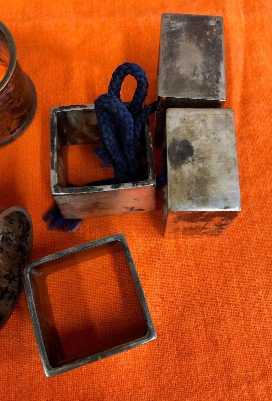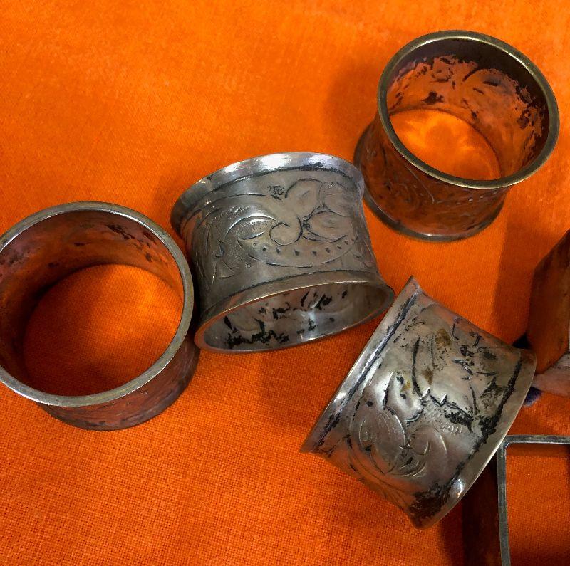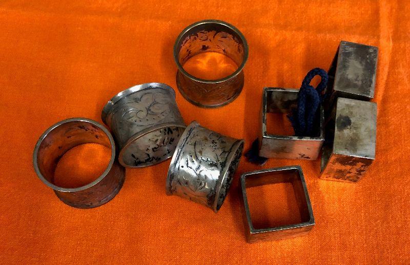 Two sets of four silver plated napkin rings...both Modern and Traditional....