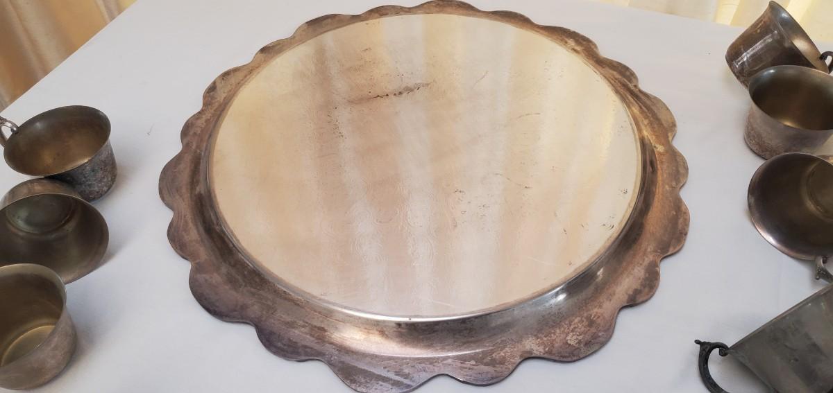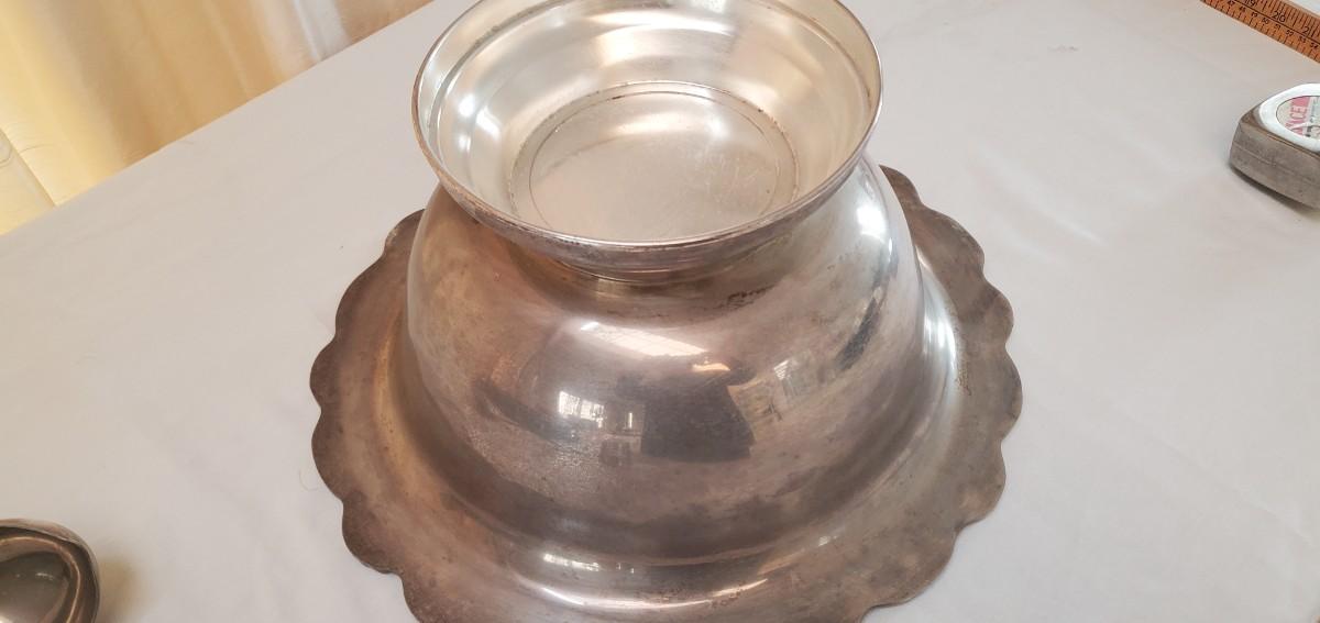 Heavy punch bowl set with cups and ladle and platter. See photos for details