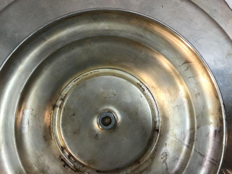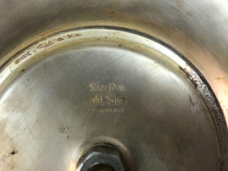 Sheridan silver plated “lazy Susan” featuring a large turning platter atop a pedestal, having center glass insert with dome surrounded by five glass inserts. Tray measures 7-3/4” high and 17-1/4” in diameter. All measurement are approx.