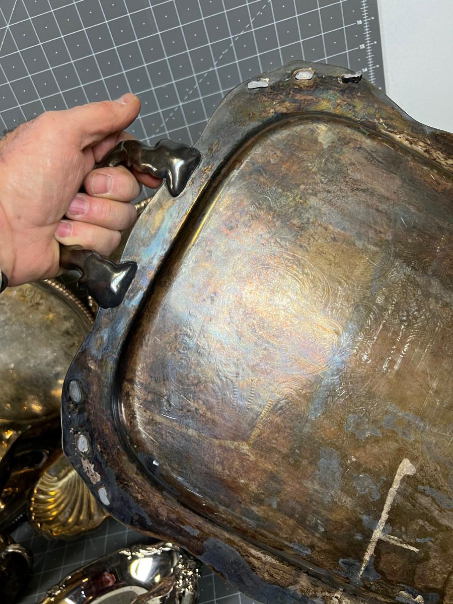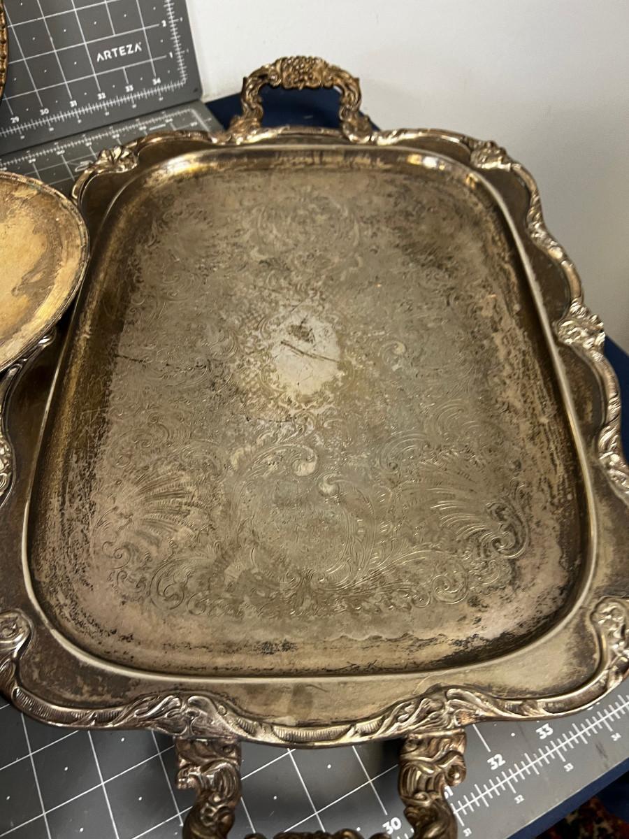 Used shows Tarnish but cool! Large Tray is missing a couple of feet