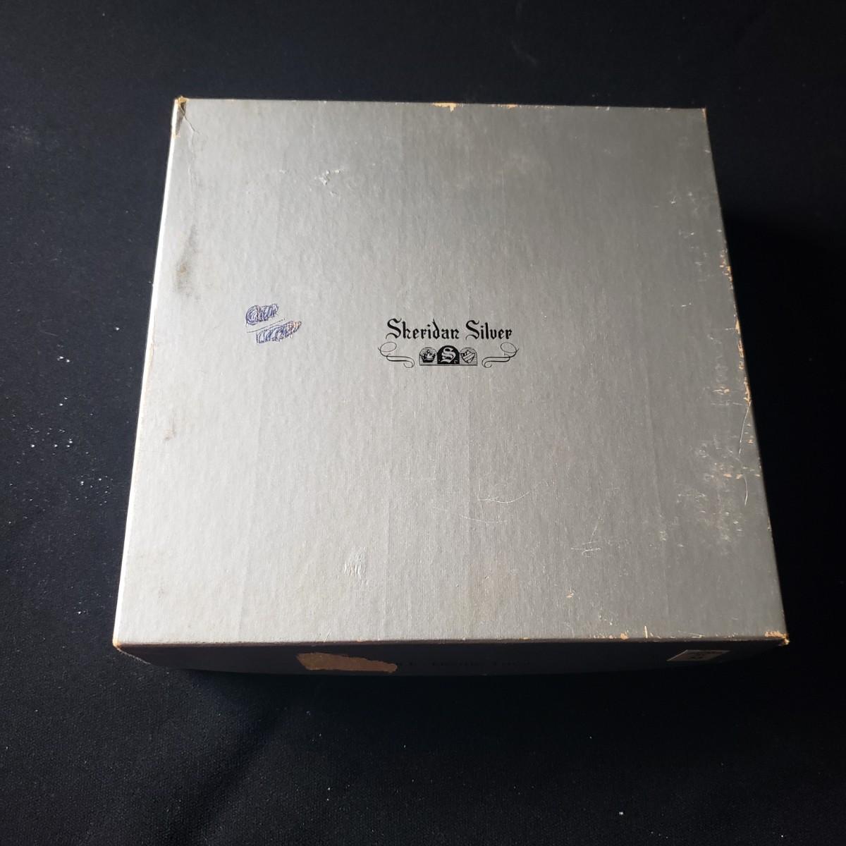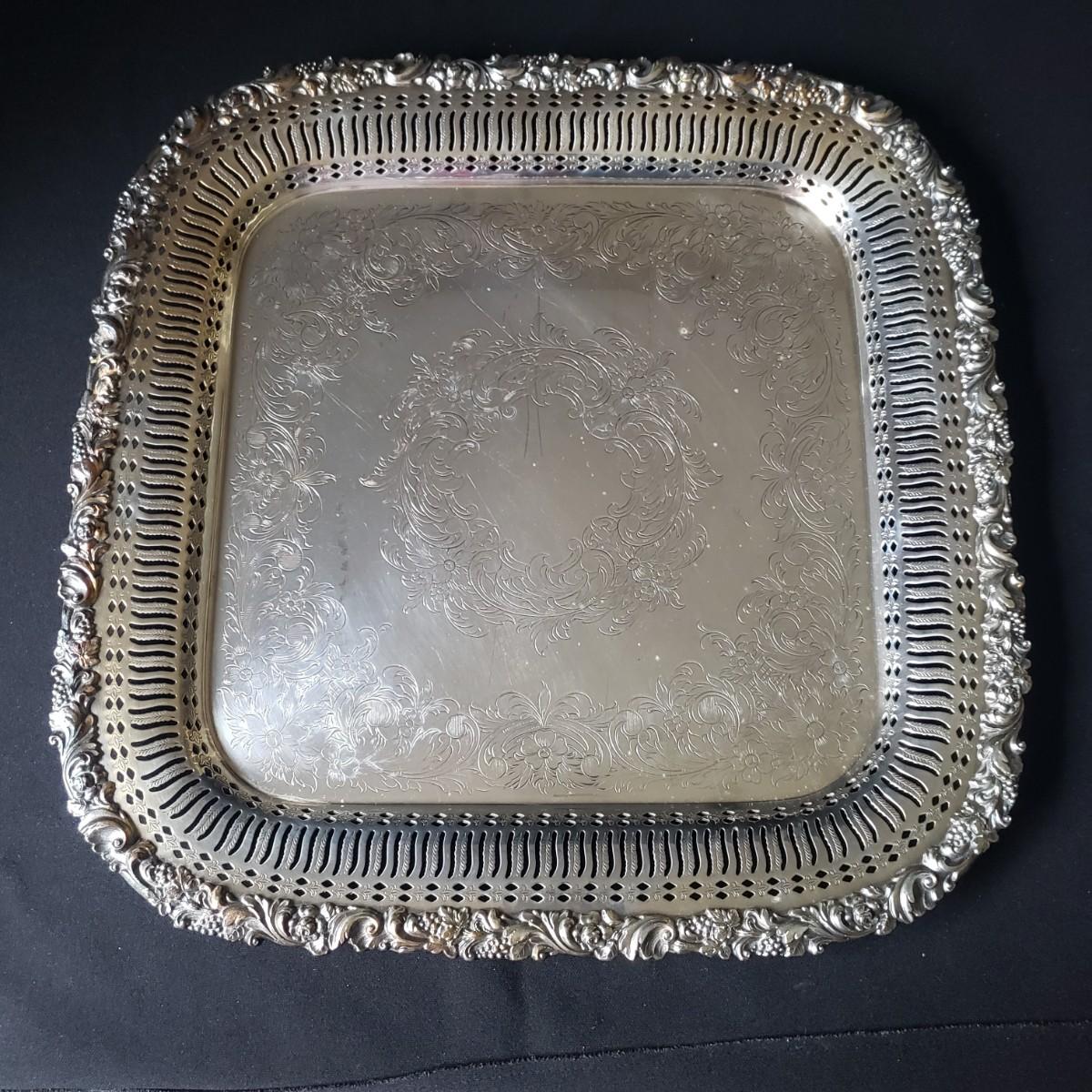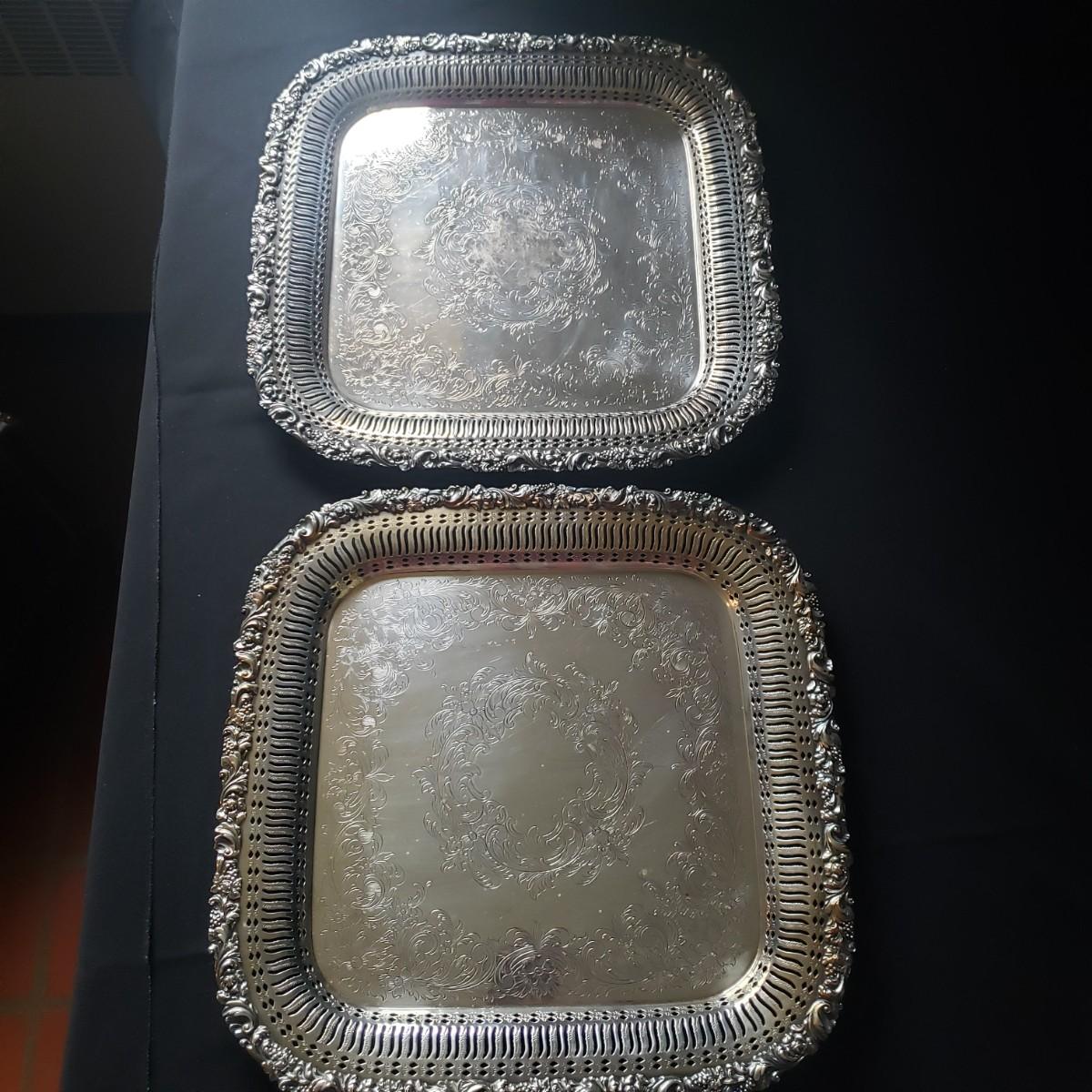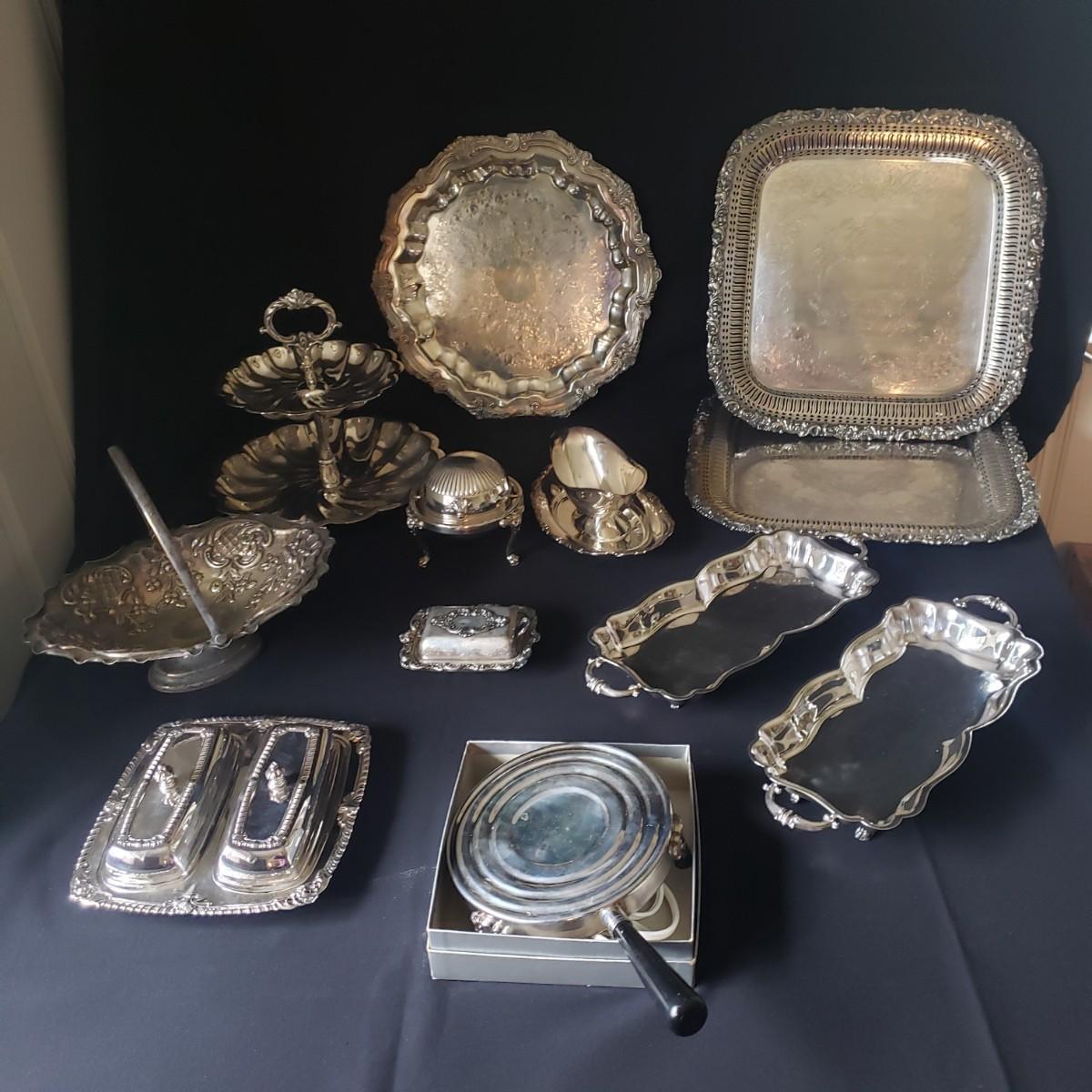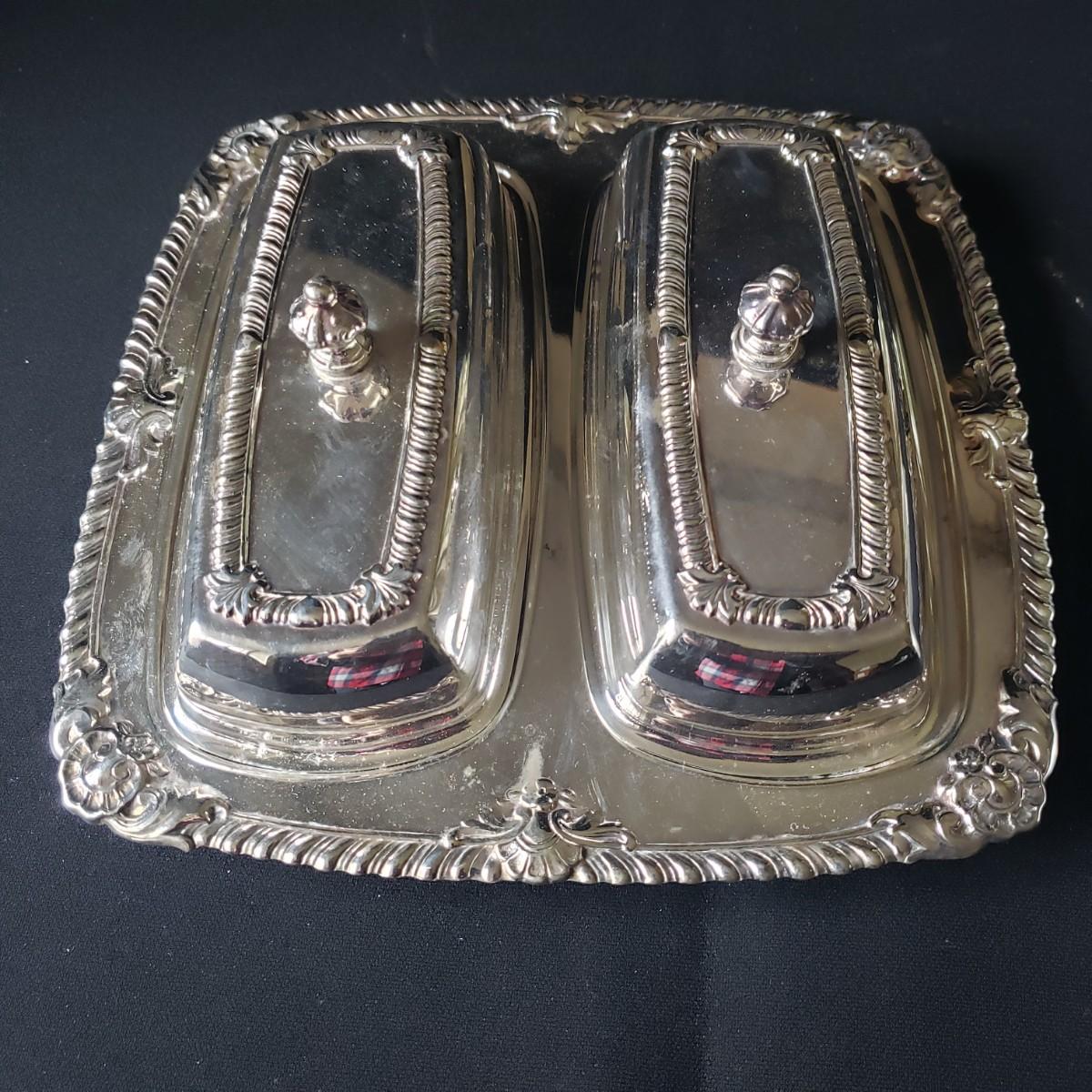 You will be the hit of the town using this serving set at your next party! This 12-item lot has a dual butter/relish dish, heated trivet that heats up when plugged in and a flip top sugar cube dish. The gravy boat measures 9" x 6" x 4"H and is made by Towle. The two-tiered dish made by F.B. Rogers breaks down for easy storage. The last pair of identical serving platters measure 16" x 16".