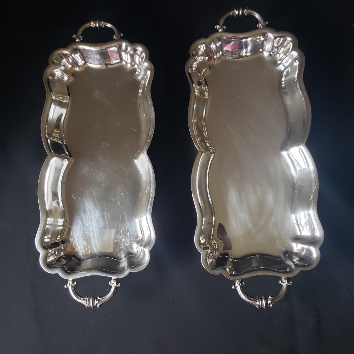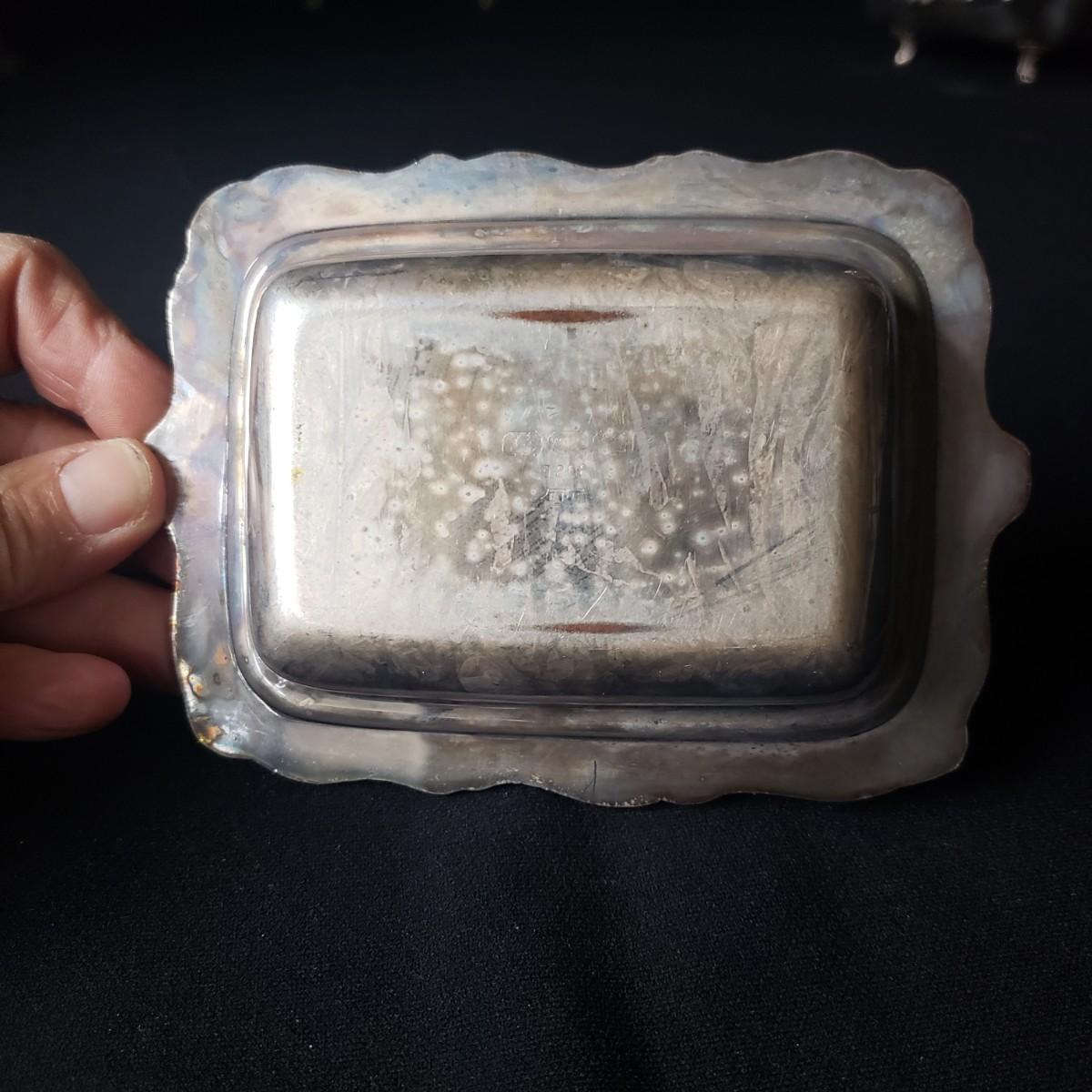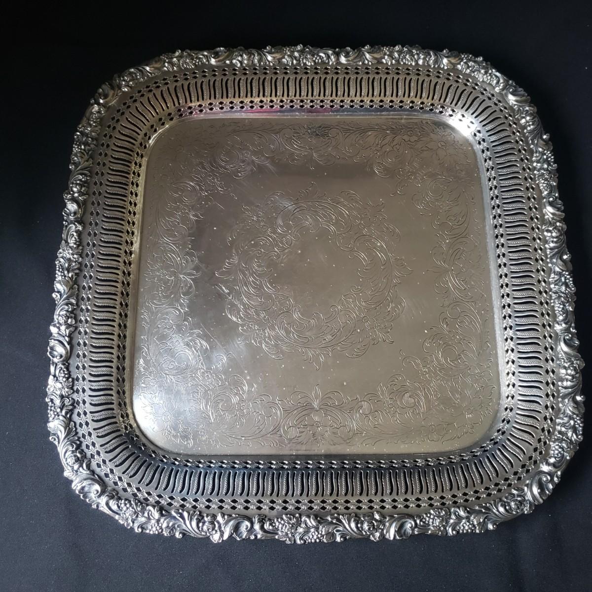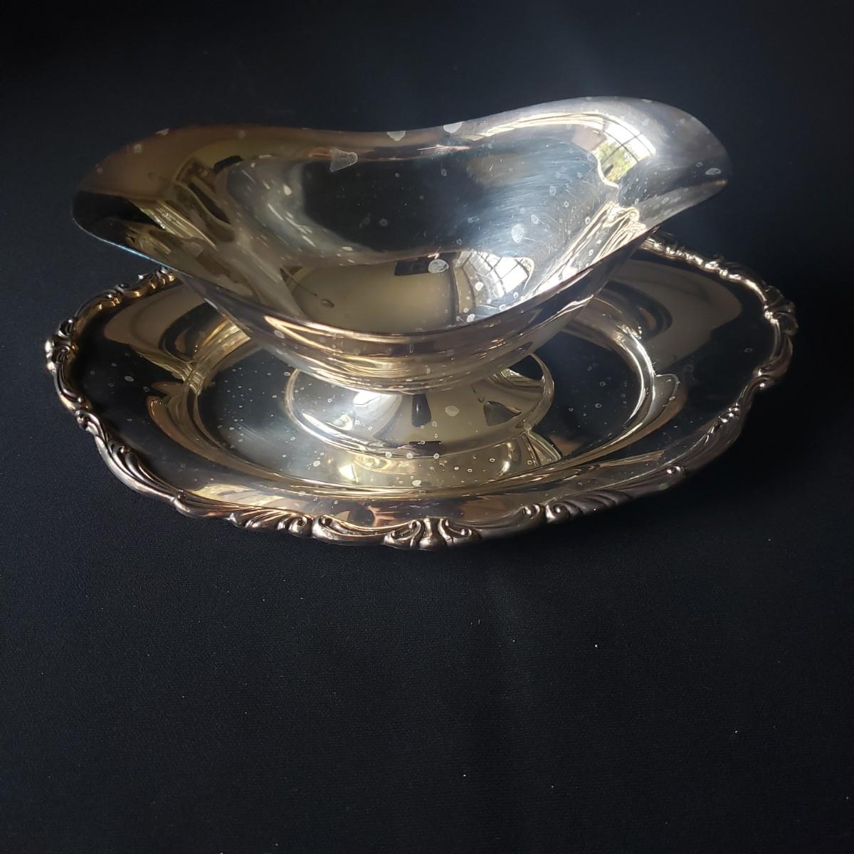 You will be the hit of the town using this serving set at your next party! This 12-item lot has a dual butter/relish dish, heated trivet that heats up when plugged in and a flip top sugar cube dish. The gravy boat measures 9" x 6" x 4"H and is made by Towle. The two-tiered dish made by F.B. Rogers breaks down for easy storage. The last pair of identical serving platters measure 16" x 16".