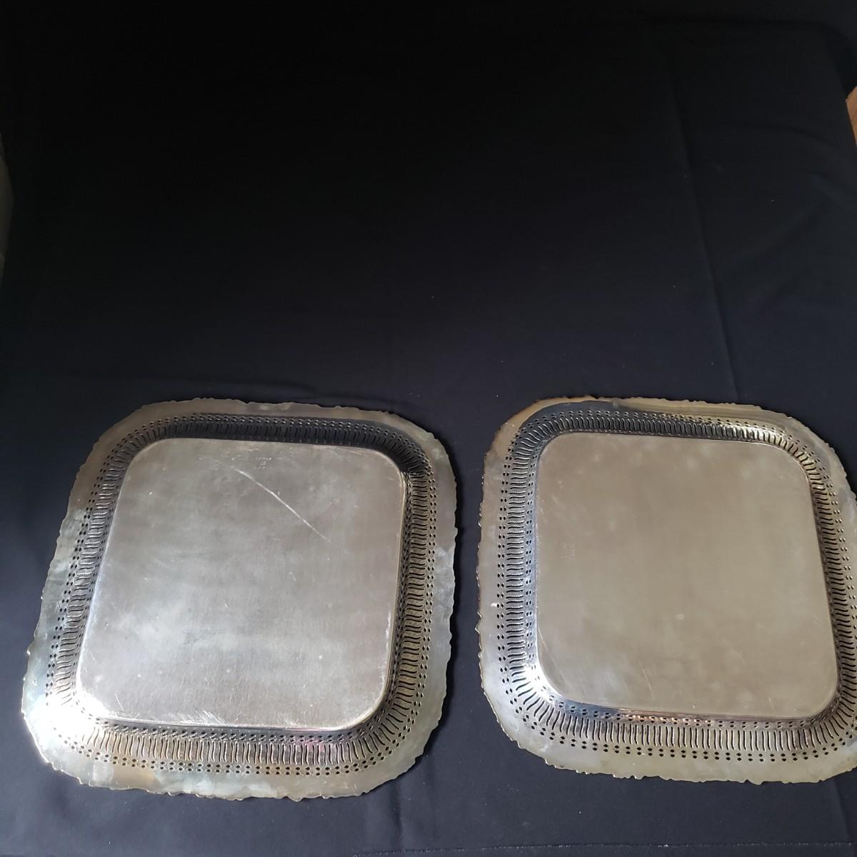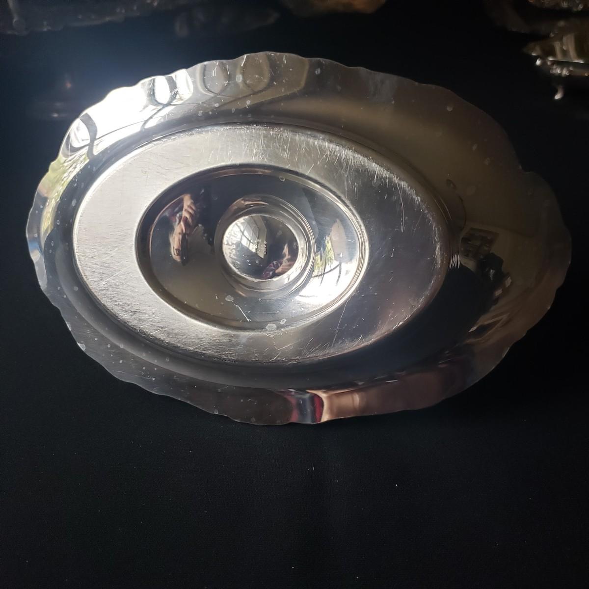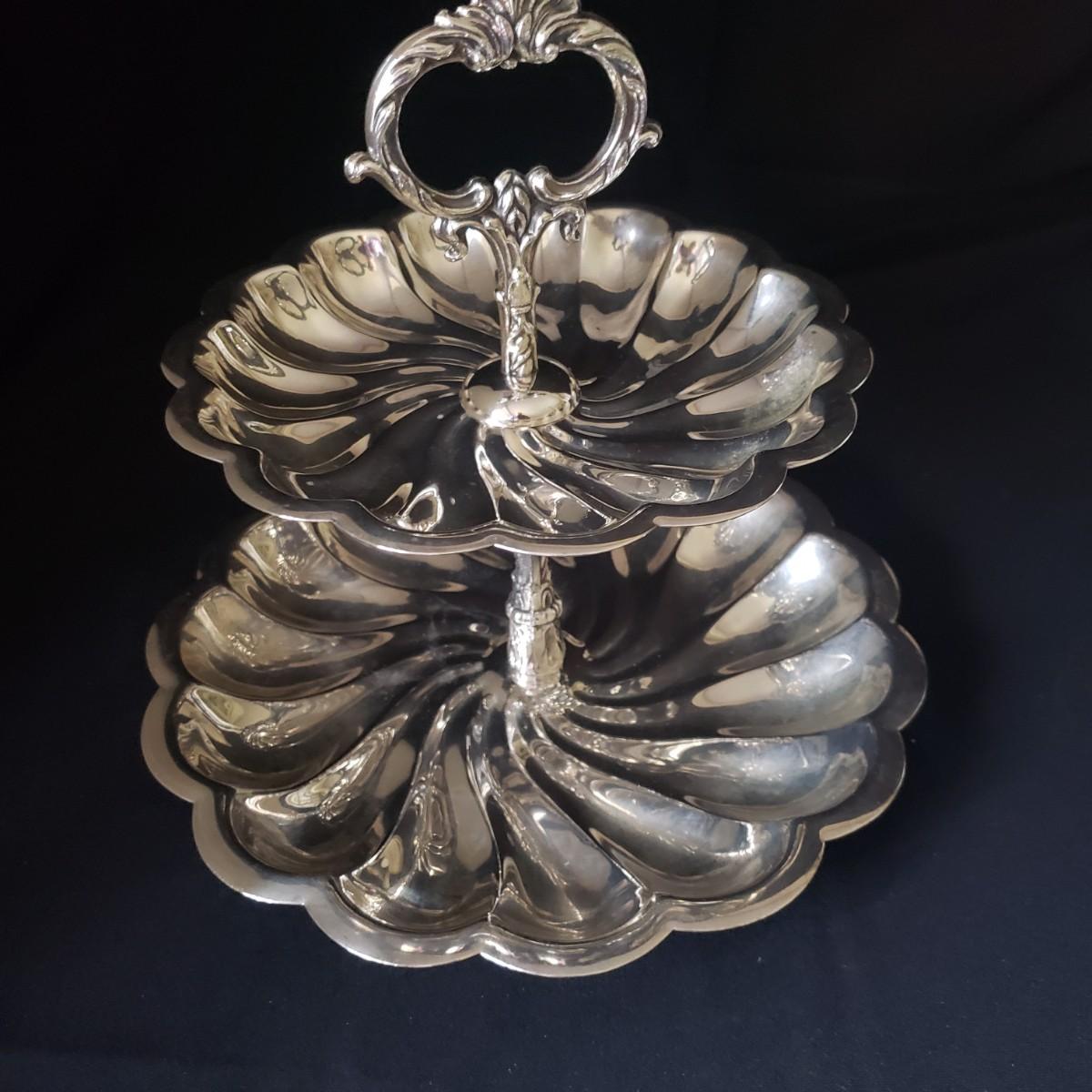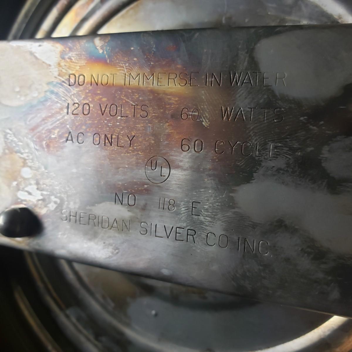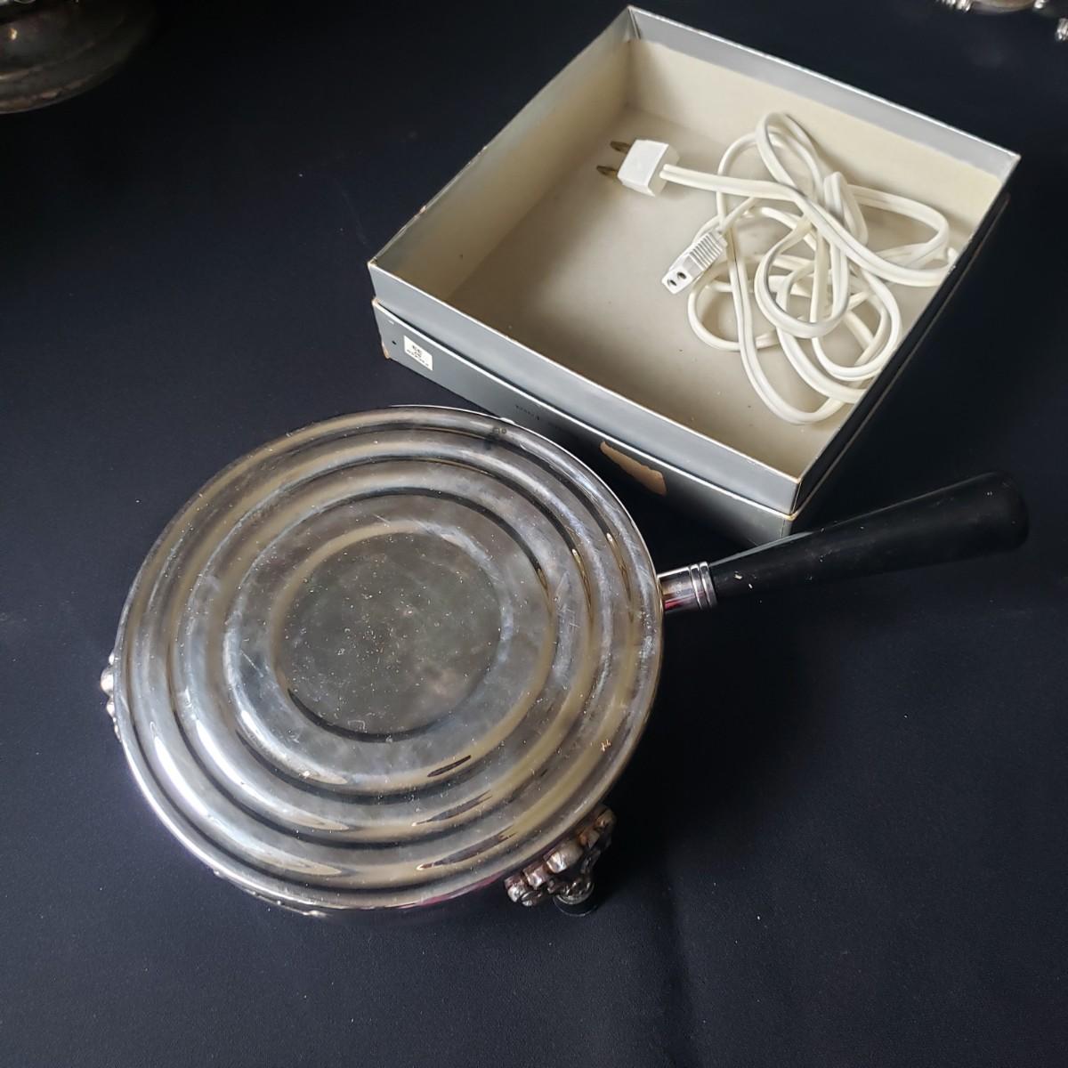 You will be the hit of the town using this serving set at your next party! This 12-item lot has a dual butter/relish dish, heated trivet that heats up when plugged in and a flip top sugar cube dish. The gravy boat measures 9" x 6" x 4"H and is made by Towle. The two-tiered dish made by F.B. Rogers breaks down for easy storage. The last pair of identical serving platters measure 16" x 16".