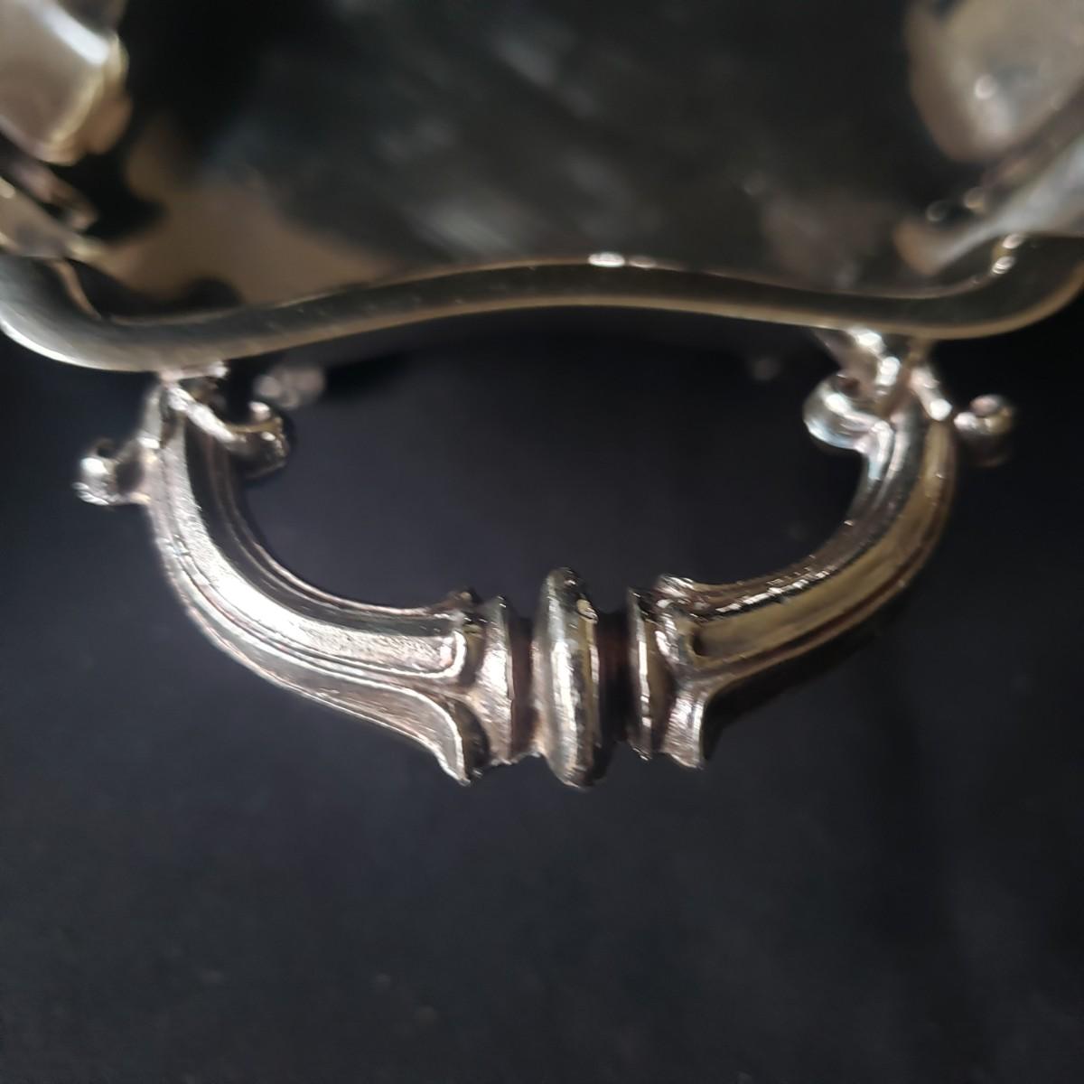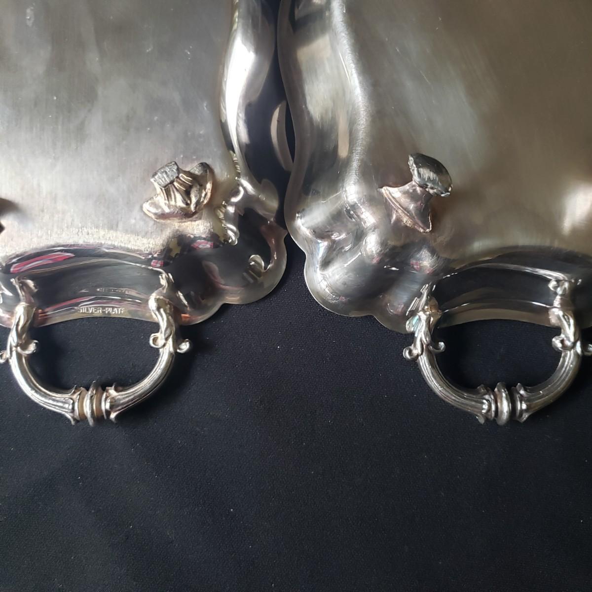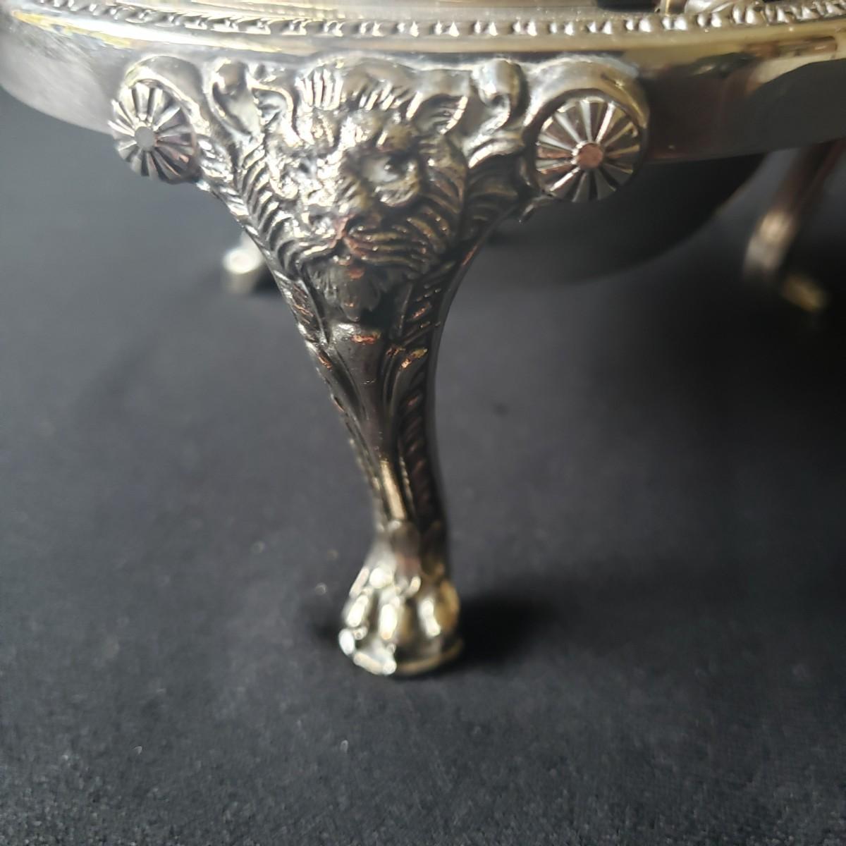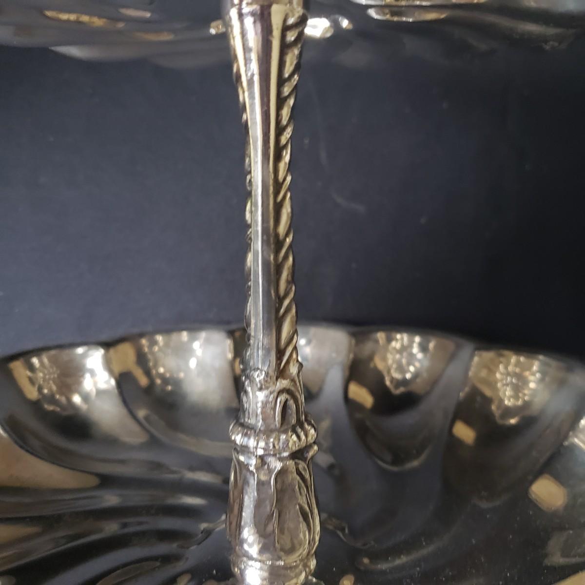 You will be the hit of the town using this serving set at your next party! This 12-item lot has a dual butter/relish dish, heated trivet that heats up when plugged in and a flip top sugar cube dish. The gravy boat measures 9" x 6" x 4"H and is made by Towle. The two-tiered dish made by F.B. Rogers breaks down for easy storage. The last pair of identical serving platters measure 16" x 16".