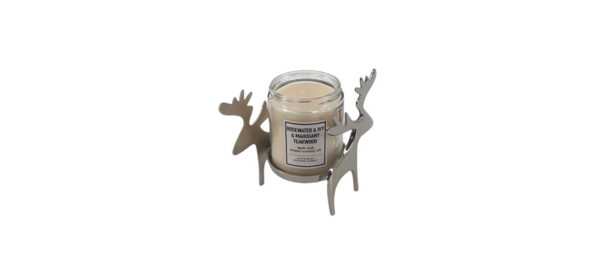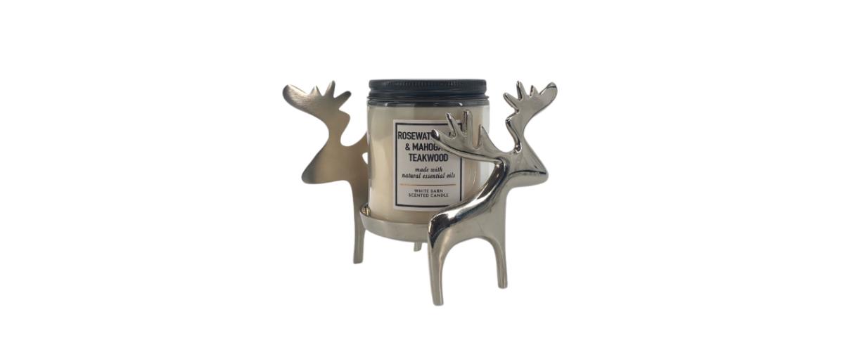 Silver reindeer candle holder by Crate & Barrel. Fits Bath & Body Works single wick candles or similar size. Total piece measures 6” x 4” x 4.5”. Candle not included.