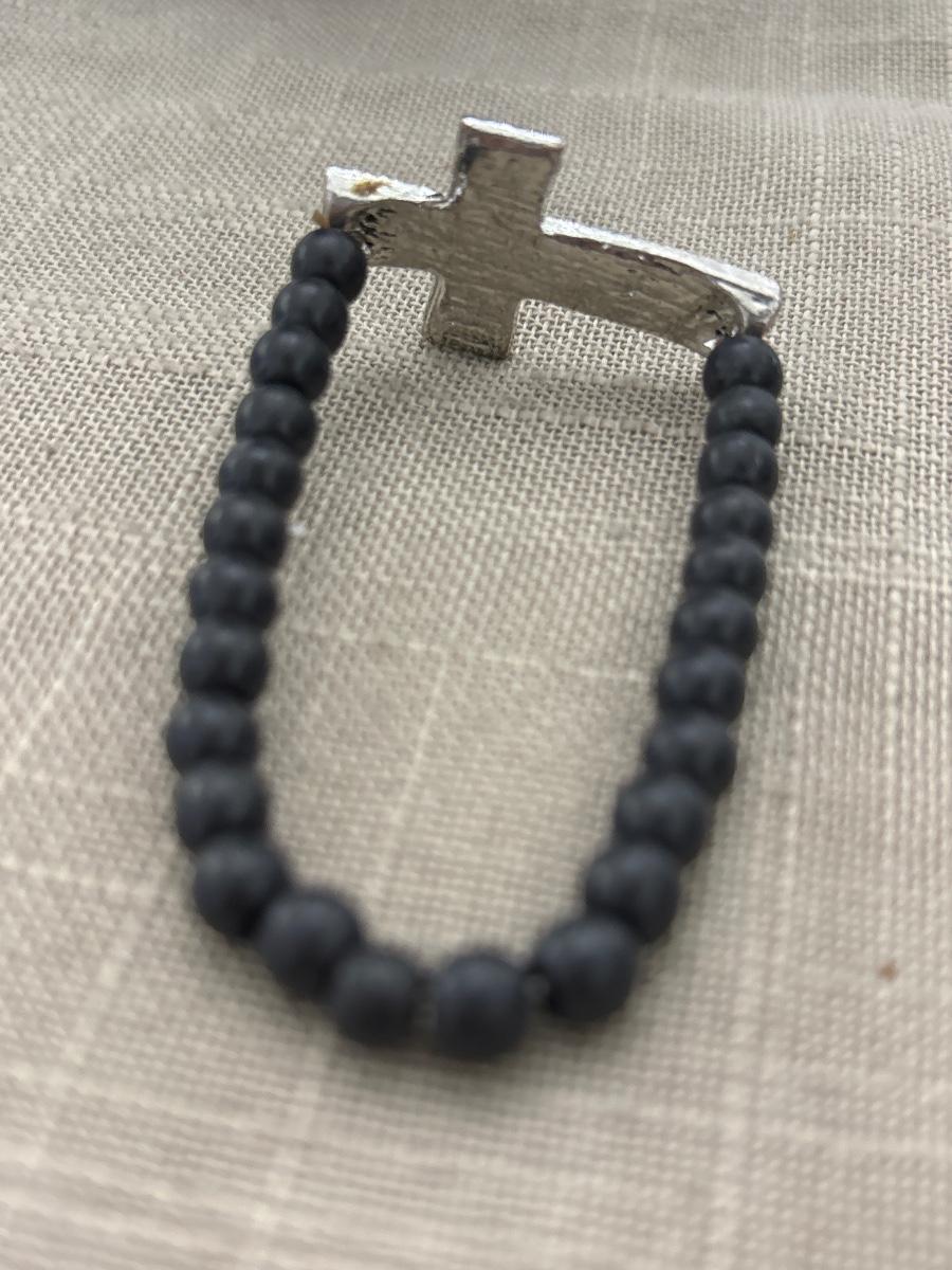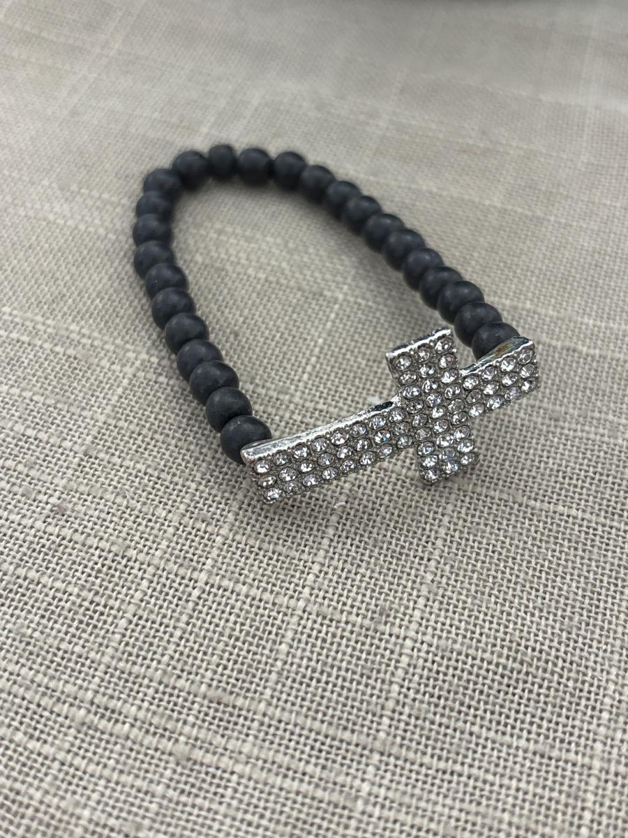 Silver rhinestone cross black beaded stretchy bracelet