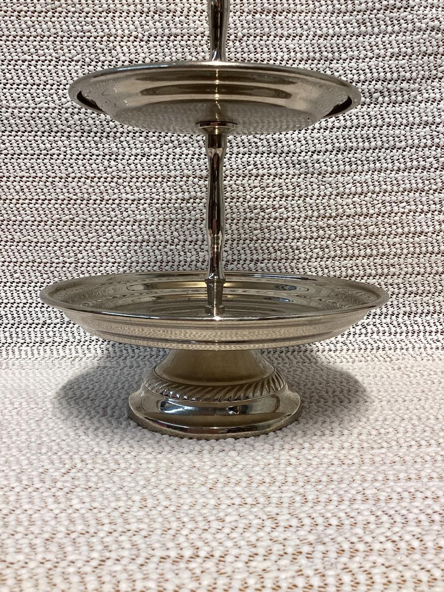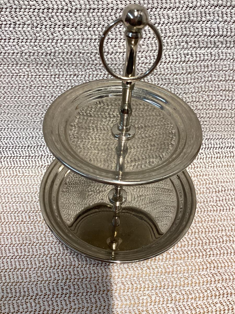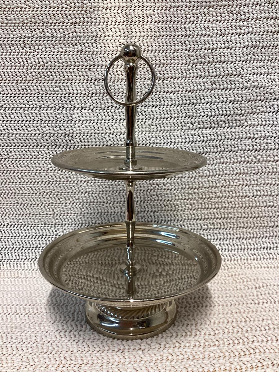 silver round 2-tier tray made of classic stainless steel.