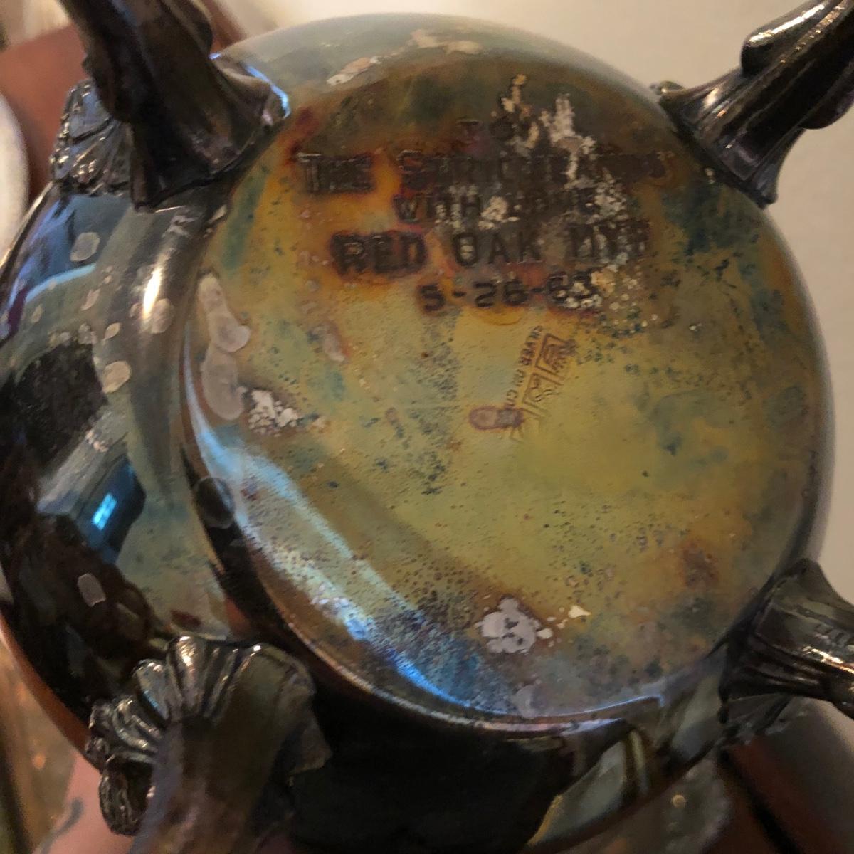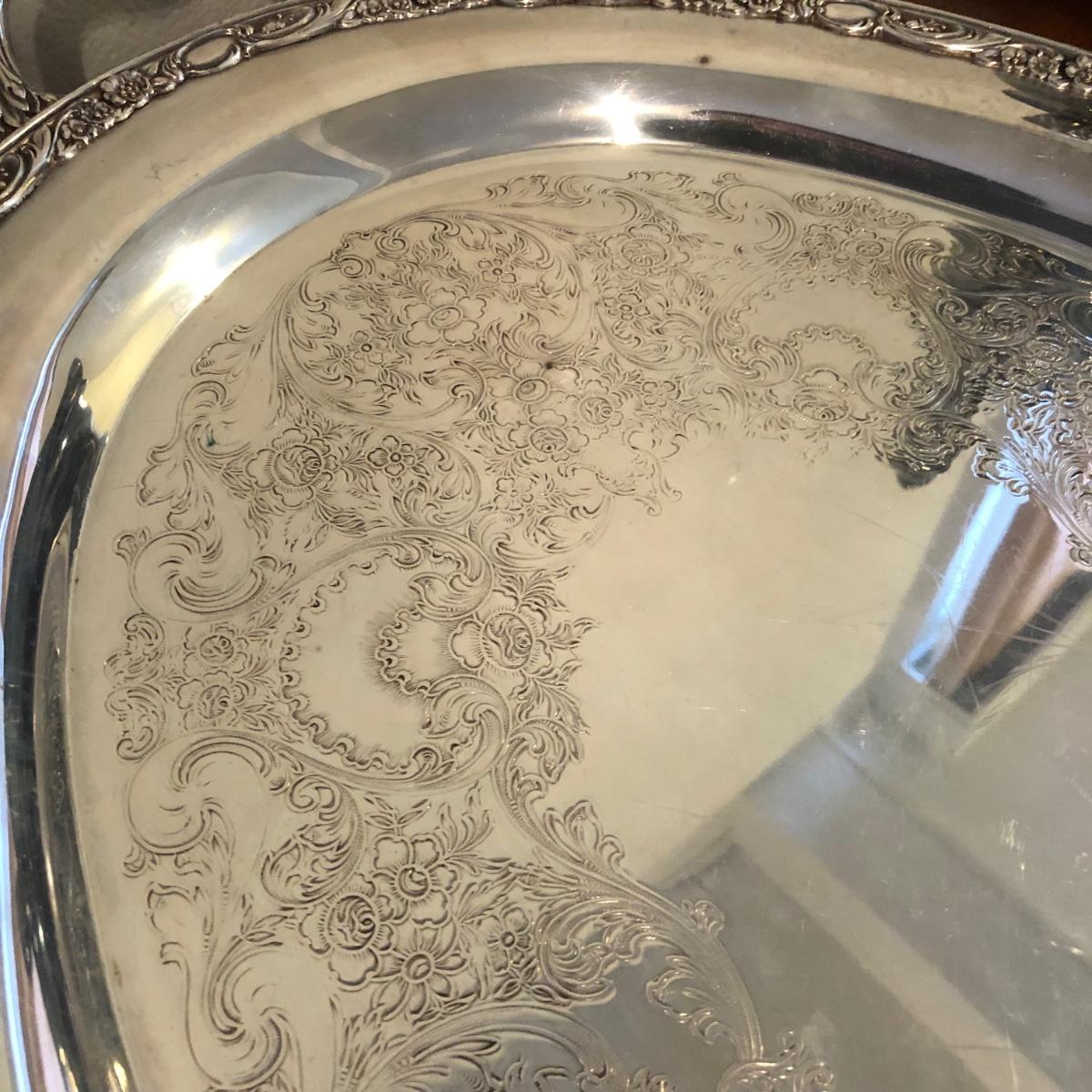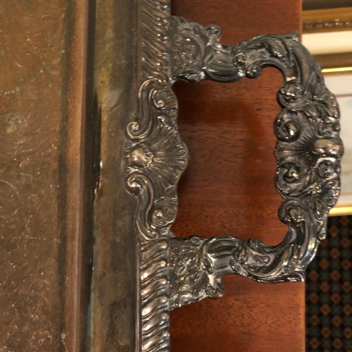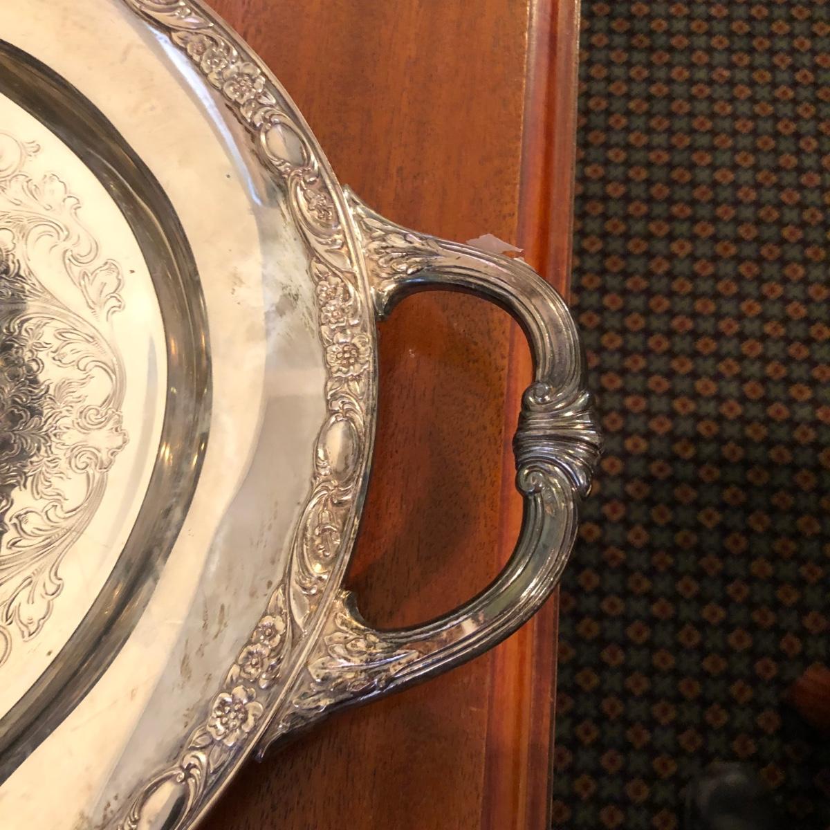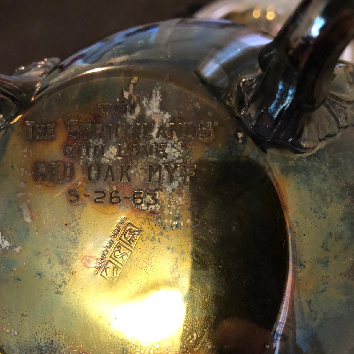 This assortment of silver-plated serving platters and more have stamps on their bases with “silver over copper” and one that has “409” scratched into the surface with no other markings, as pictured. The set includes a pitcher, two trays, a scalloped bowl. Some of these pieces are inscribed with personalized messages on the top or bottom. The rectangular tray measures 15.5” x 24” x 2.5” and the pitcher measures 6” x 10” x 5.5”. Shipping available.