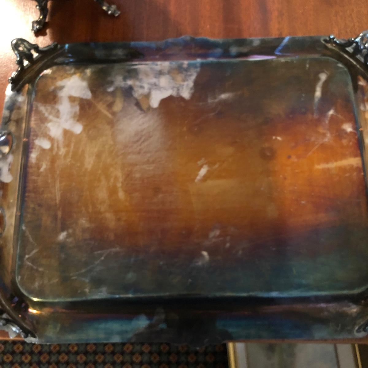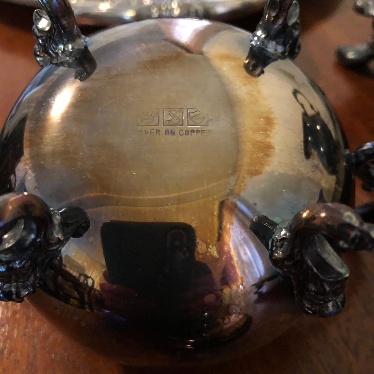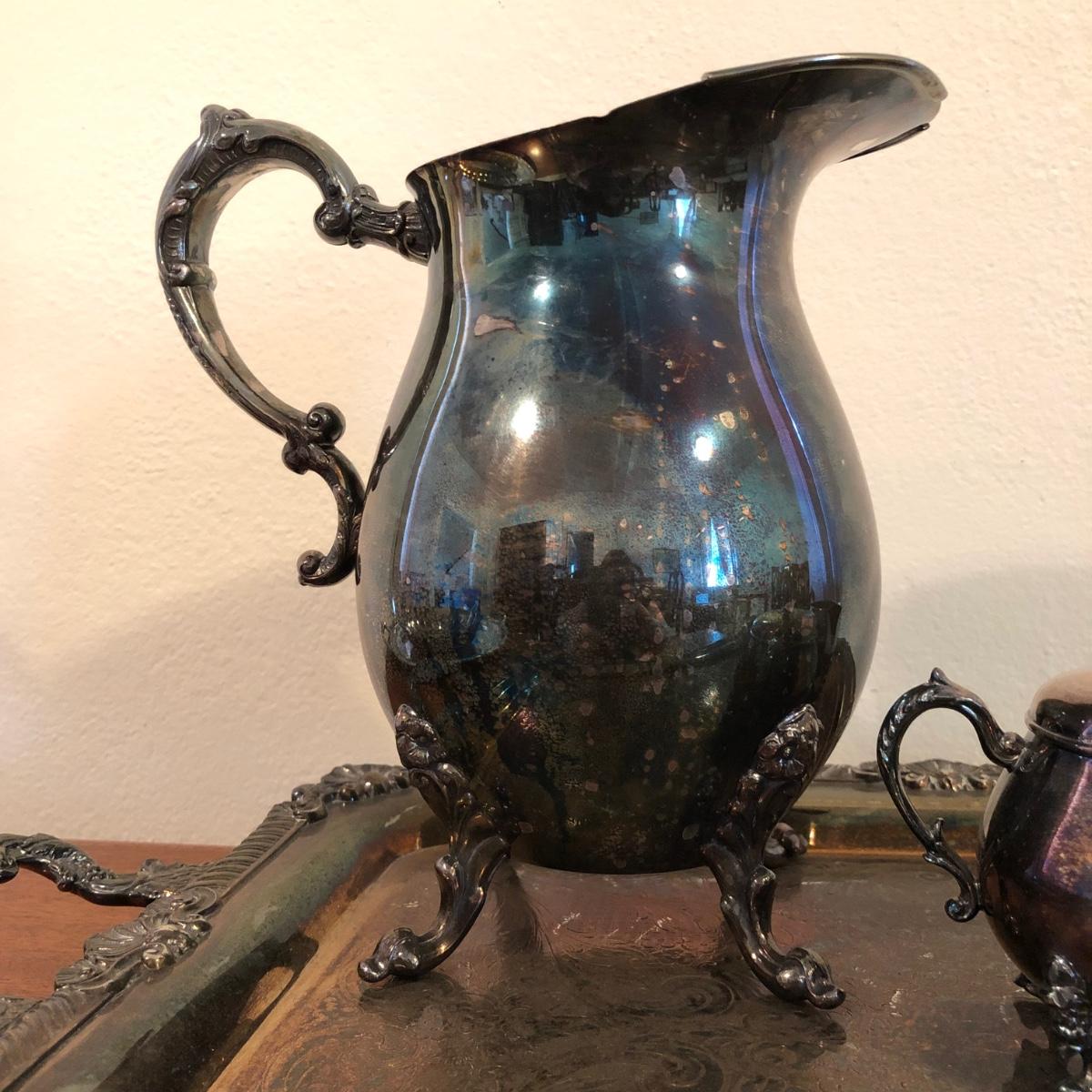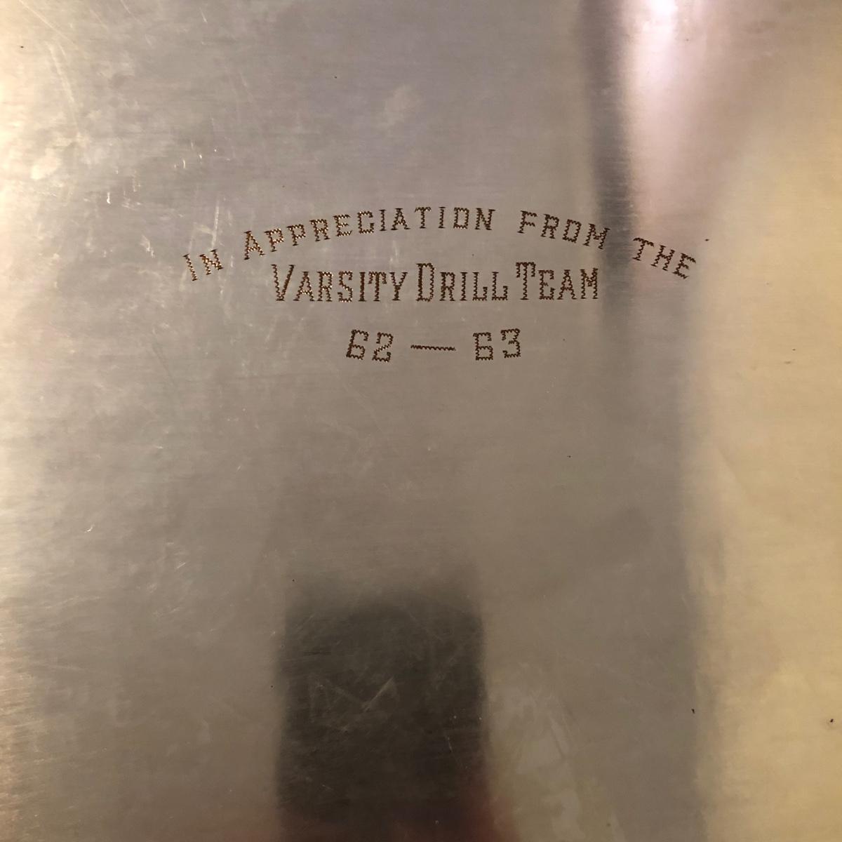 This assortment of silver-plated serving platters and more have stamps on their bases with “silver over copper” and one that has “409” scratched into the surface with no other markings, as pictured. The set includes a pitcher, two trays, a scalloped bowl. Some of these pieces are inscribed with personalized messages on the top or bottom. The rectangular tray measures 15.5” x 24” x 2.5” and the pitcher measures 6” x 10” x 5.5”. Shipping available.