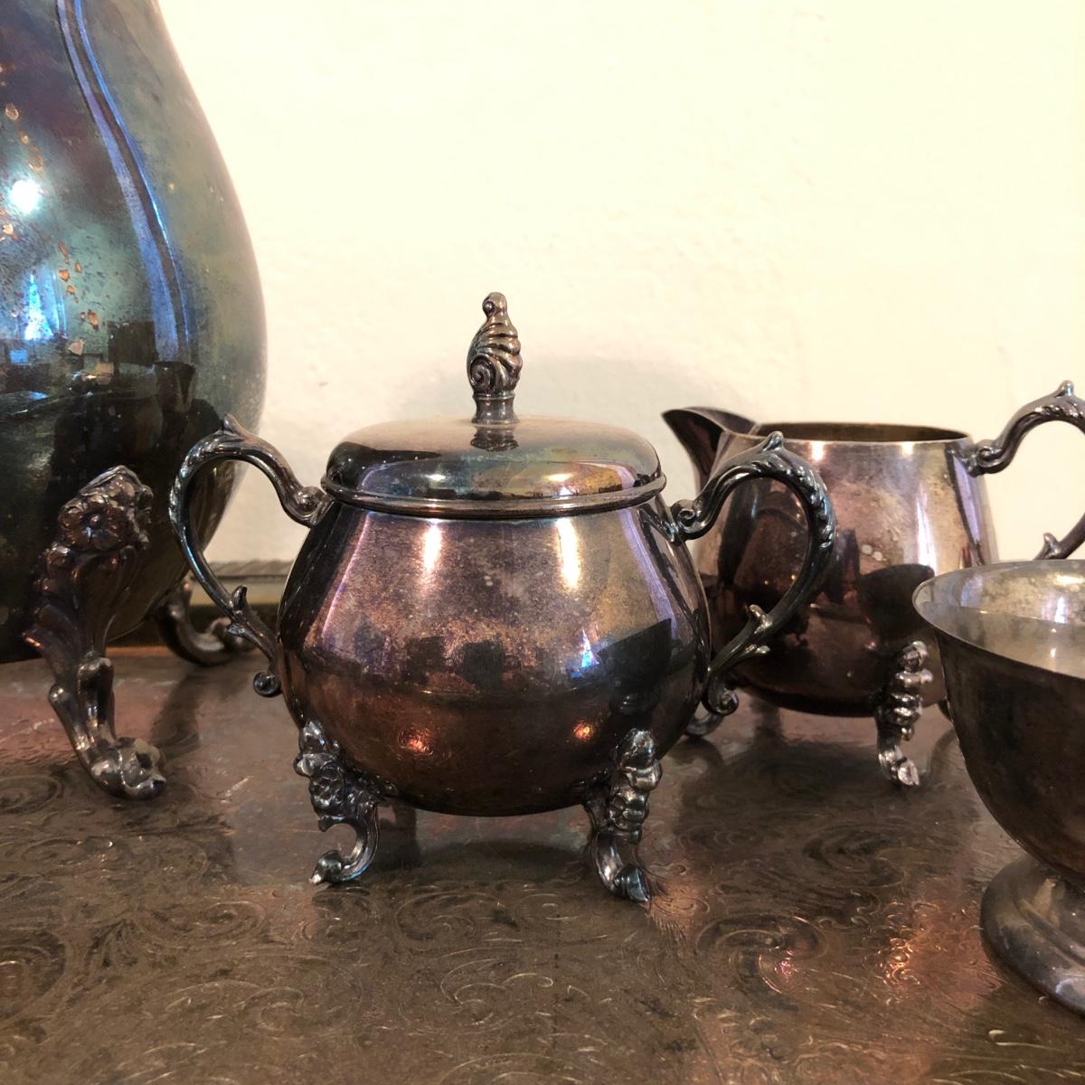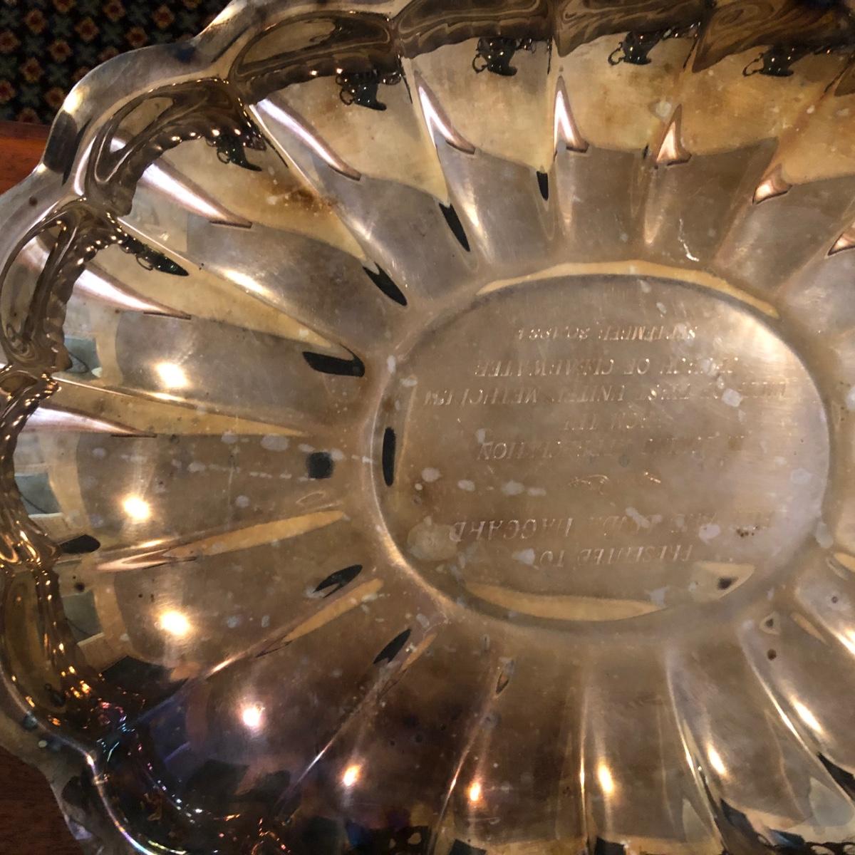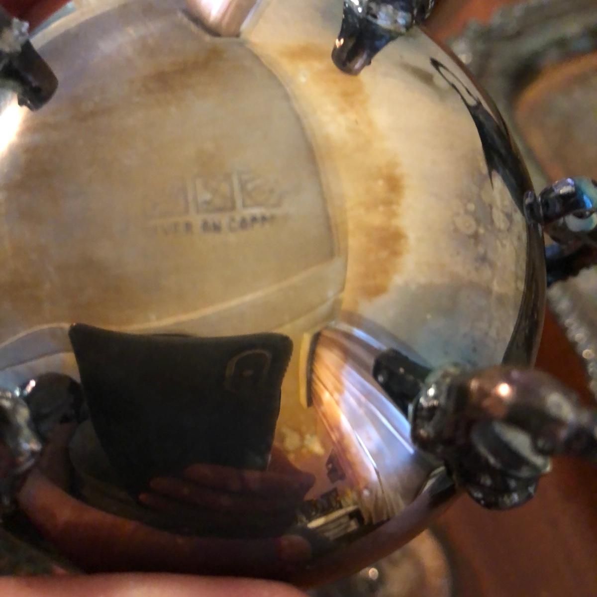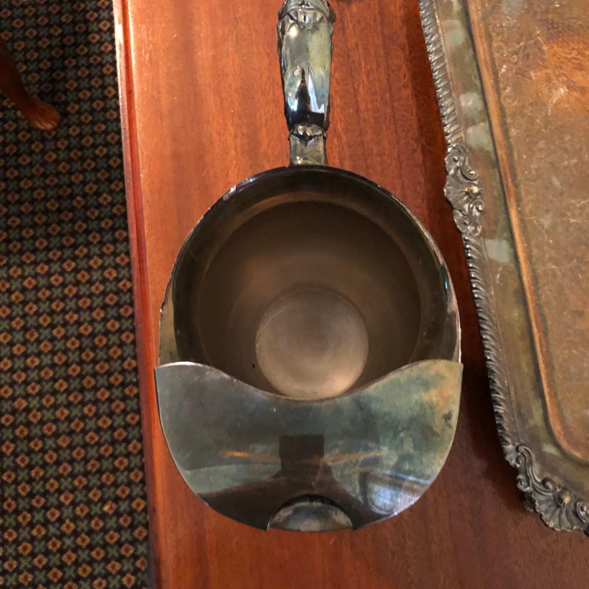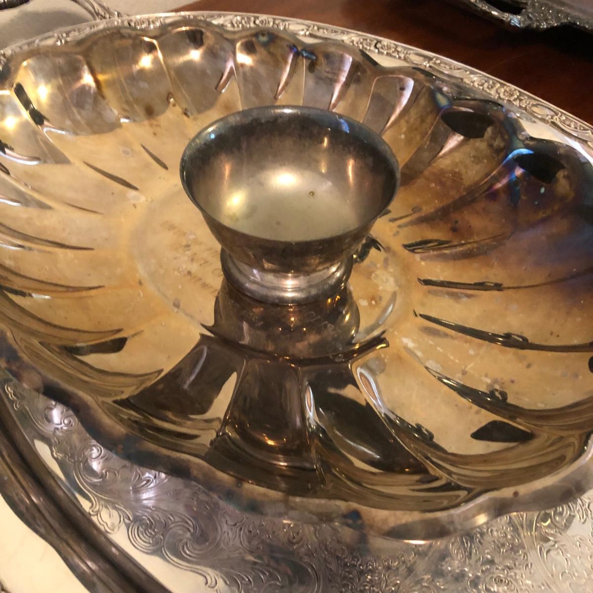 This assortment of silver-plated serving platters and more have stamps on their bases with “silver over copper” and one that has “409” scratched into the surface with no other markings, as pictured. The set includes a pitcher, two trays, a scalloped bowl. Some of these pieces are inscribed with personalized messages on the top or bottom. The rectangular tray measures 15.5” x 24” x 2.5” and the pitcher measures 6” x 10” x 5.5”. Shipping available.