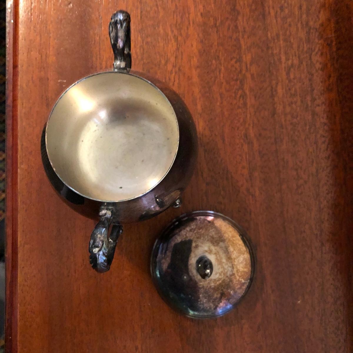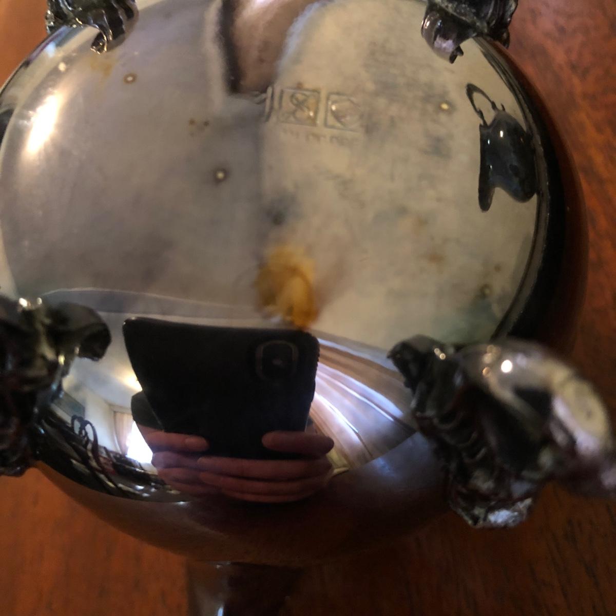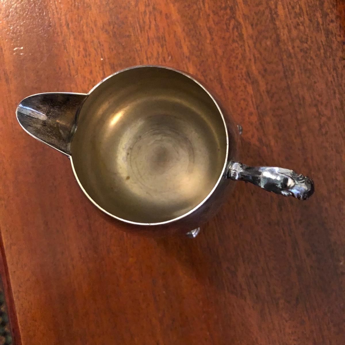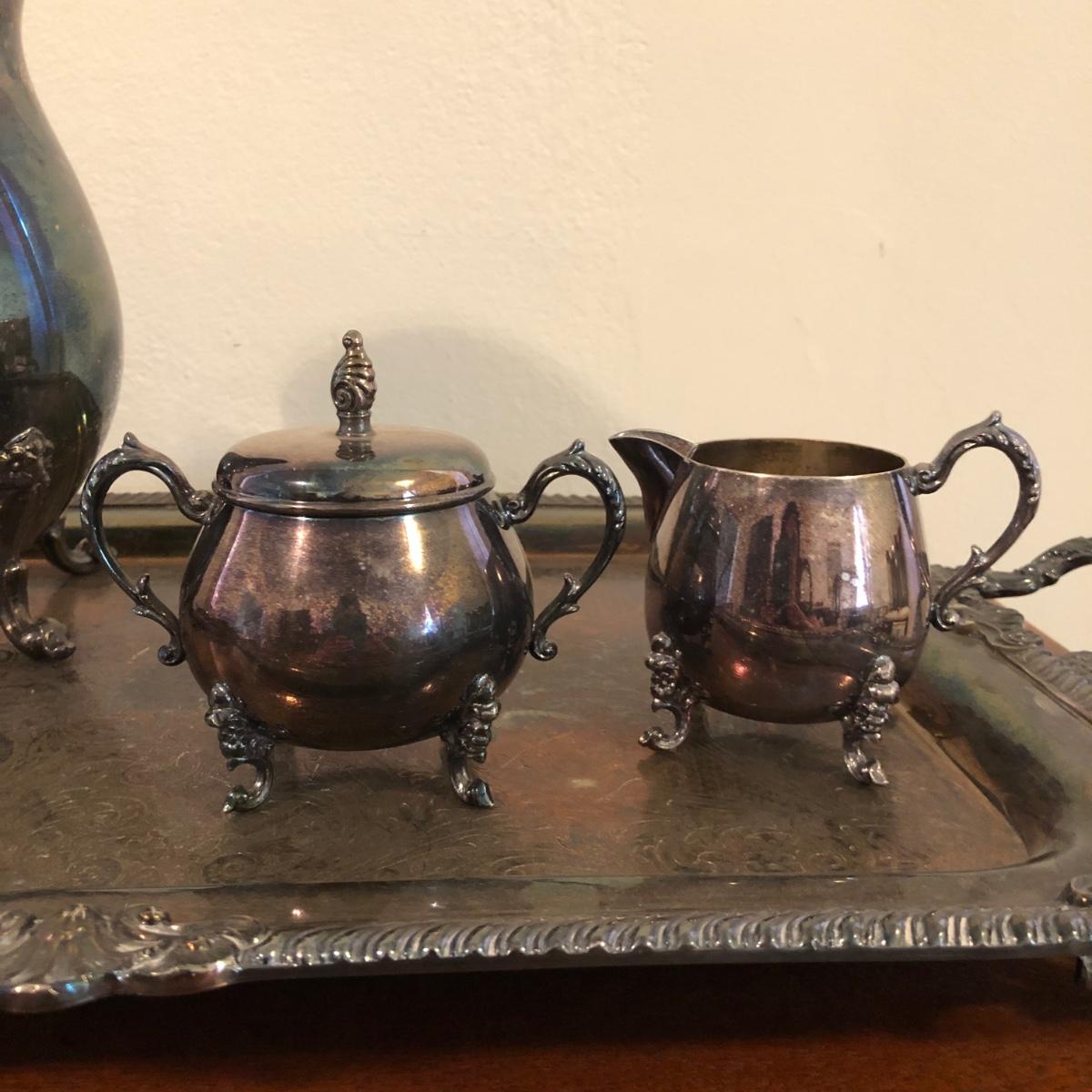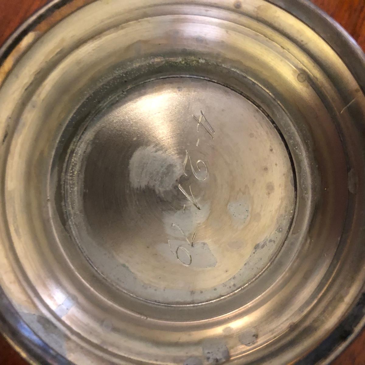 This assortment of silver-plated serving platters and more have stamps on their bases with “silver over copper” and one that has “409” scratched into the surface with no other markings, as pictured. The set includes a pitcher, two trays, a scalloped bowl. Some of these pieces are inscribed with personalized messages on the top or bottom. The rectangular tray measures 15.5” x 24” x 2.5” and the pitcher measures 6” x 10” x 5.5”. Shipping available.