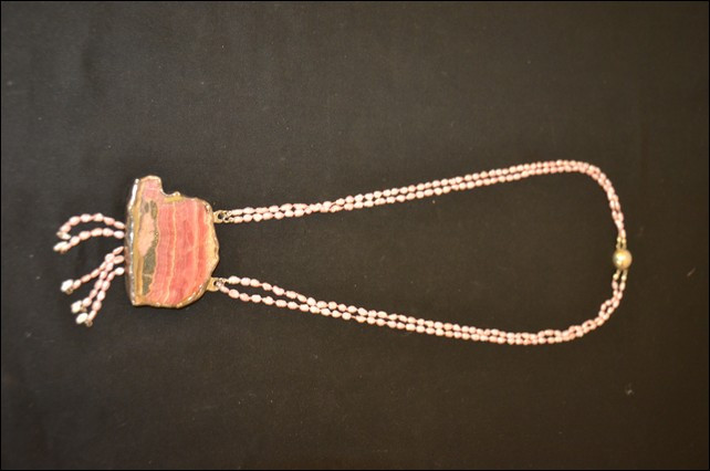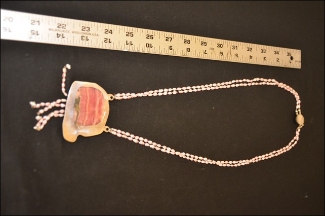silver, seed pearl and pink agate necklace made by Joan Schwartz, 26" long plus the pendant which measures 2.5 by 2"