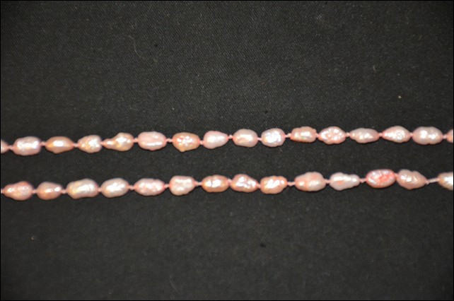 silver, seed pearl and pink agate necklace made by Joan Schwartz, 26" long plus