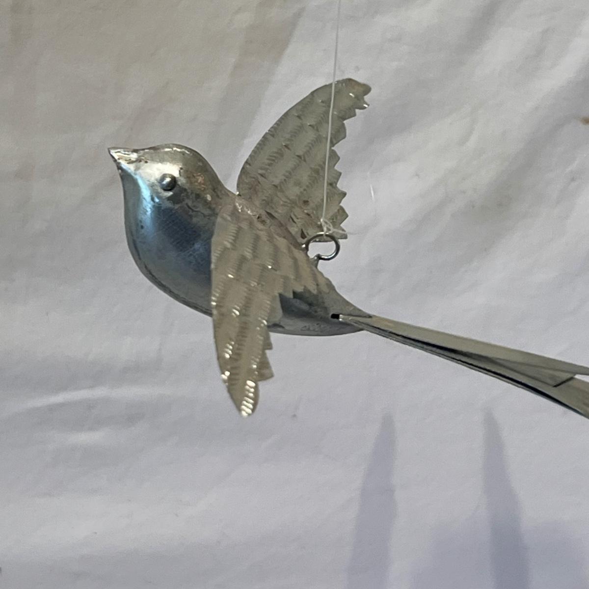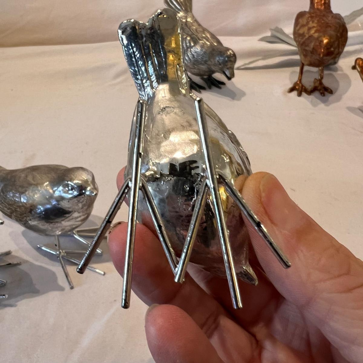 Ten plus adorable metal bird figurines. One set of three are lacquered silver plate sparrows made in India. The other three silver colored birds are metal as are the gold/bronze colored set. One aluminum bird has fishing wire to hang.