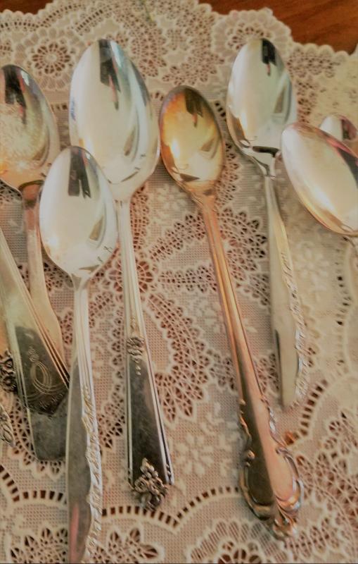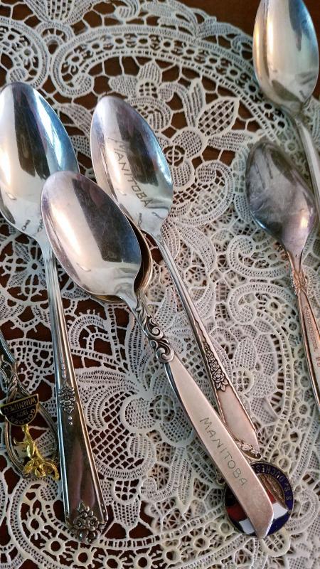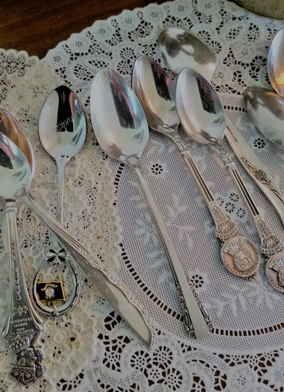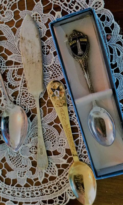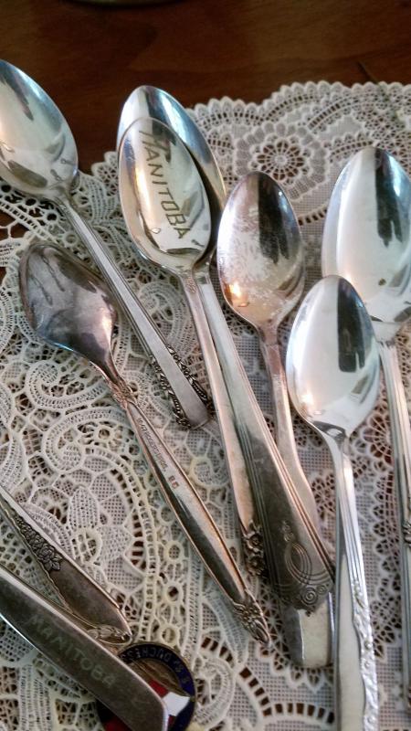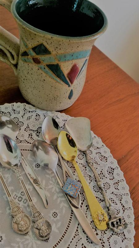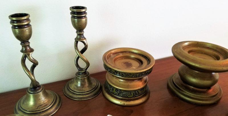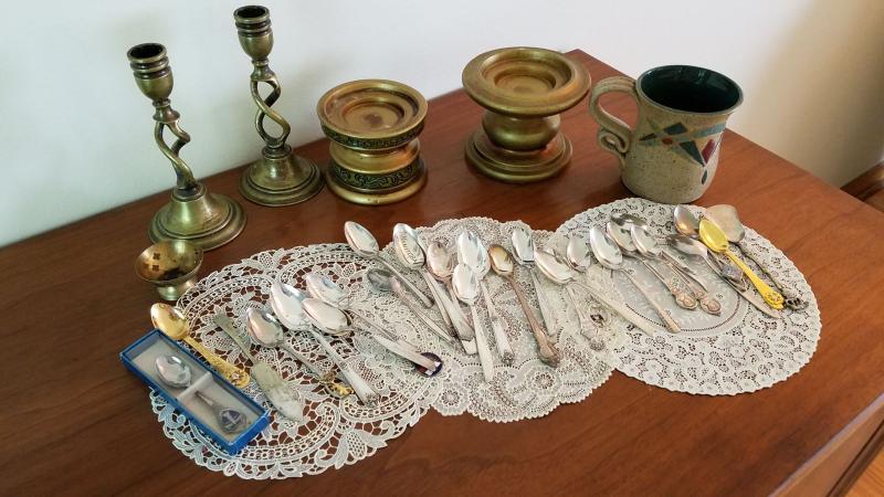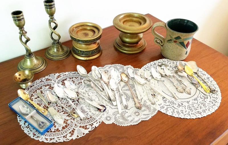 Pottery and Brass Candlesticks with Silver Spoons the large wide candle holders are not metal