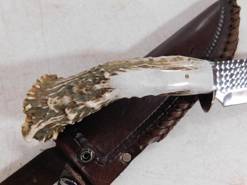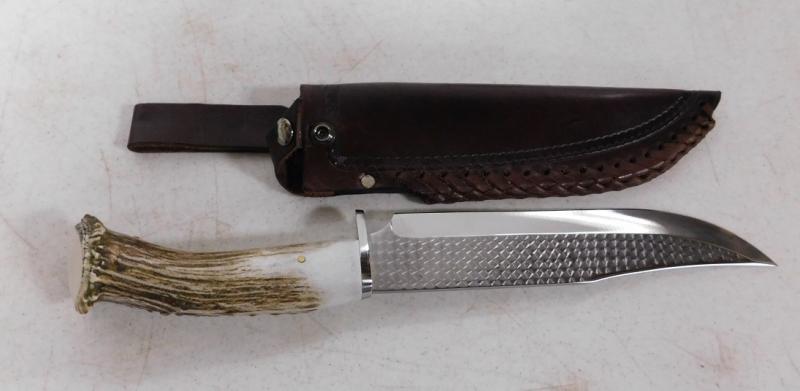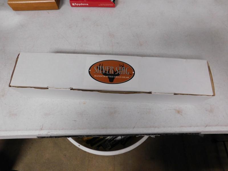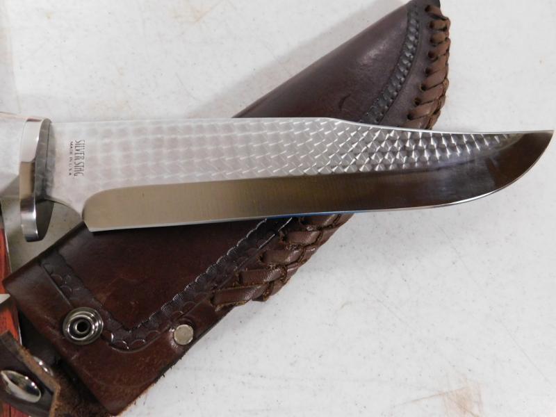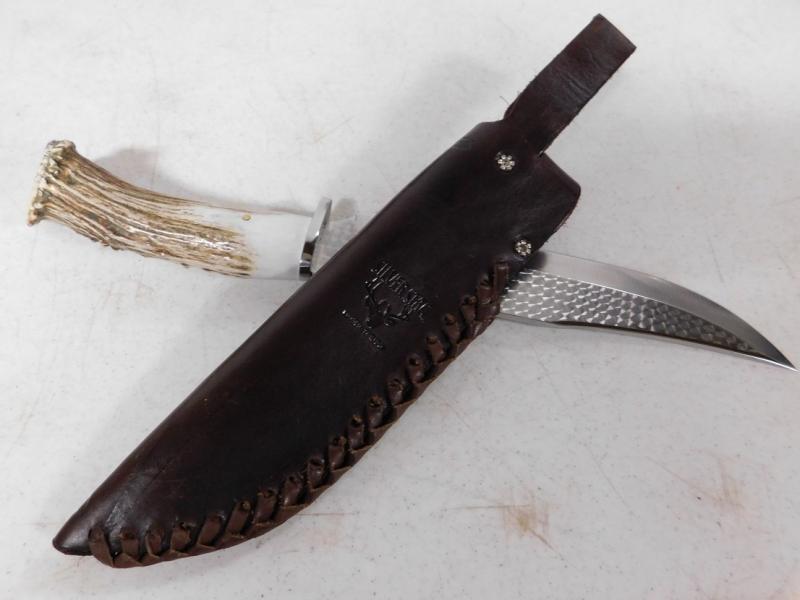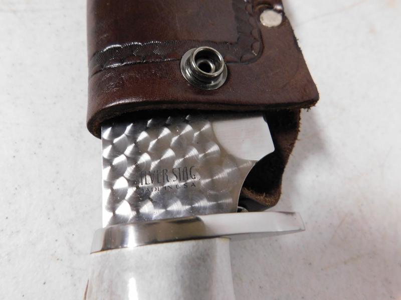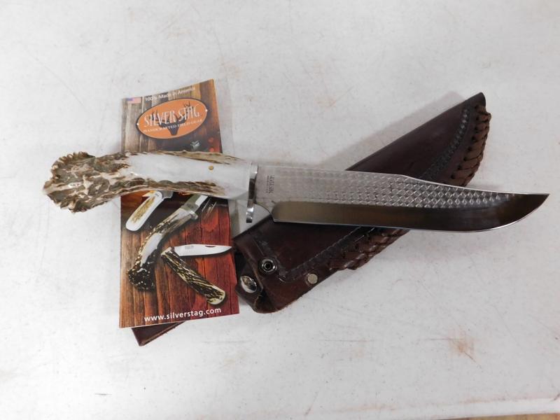 Silver Stag Buck Style Knife with Damascus Blade and Deer Antler Handle. New in the box with paper work. Leather sheath with Silver Stag Logo.