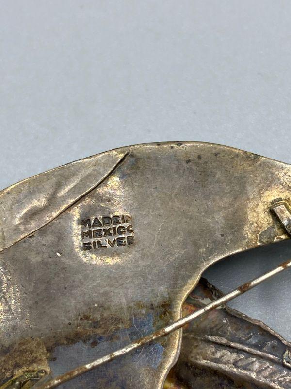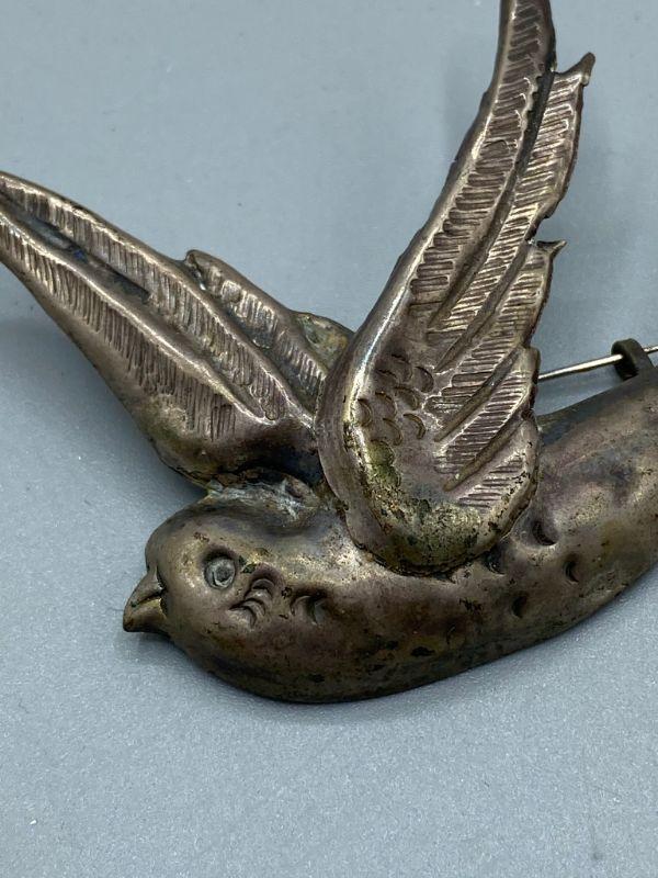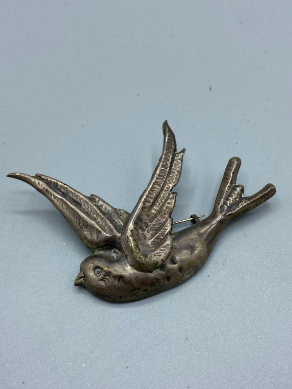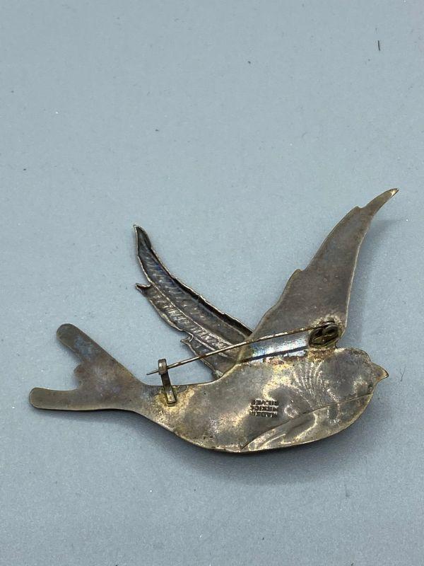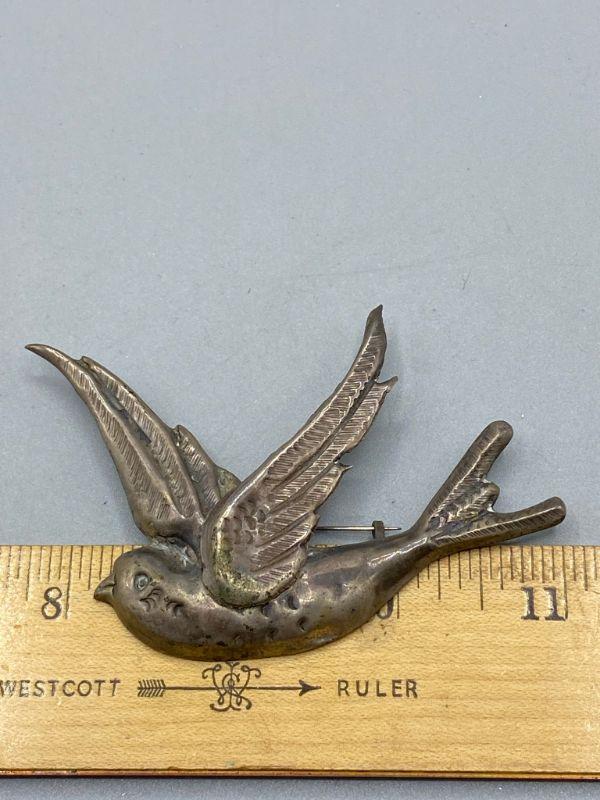 Made in Mexico, silver bird brooch, looks like a swallow. Hollow, light weight. Has a few minor dings. 3" size. Stamped on the back.