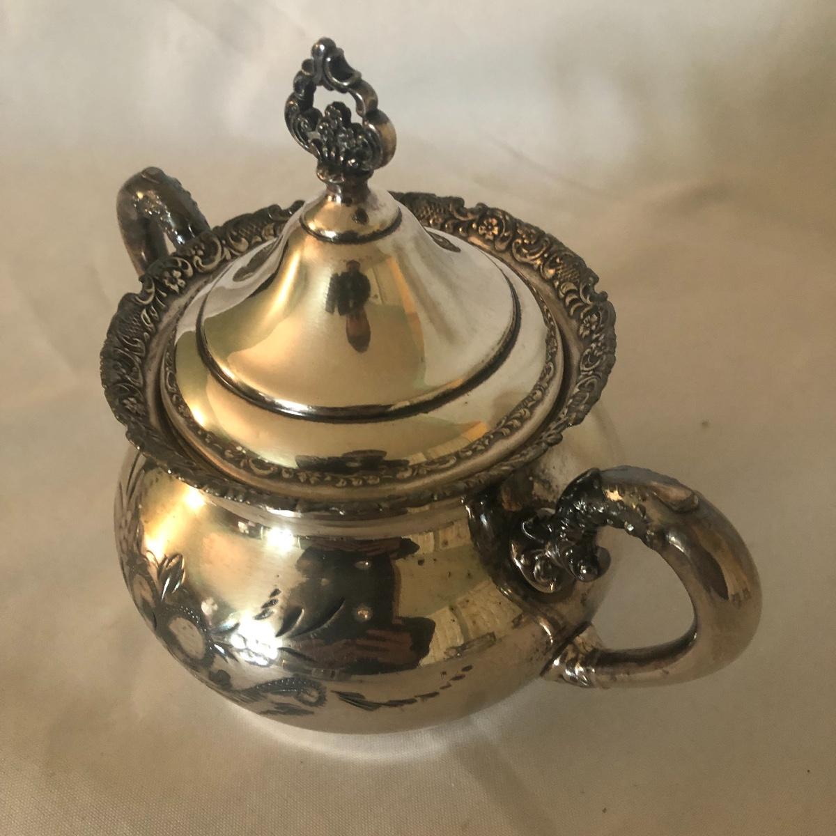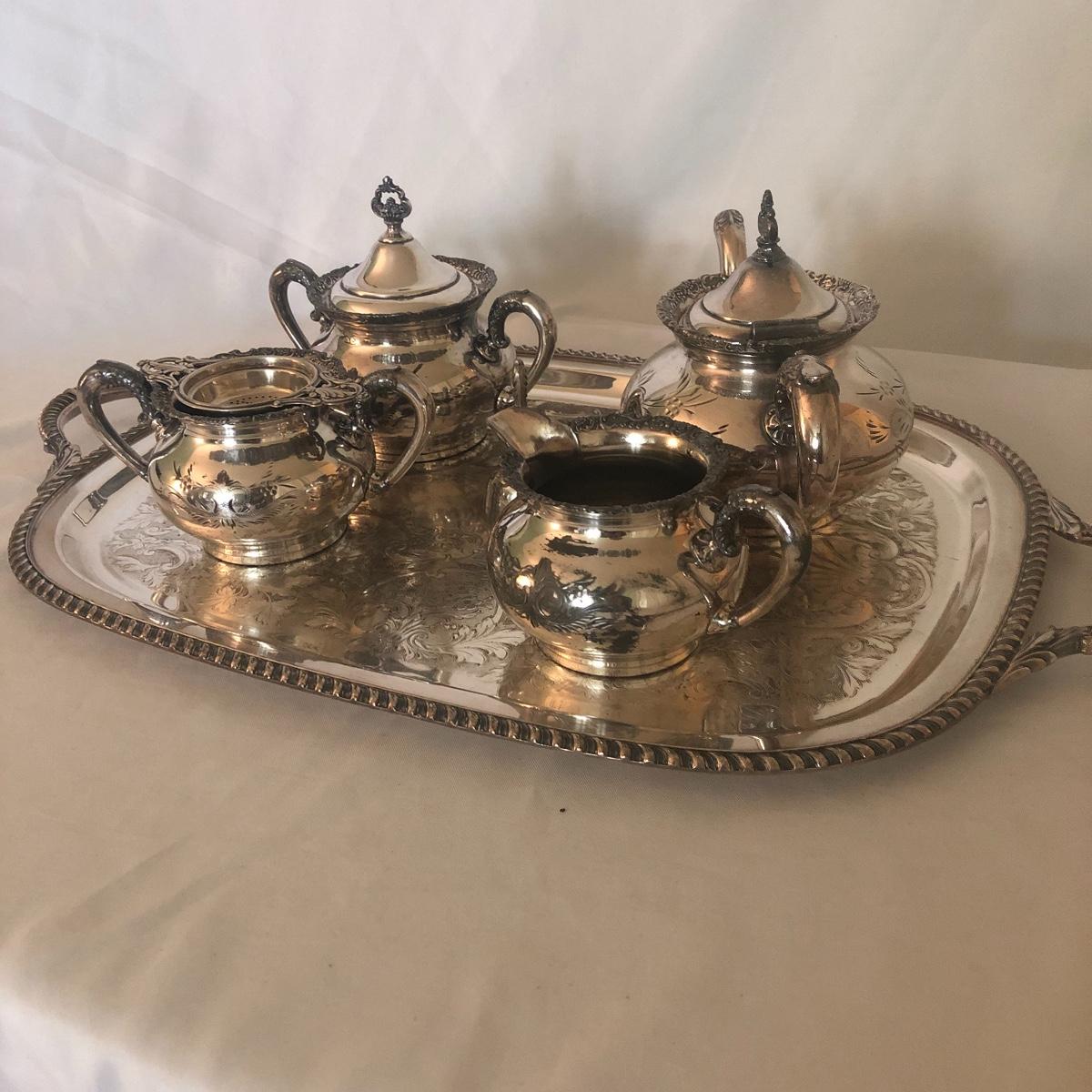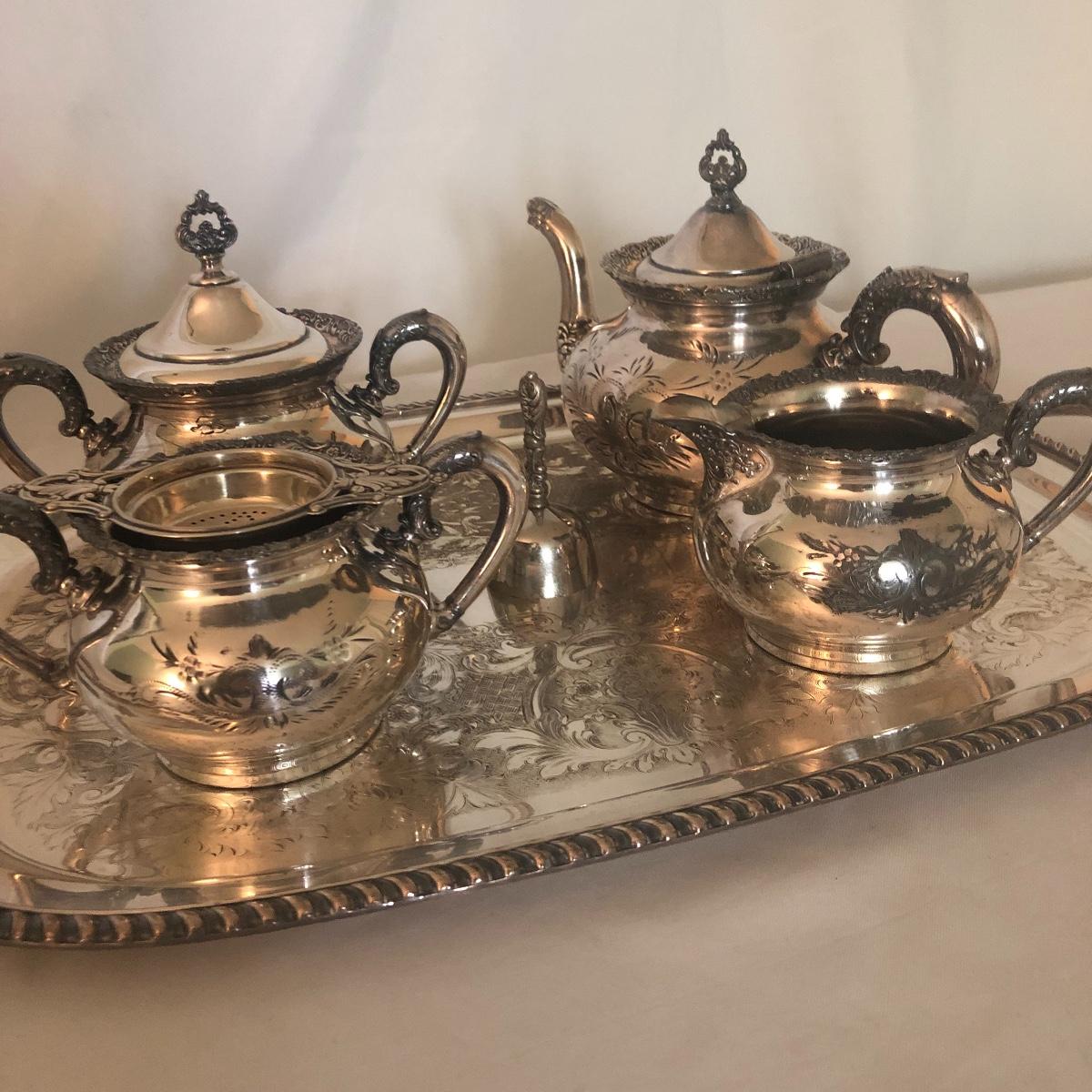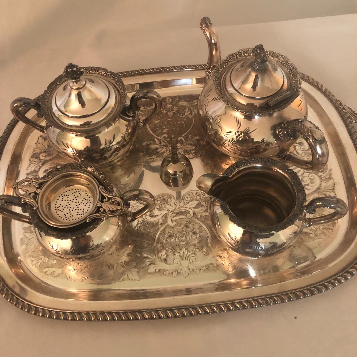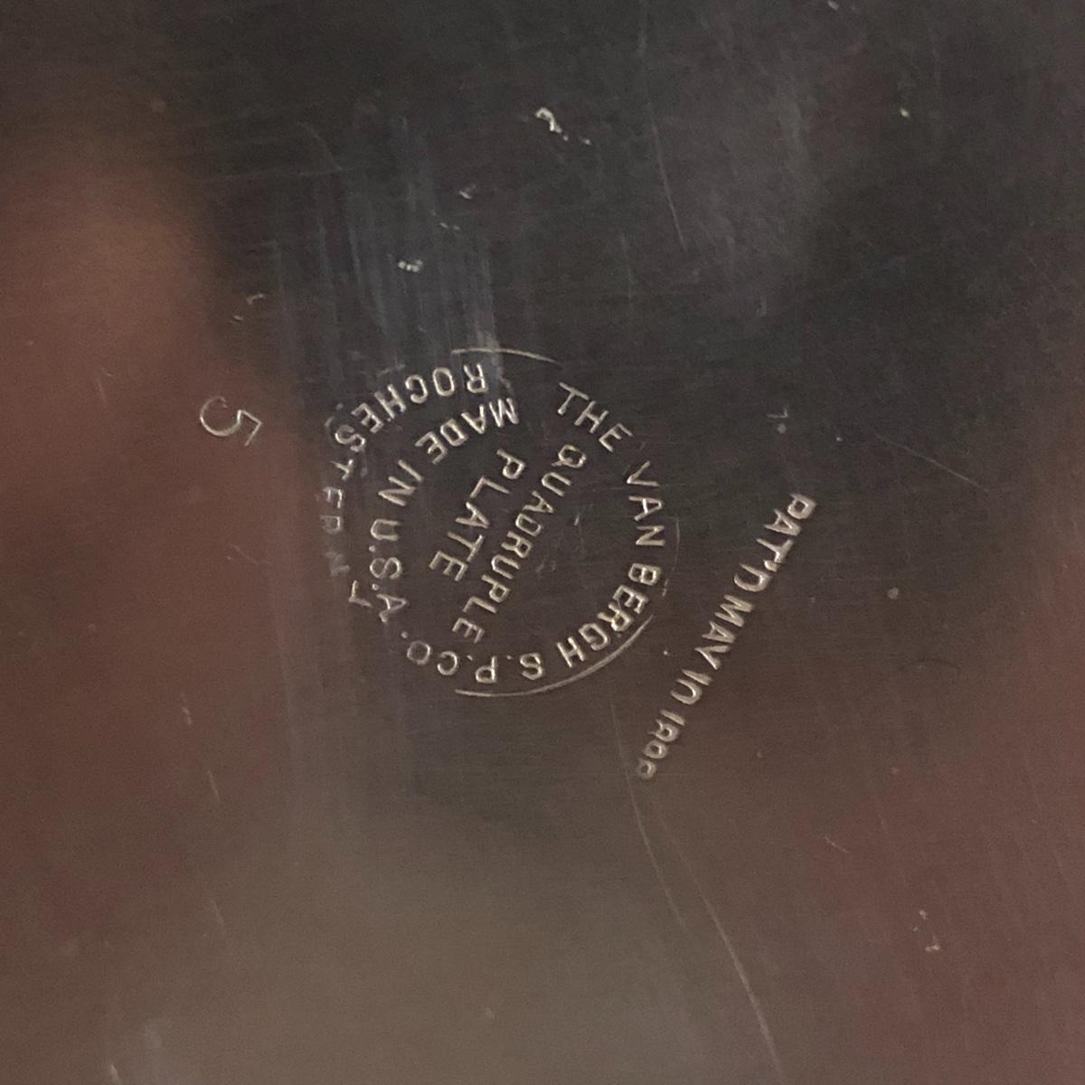 There are six pieces to this set: a tray, cream and sugar set, a teapot, a bell and lidded handled bowl. The bottom of the pieces read, “Patd May 10 1899” and “The Van Bergh S.P. Co. Rochester NY” and “Made in the U.S.A.” and “ Quadruple Plate.” Please note the blemishes on the pieces. The tray 23.5” x 14.5”. Shipping Available.