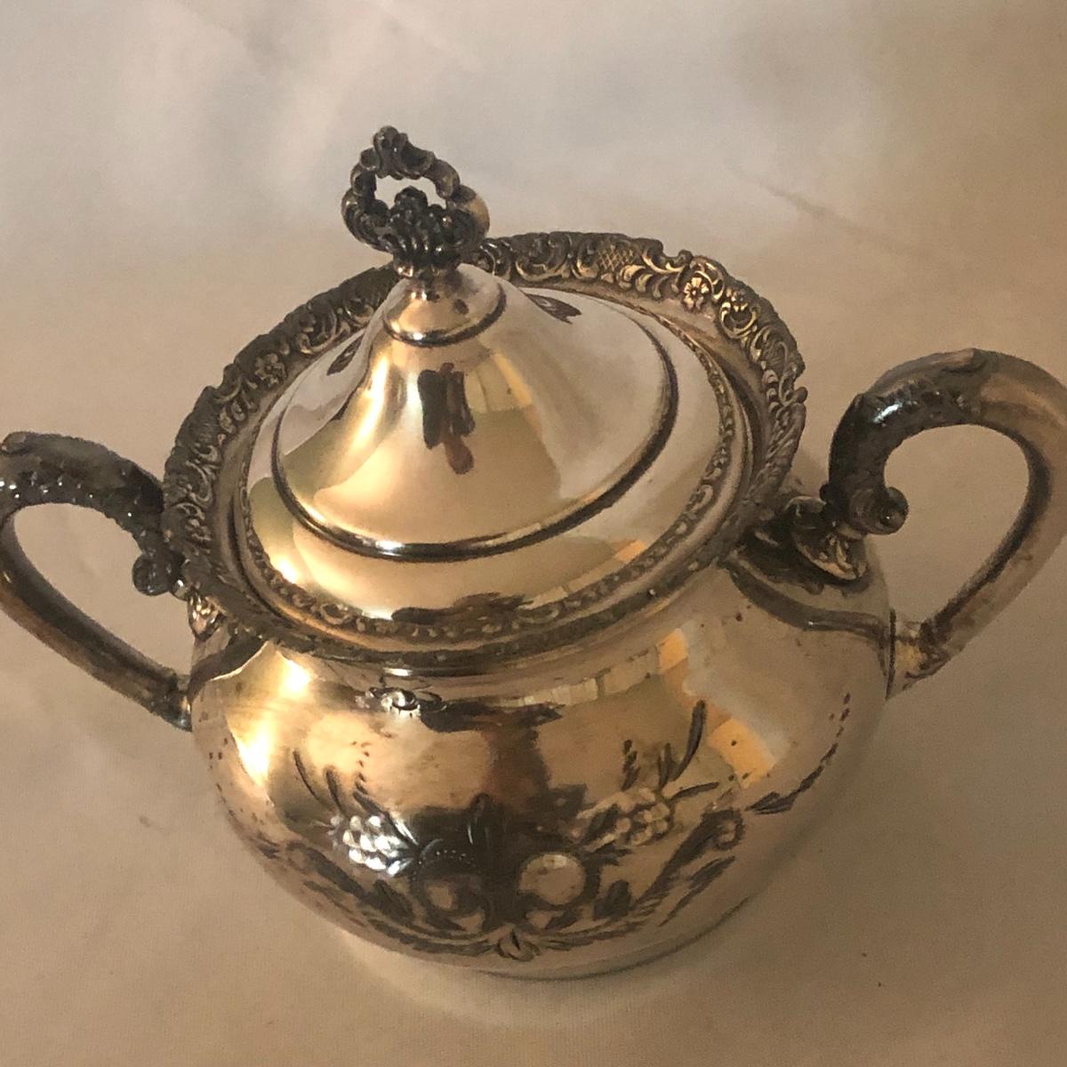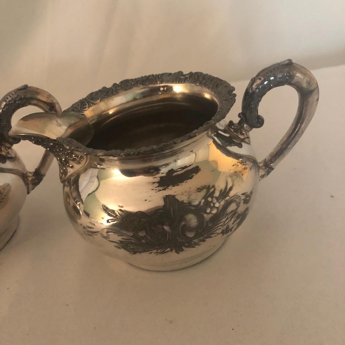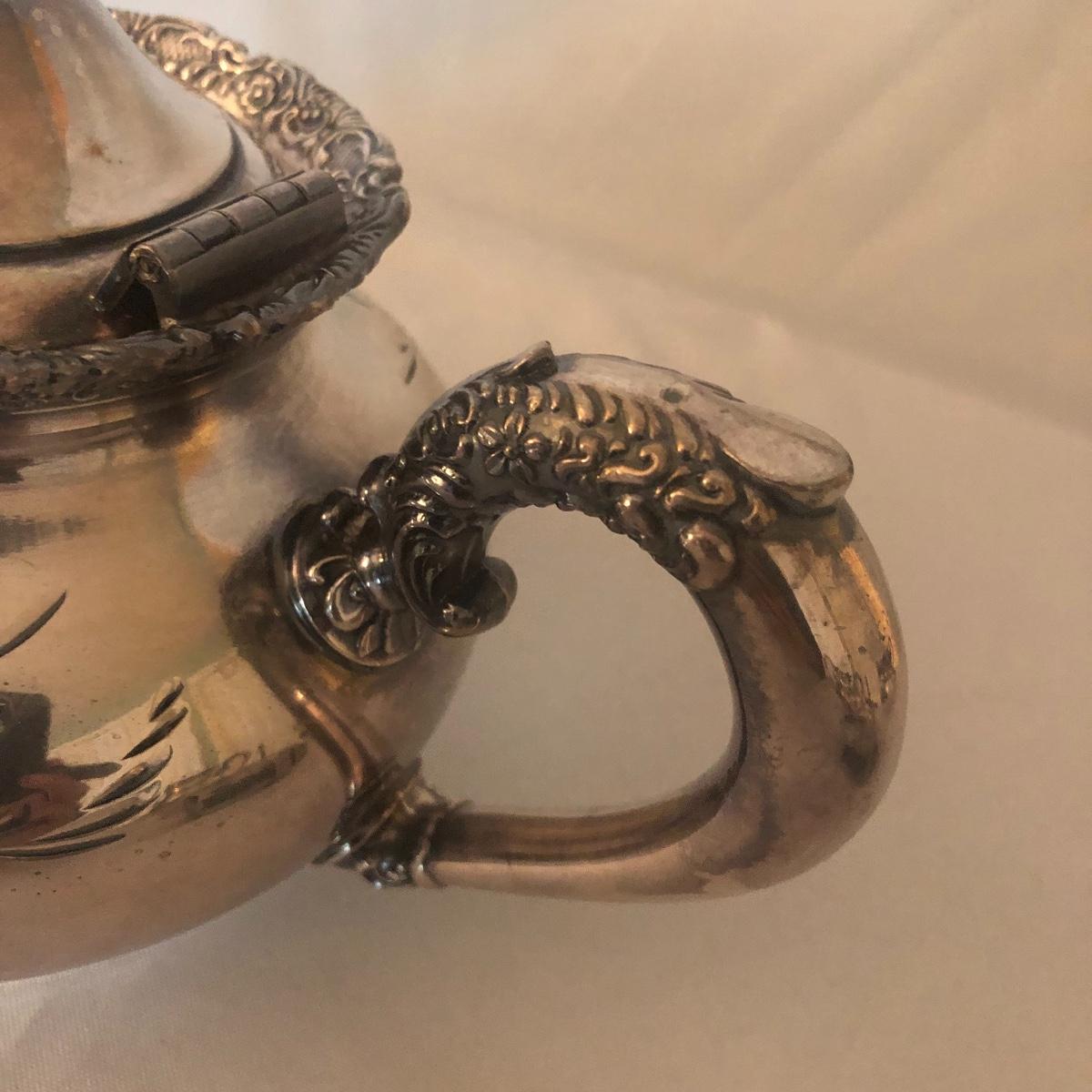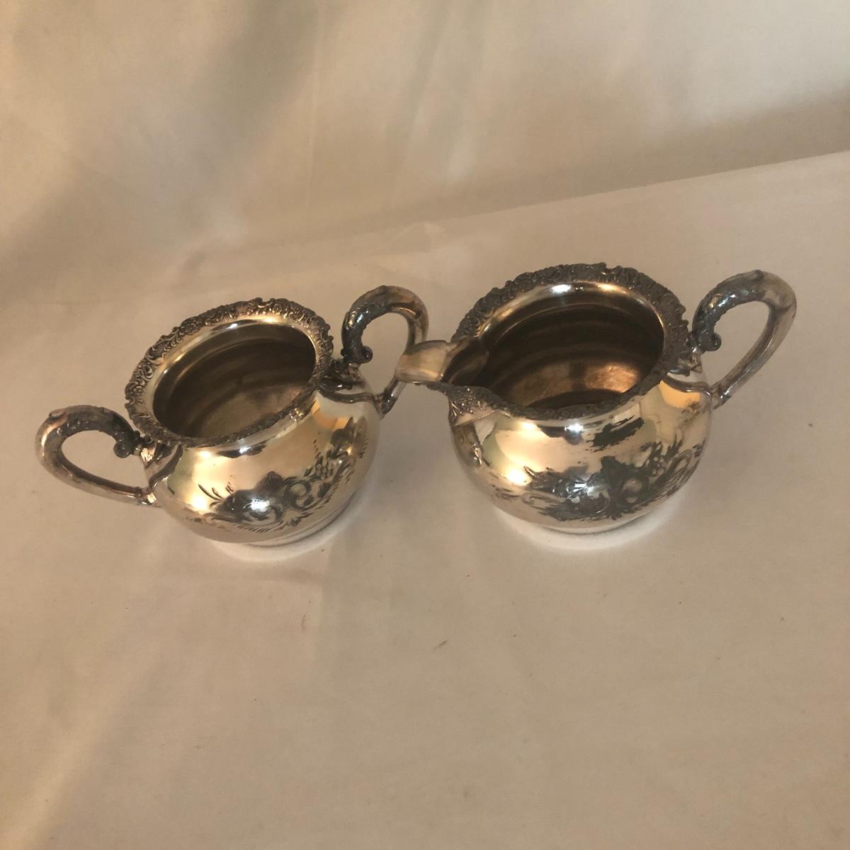 There are six pieces to this set: a tray, cream and sugar set, a teapot, a bell and lidded handled bowl. The bottom of the pieces read, “Patd May 10 1899” and “The Van Bergh S.P. Co. Rochester NY” and “Made in the U.S.A.” and “ Quadruple Plate.” Please note the blemishes on the pieces. The tray 23.5” x 14.5”. Shipping Available.