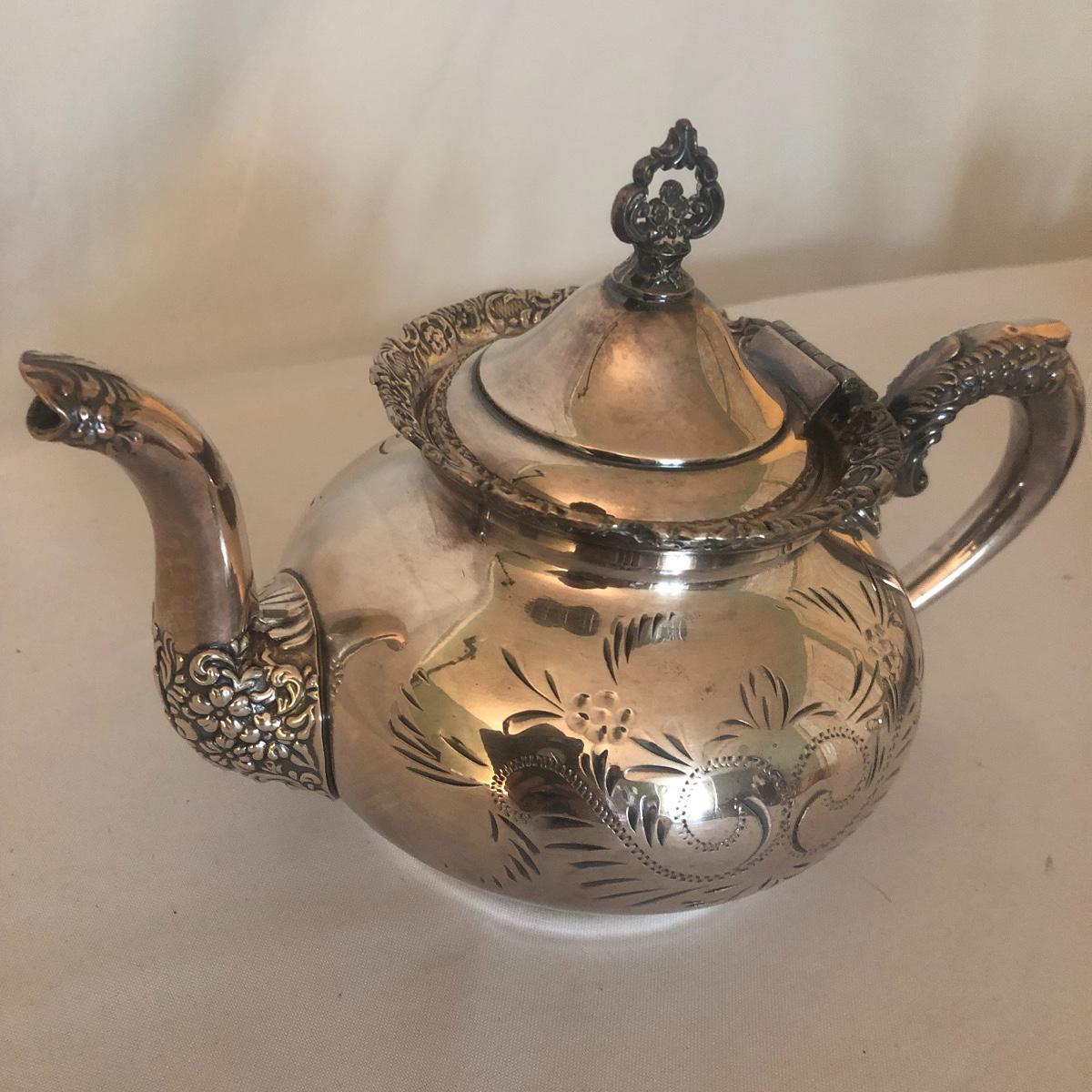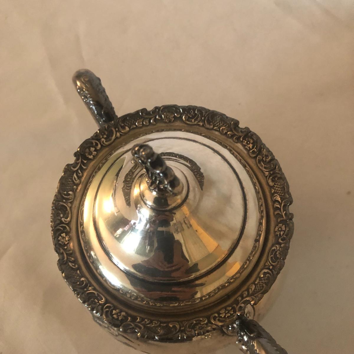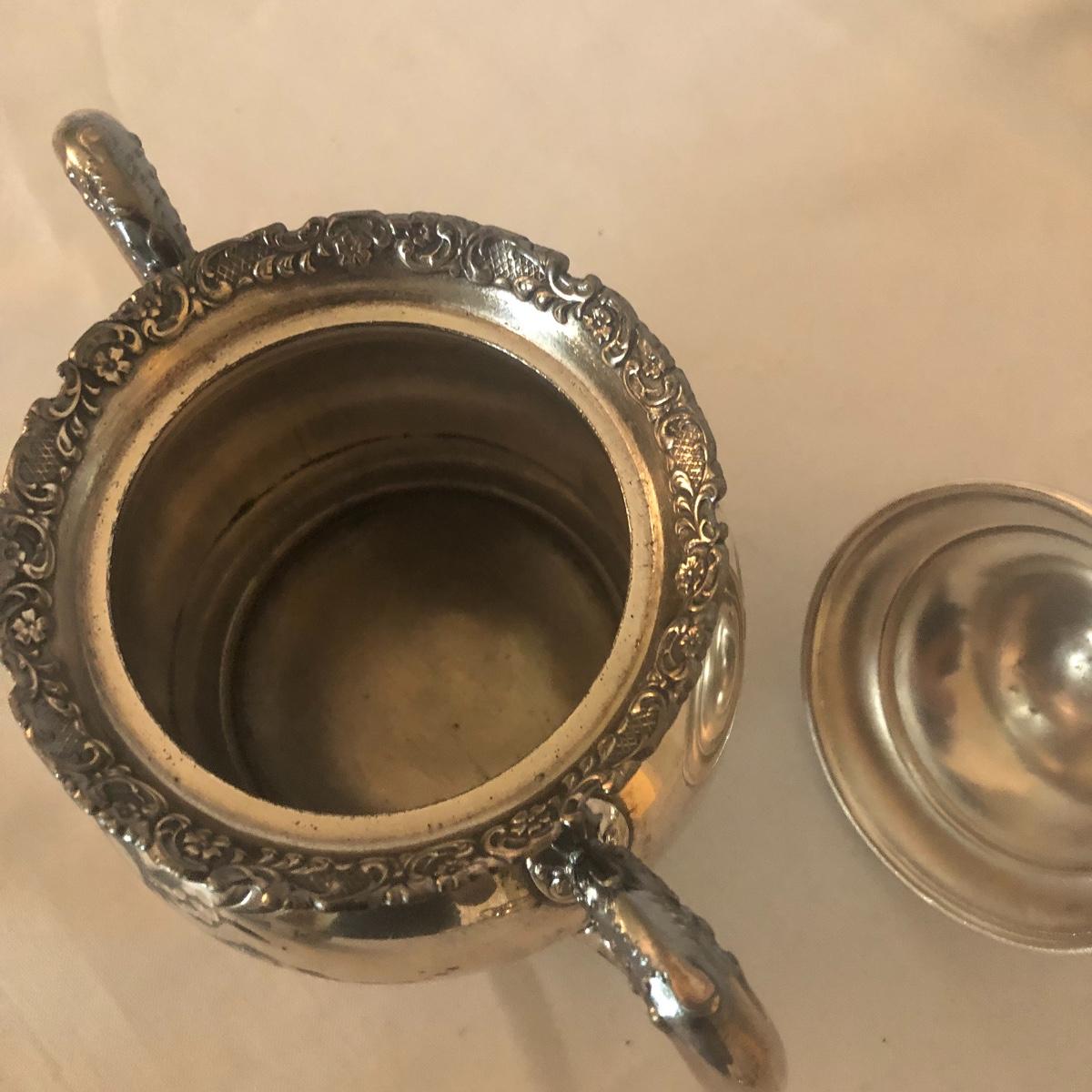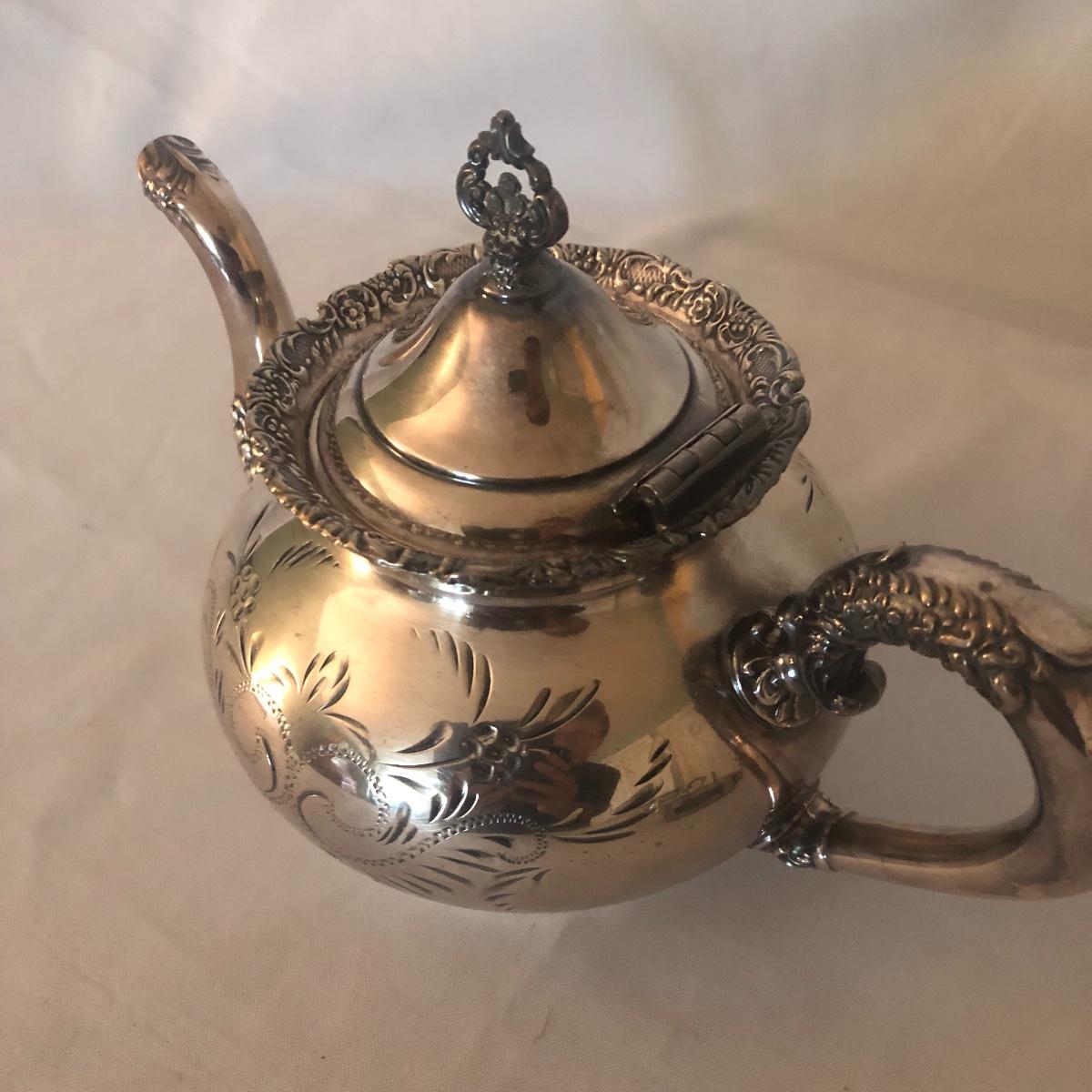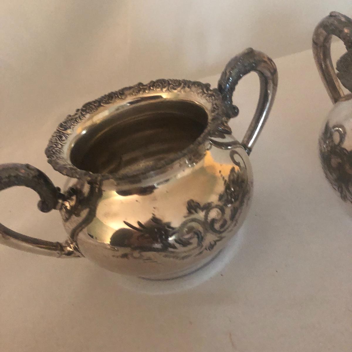 There are six pieces to this set: a tray, cream and sugar set, a teapot, a bell and lidded handled bowl. The bottom of the pieces read, “Patd May 10 1899” and “The Van Bergh S.P. Co. Rochester NY” and “Made in the U.S.A.” and “ Quadruple Plate.” Please note the blemishes on the pieces. The tray 23.5” x 14.5”. Shipping Available.