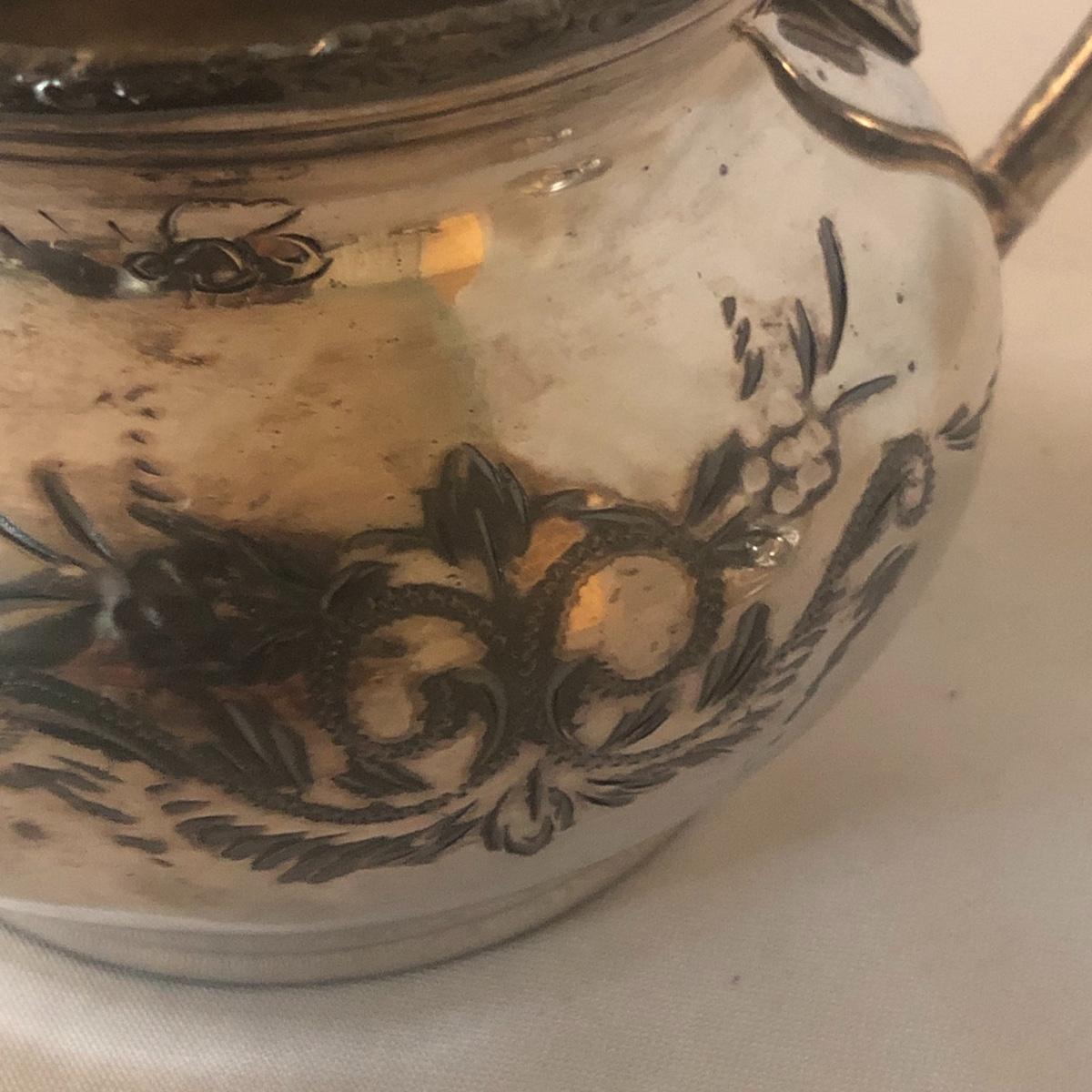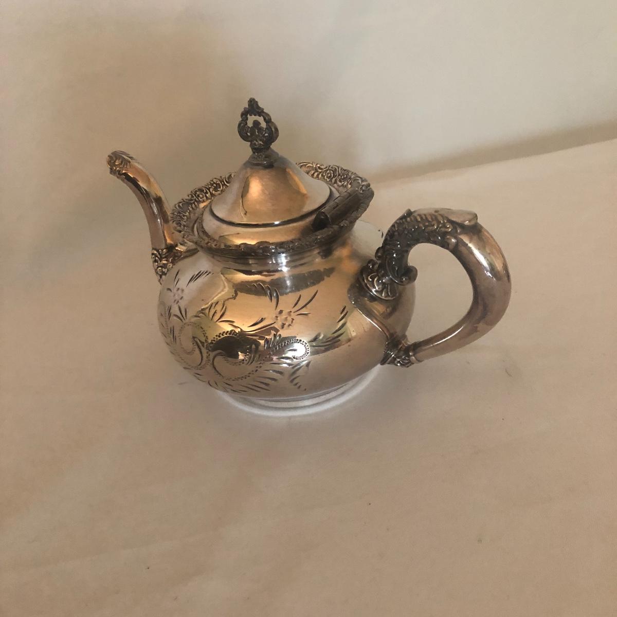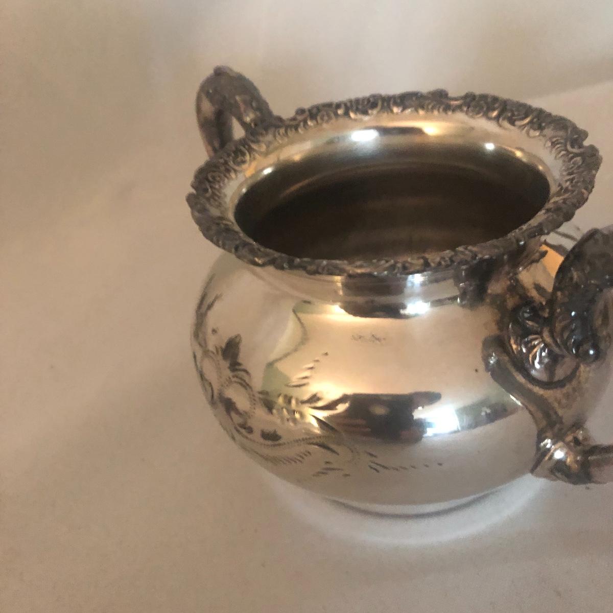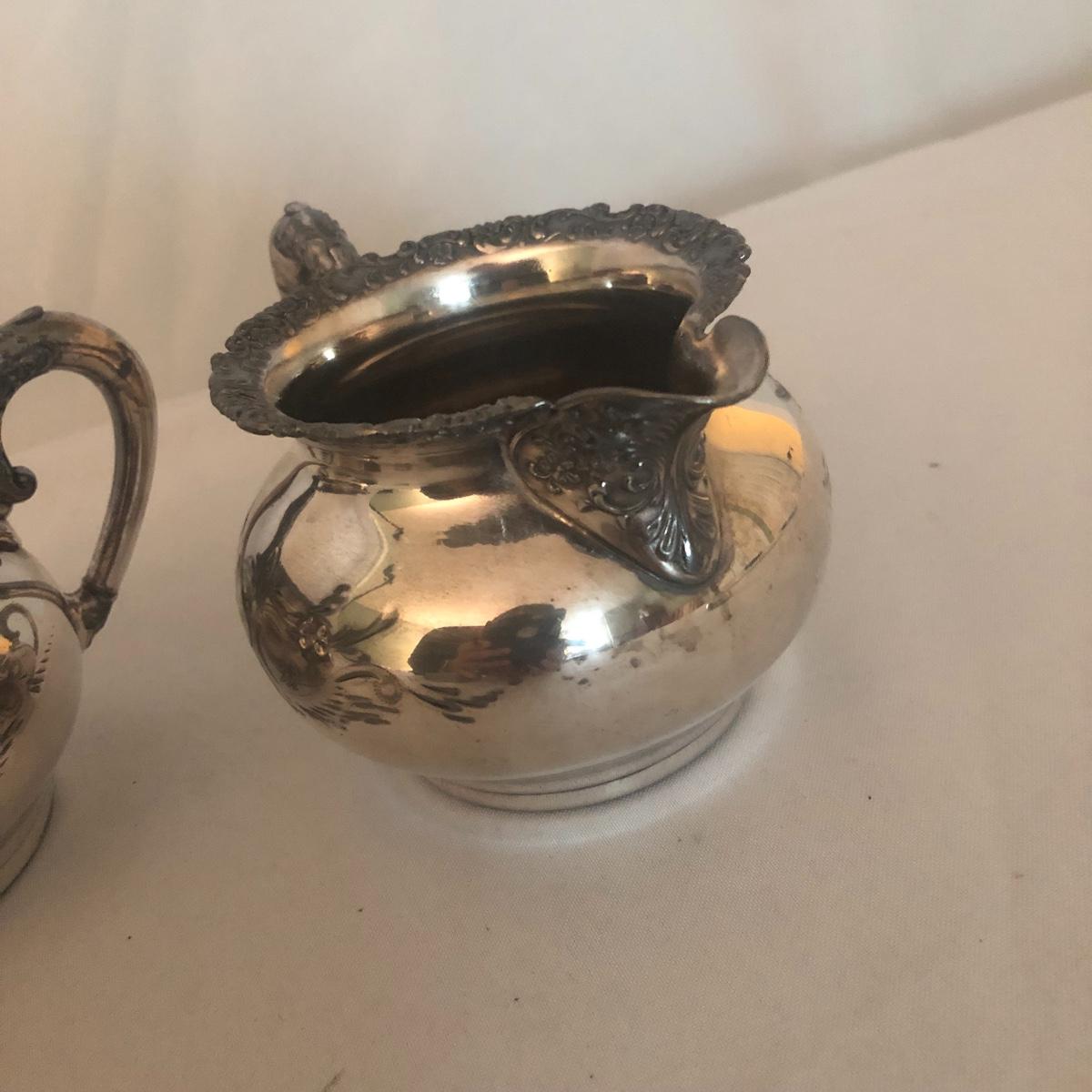 There are six pieces to this set: a tray, cream and sugar set, a teapot, a bell and lidded handled bowl. The bottom of the pieces read, “Patd May 10 1899” and “The Van Bergh S.P. Co. Rochester NY” and “Made in the U.S.A.” and “ Quadruple Plate.” Please note the blemishes on the pieces. The tray 23.5” x 14.5”. Shipping Available.