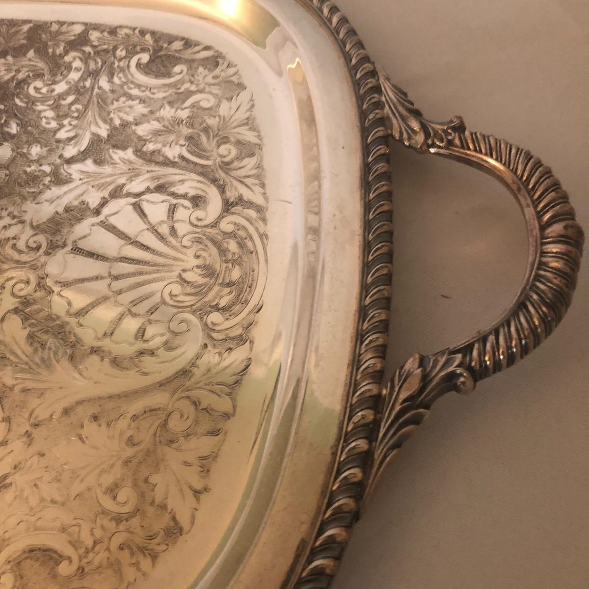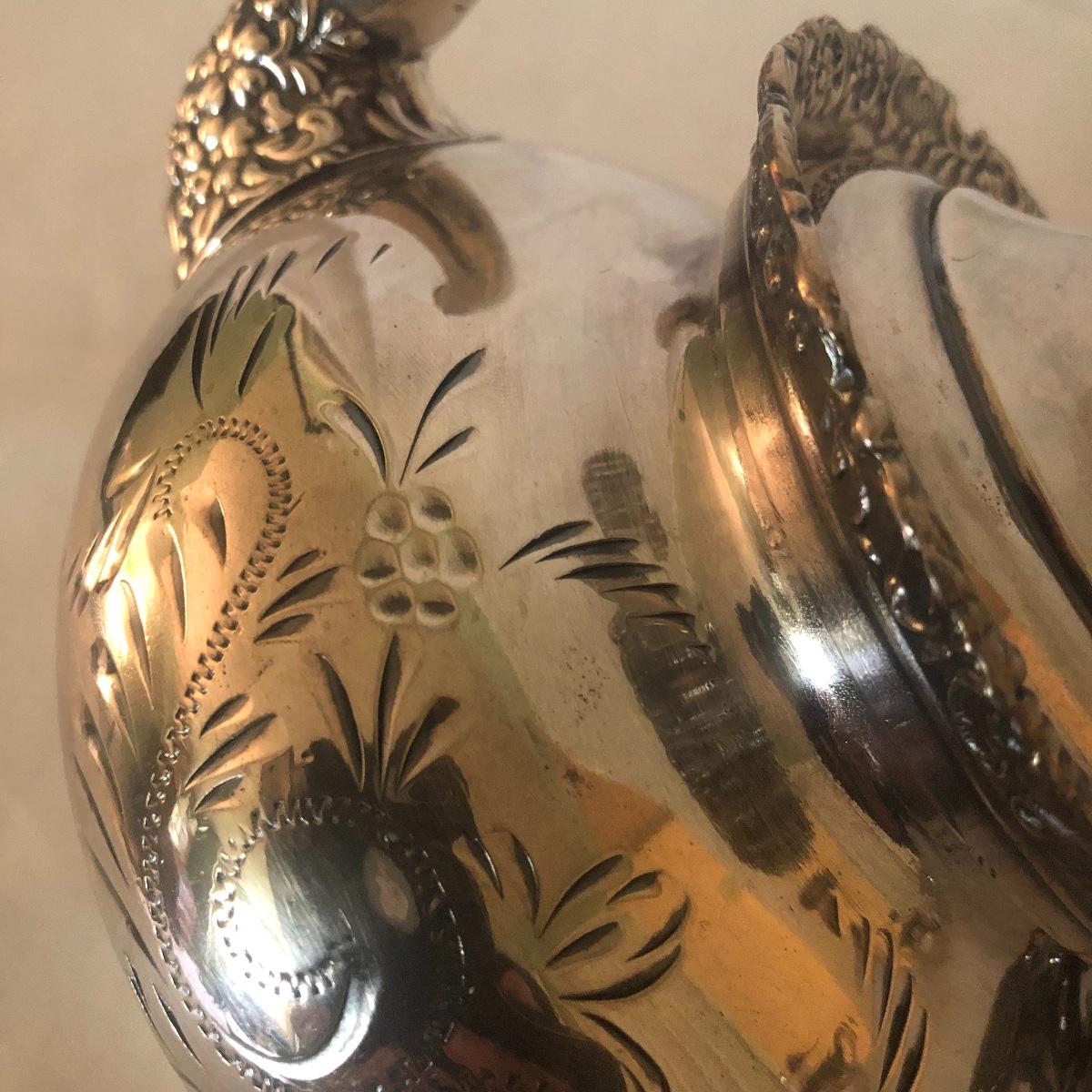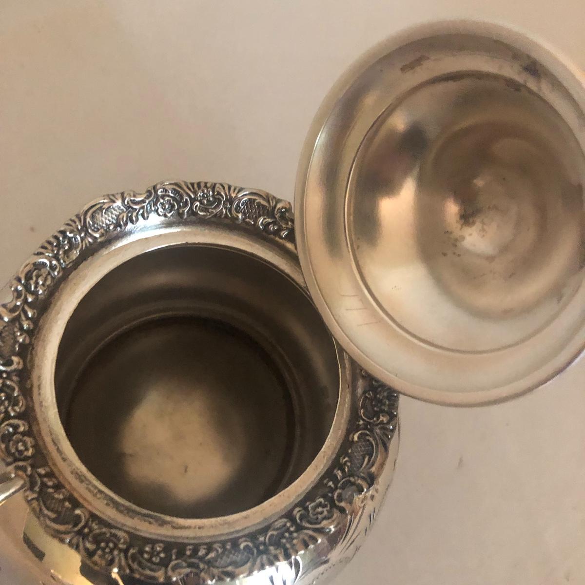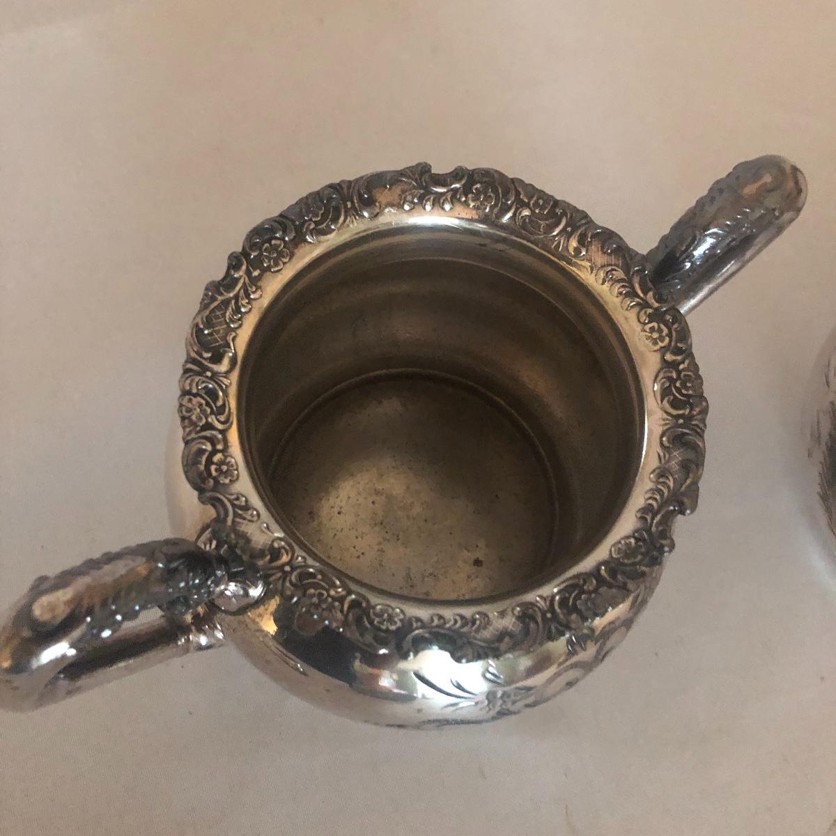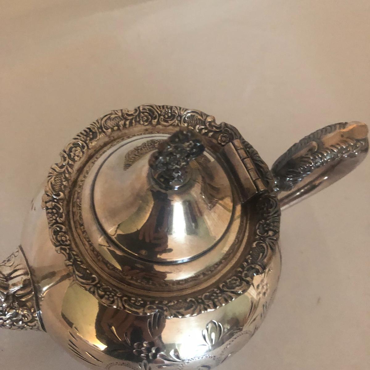 There are six pieces to this set: a tray, cream and sugar set, a teapot, a bell and lidded handled bowl. The bottom of the pieces read, “Patd May 10 1899” and “The Van Bergh S.P. Co. Rochester NY” and “Made in the U.S.A.” and “ Quadruple Plate.” Please note the blemishes on the pieces. The tray 23.5” x 14.5”. Shipping Available.