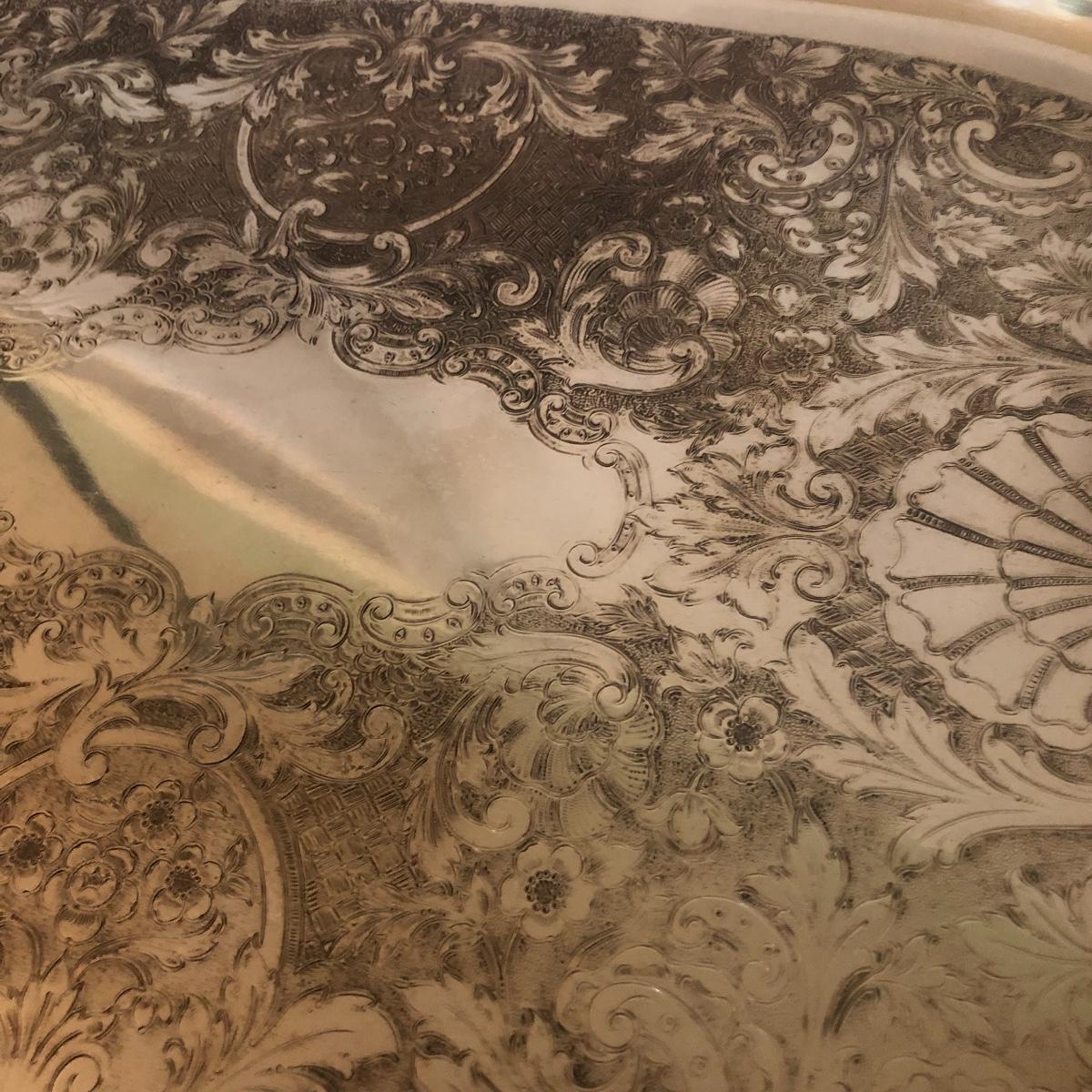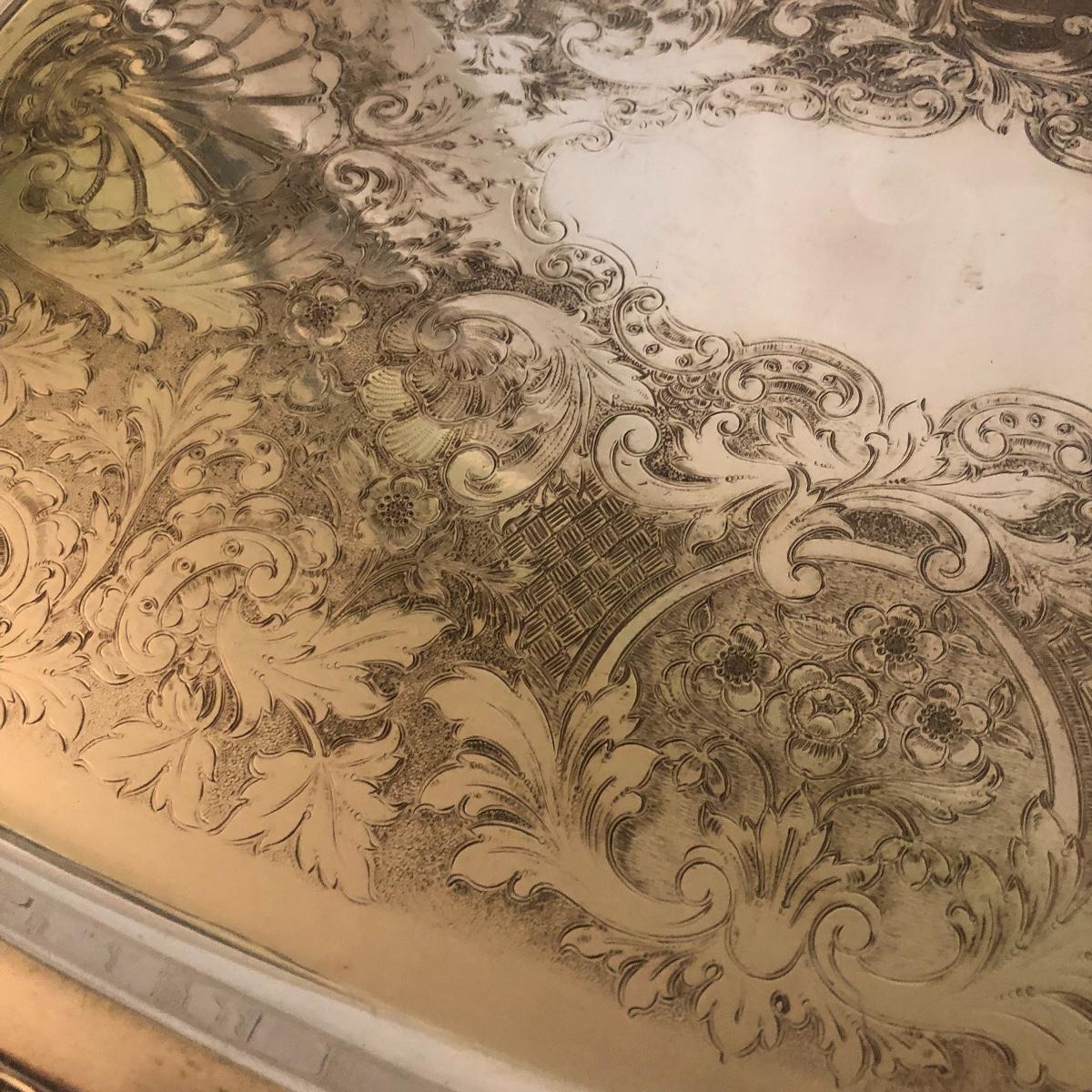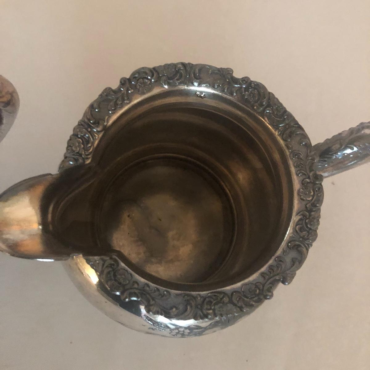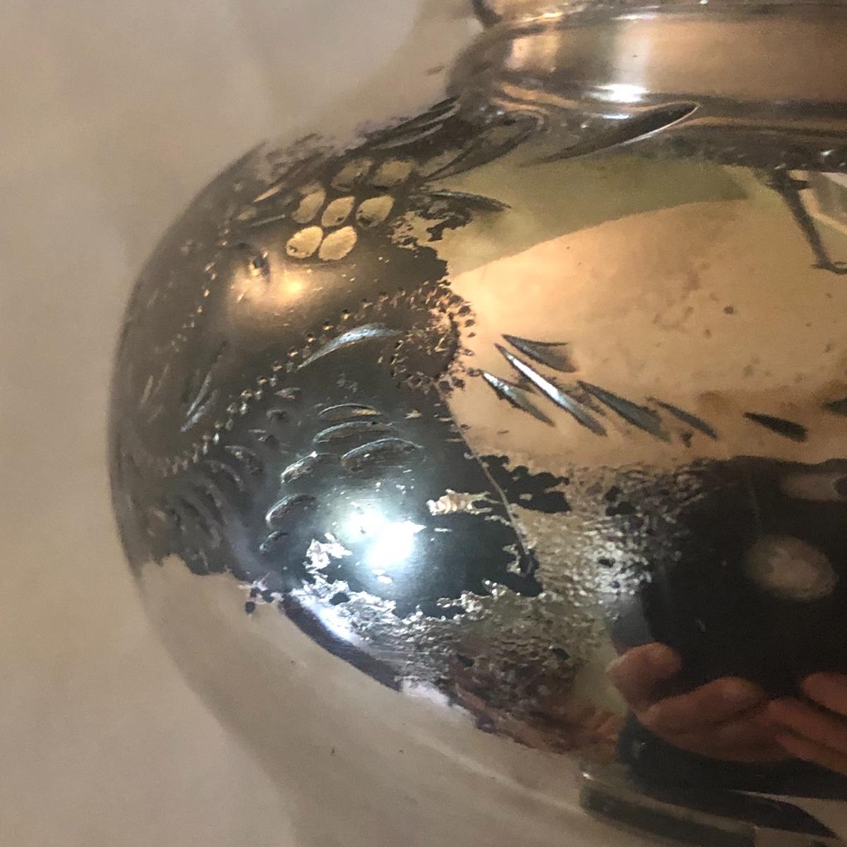 There are six pieces to this set: a tray, cream and sugar set, a teapot, a bell and lidded handled bowl. The bottom of the pieces read, “Patd May 10 1899” and “The Van Bergh S.P. Co. Rochester NY” and “Made in the U.S.A.” and “ Quadruple Plate.” Please note the blemishes on the pieces. The tray 23.5” x 14.5”. Shipping Available.