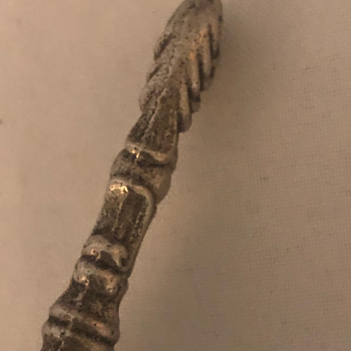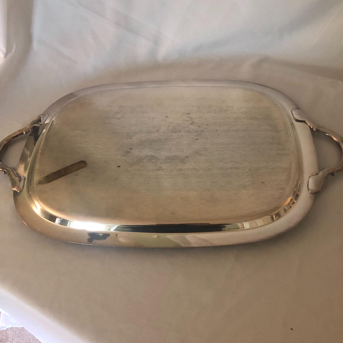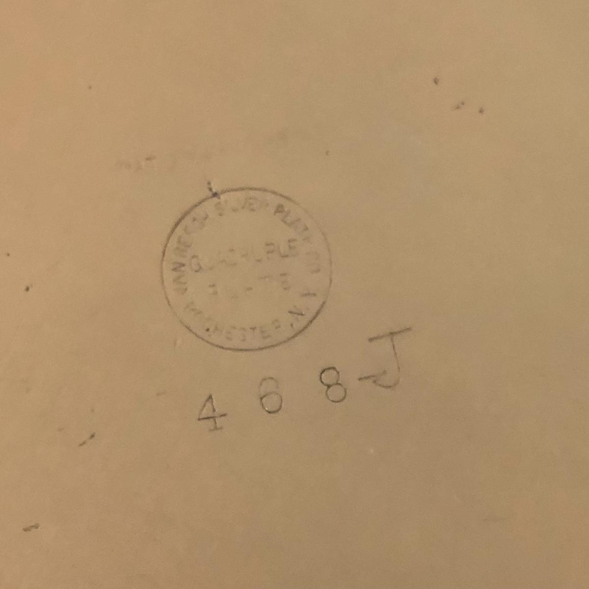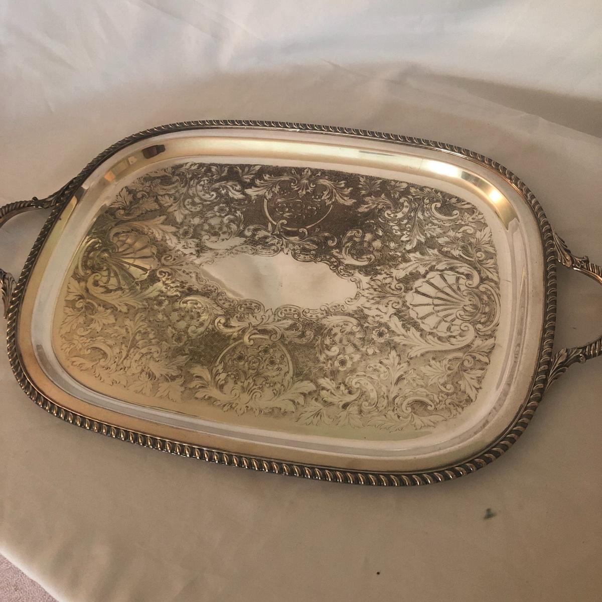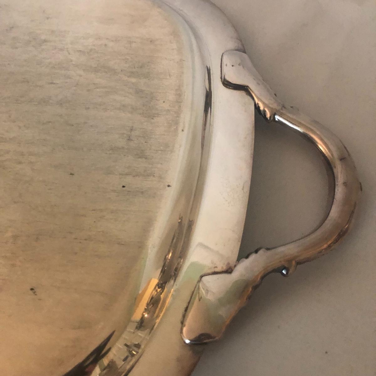 There are six pieces to this set: a tray, cream and sugar set, a teapot, a bell and lidded handled bowl. The bottom of the pieces read, “Patd May 10 1899” and “The Van Bergh S.P. Co. Rochester NY” and “Made in the U.S.A.” and “ Quadruple Plate.” Please note the blemishes on the pieces. The tray 23.5” x 14.5”. Shipping Available.