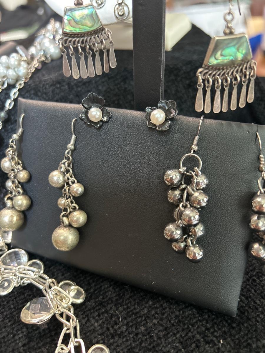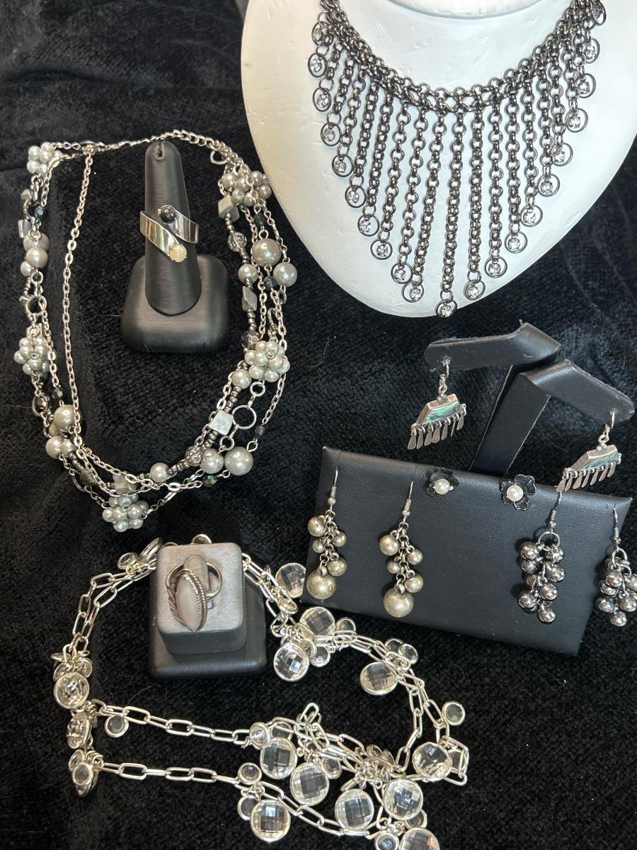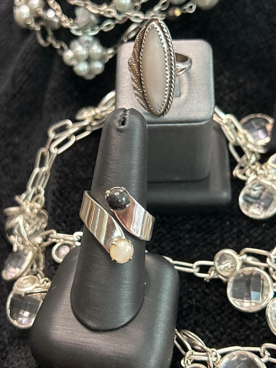 All pierced ears, three necklaces and two rings. The mother of pearl ring is a size 6.5 likely sterling (no stamp). The 2 stone ring is a size 7.5-8 (slightly adjustable) The Abalone earrings are stamped 925.
