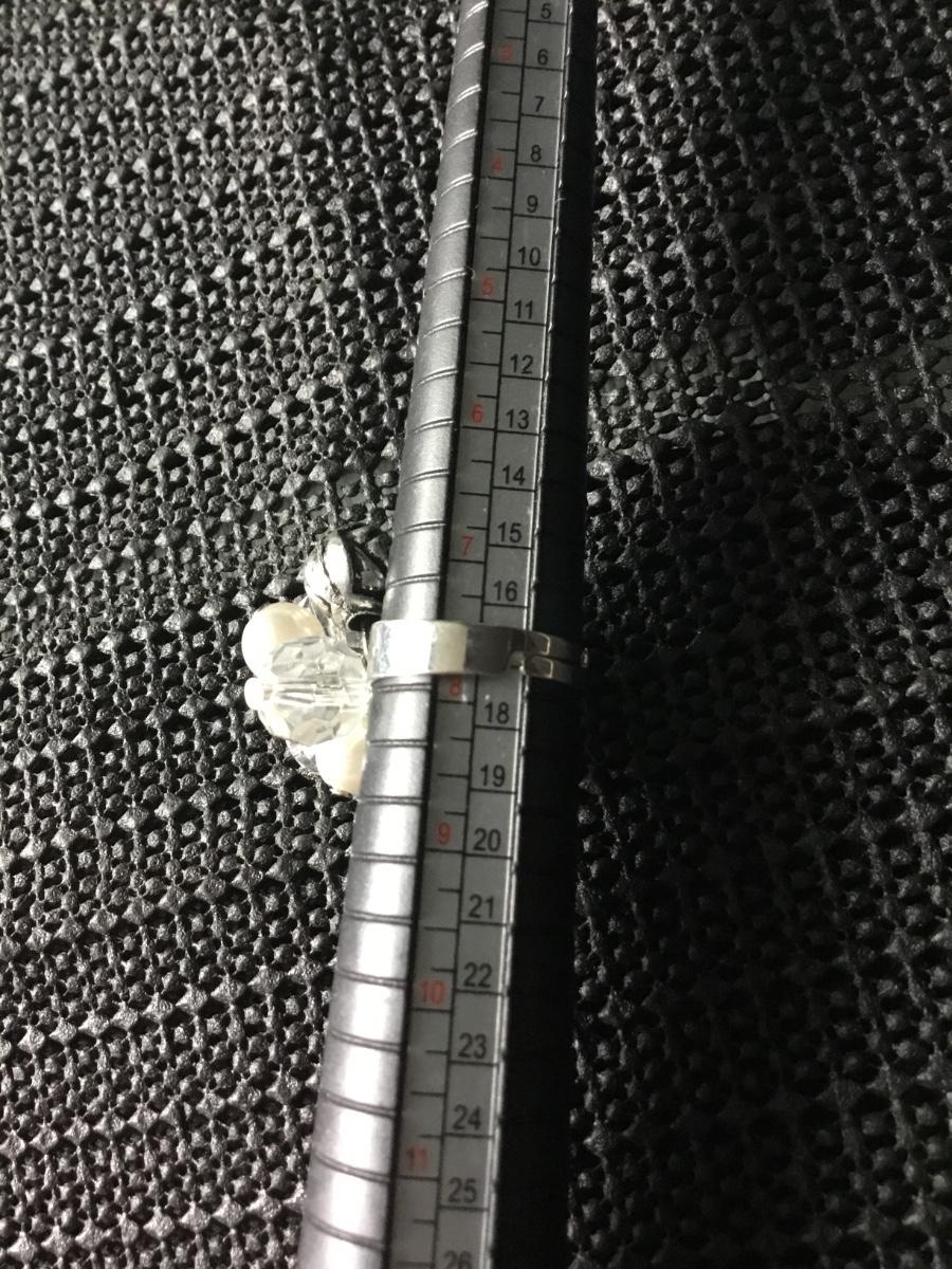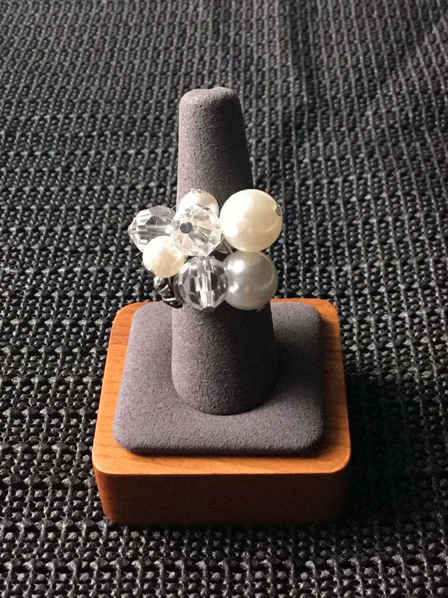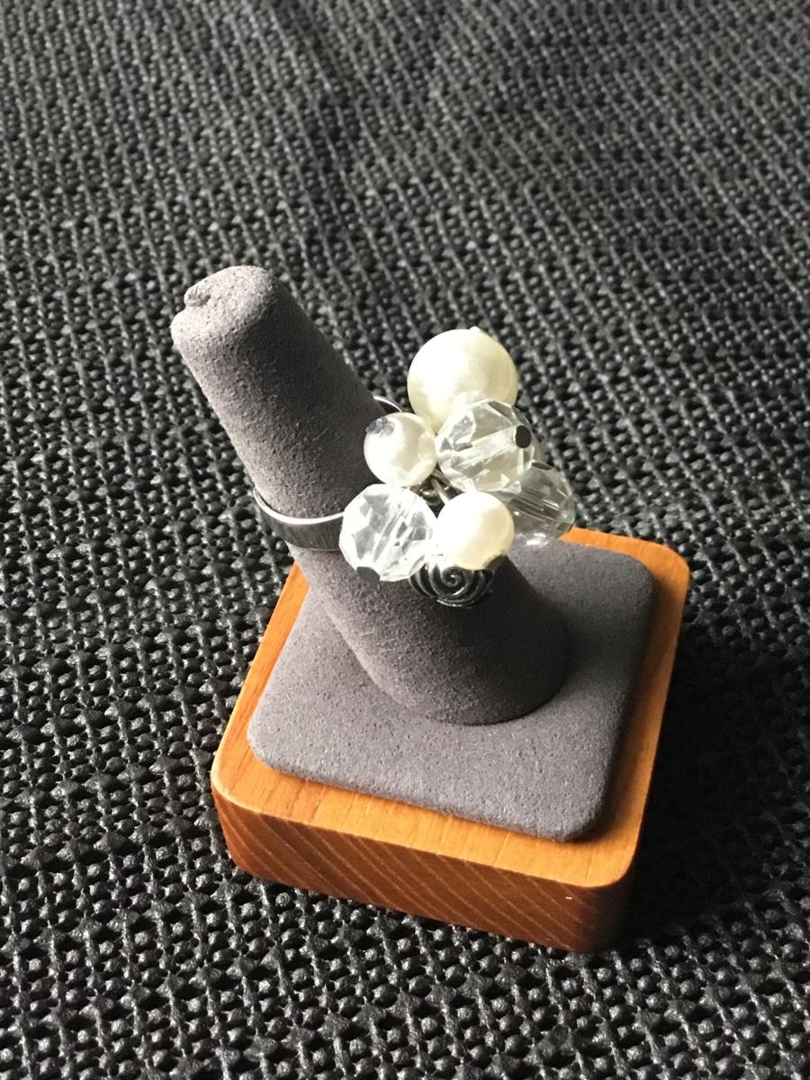 Silver tone adjustable ring featuring faux pearls and crystals accents