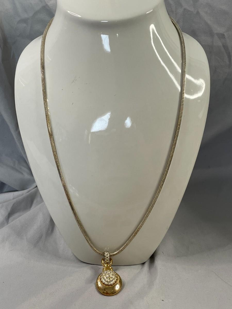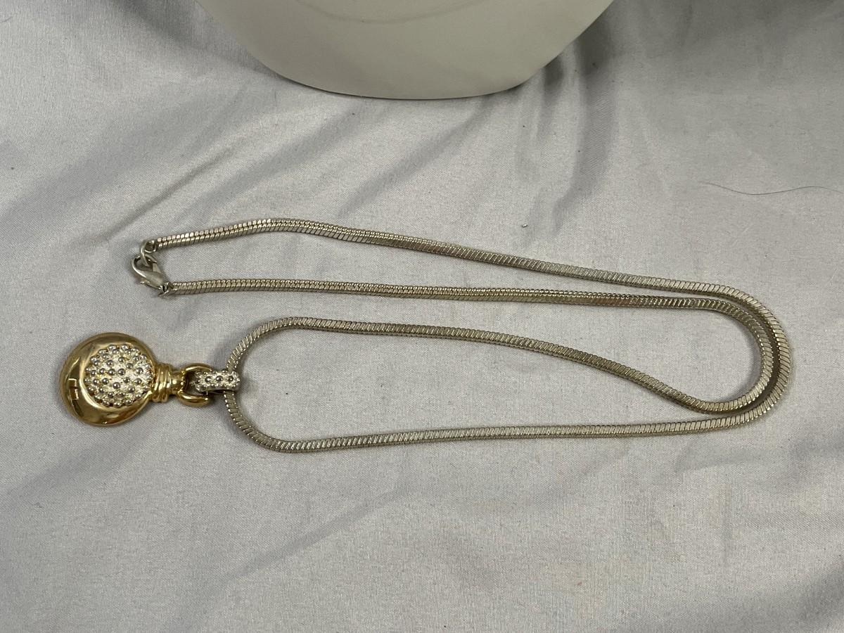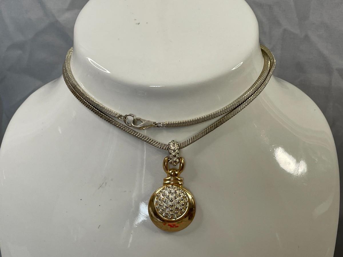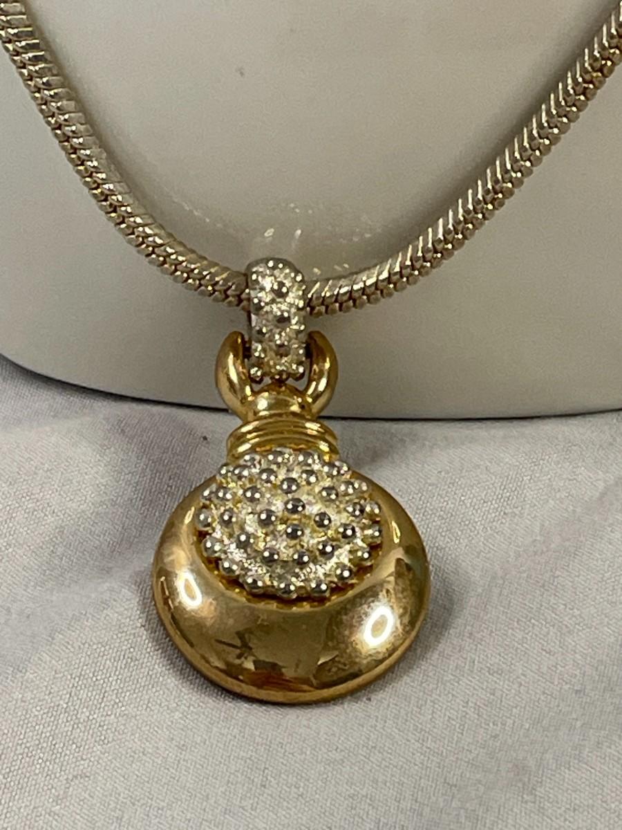 Pretty piece that is unmarked. The pendant is a comination textured silver tone on smooth gold tone metal and the chain is silver tone and about 28 inches long.