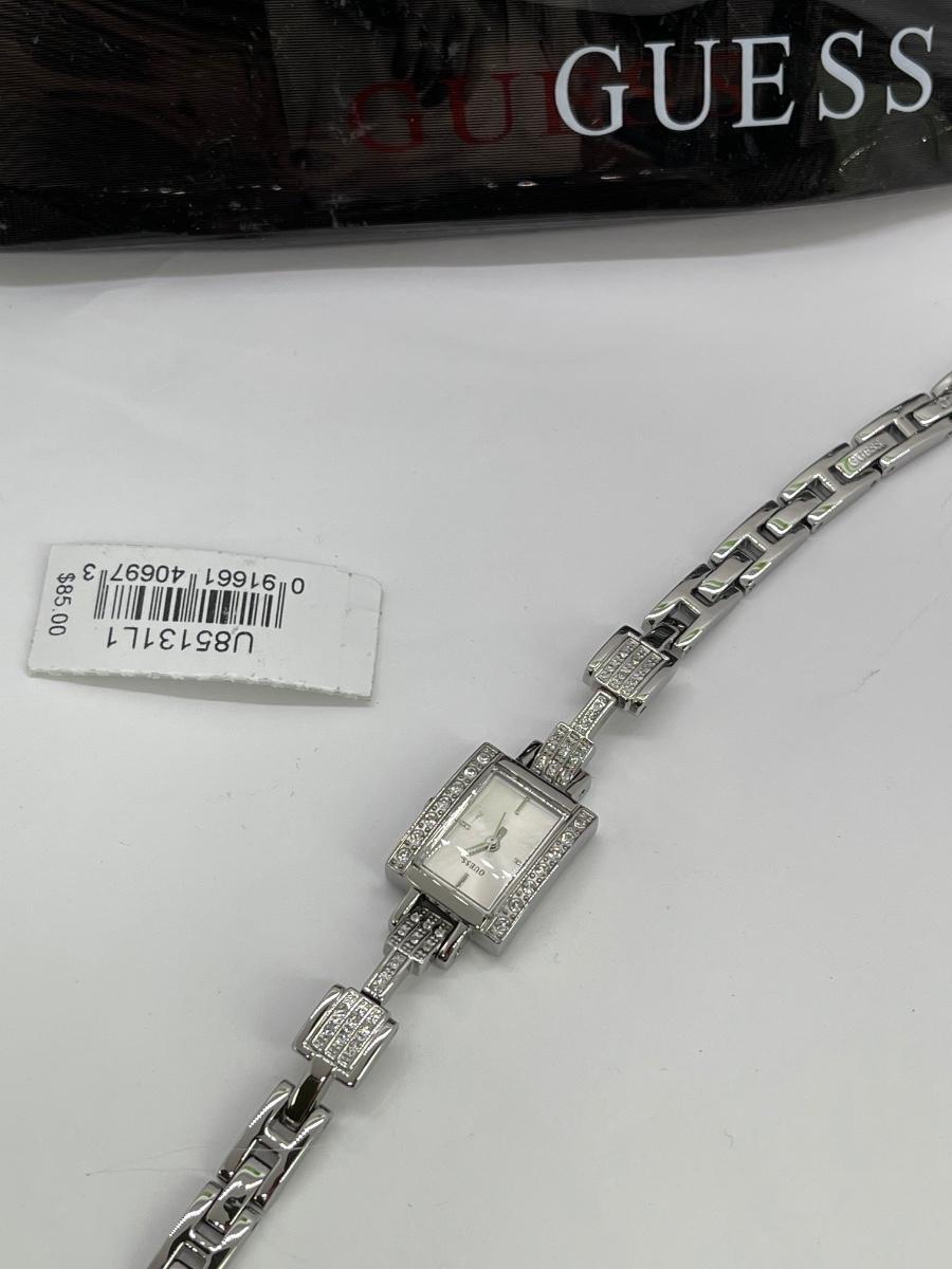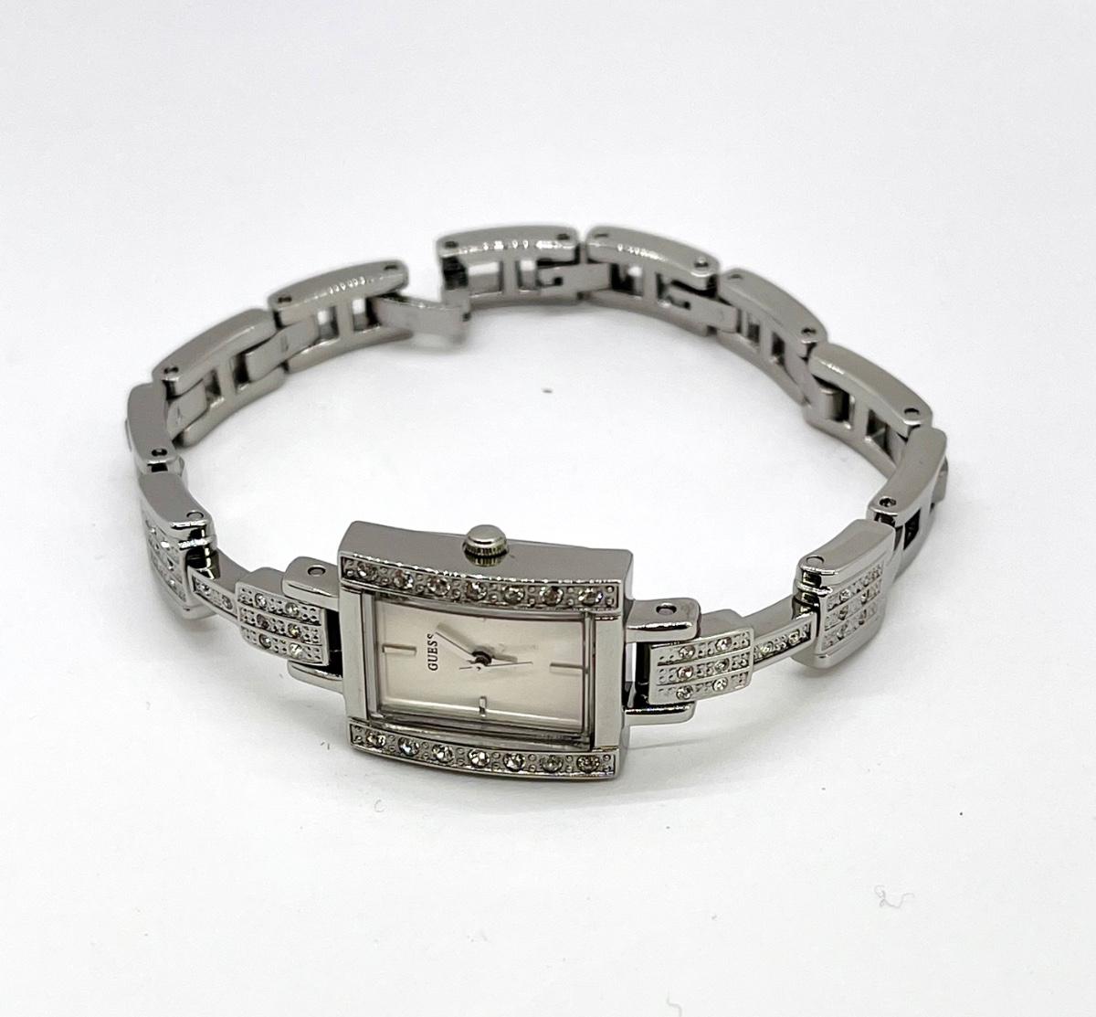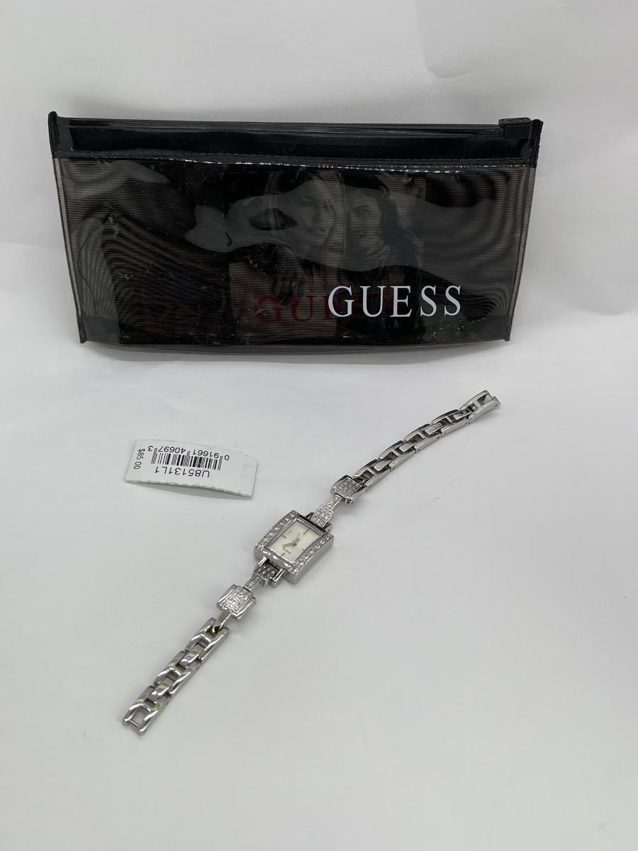 Silver Tone Art Deco Style GUESS Watch. Has a removeable link for sizing. Needs a new battery. Looks unused, comes with original tag and vinyl zipper pouch.