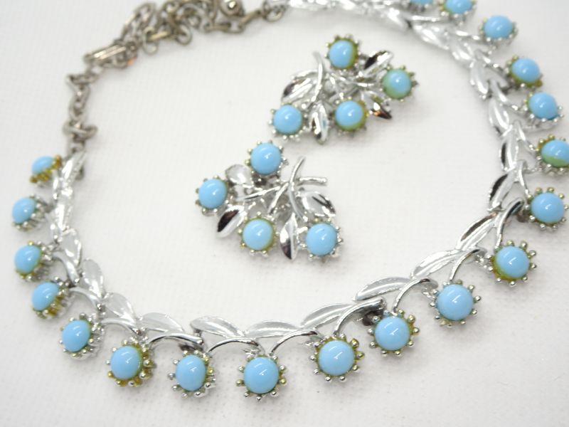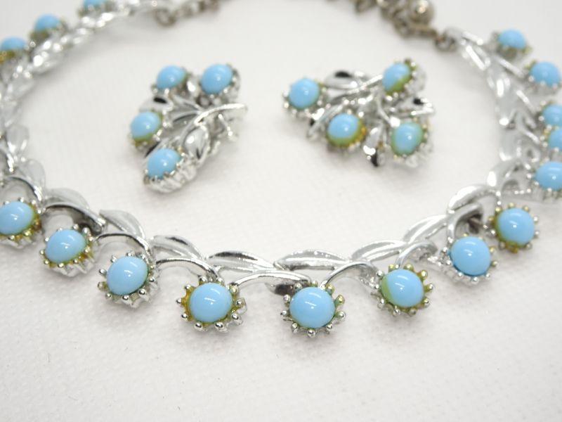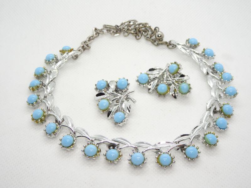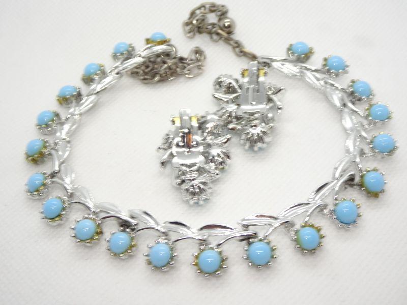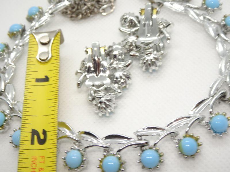 Silver Tone Baby Blue Necklace & Matching Clip On Earrings - Mid Century Jewelry