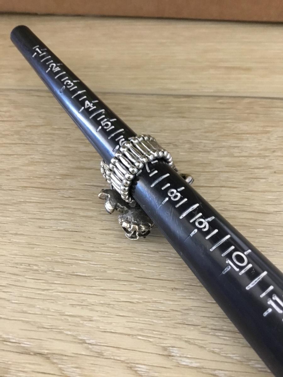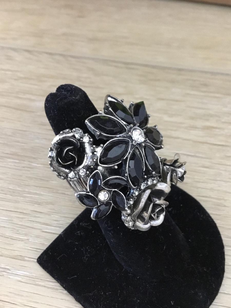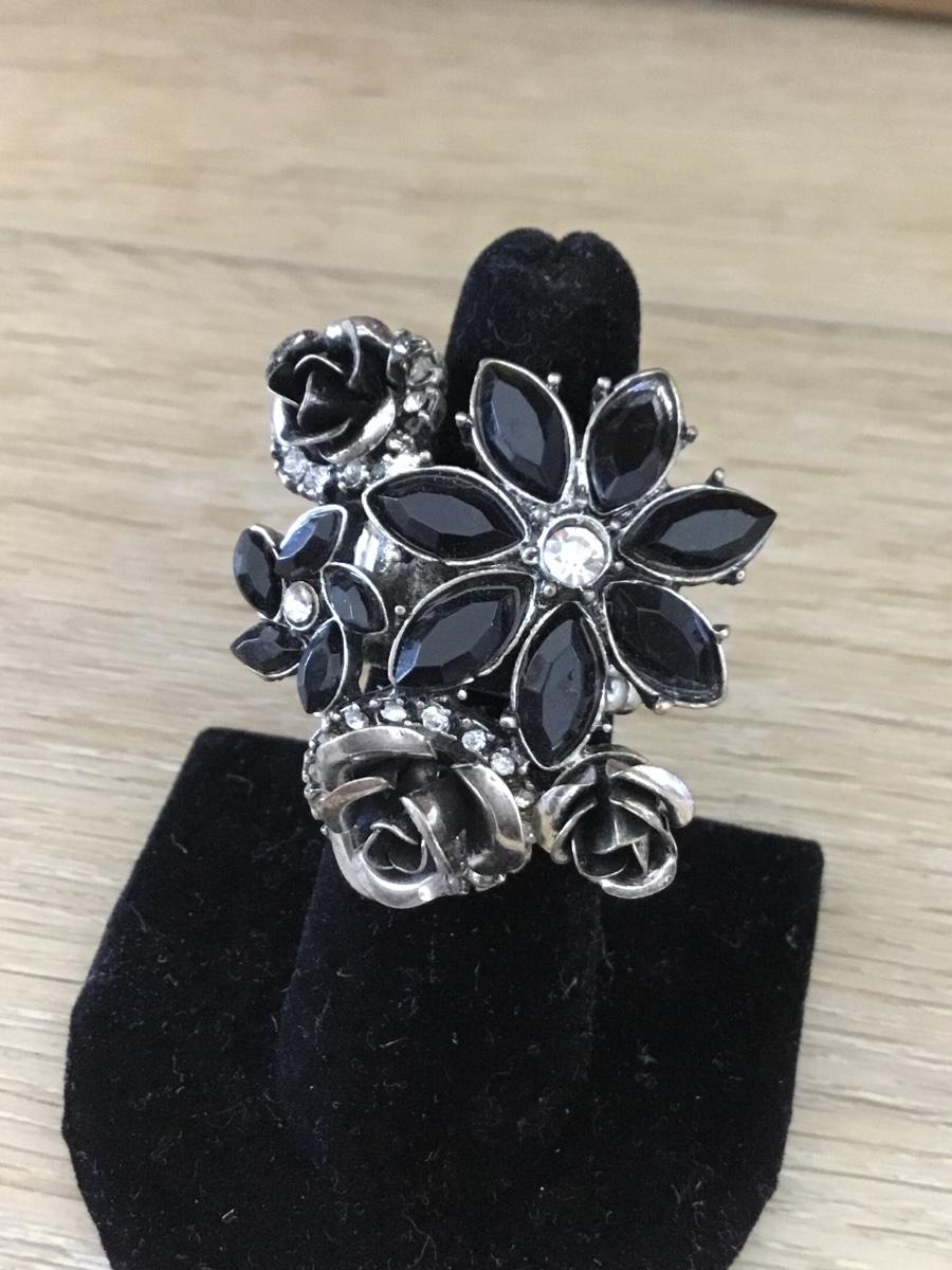 Silver tone black flower fashion adjustable ring