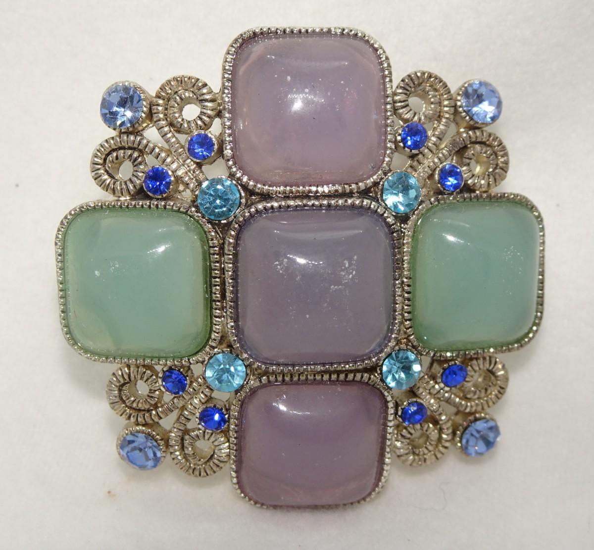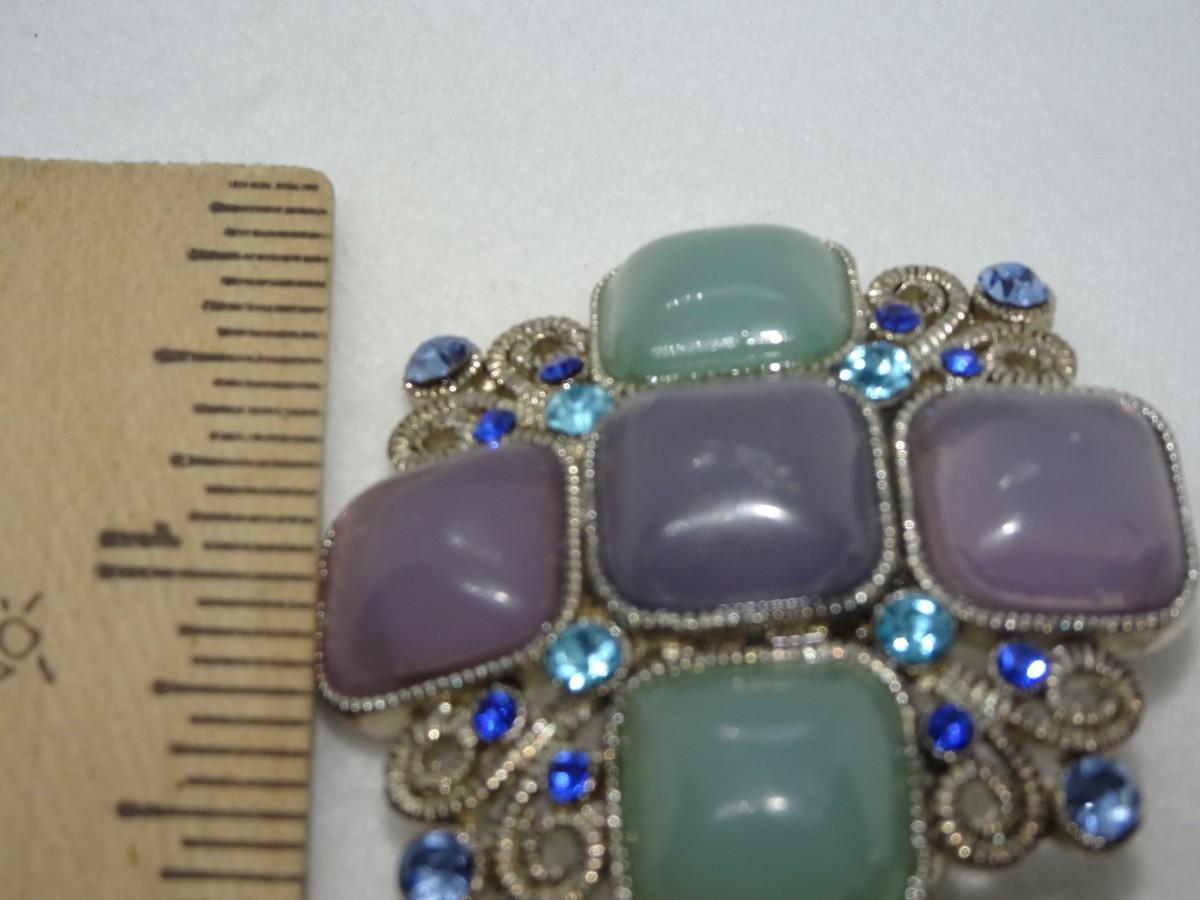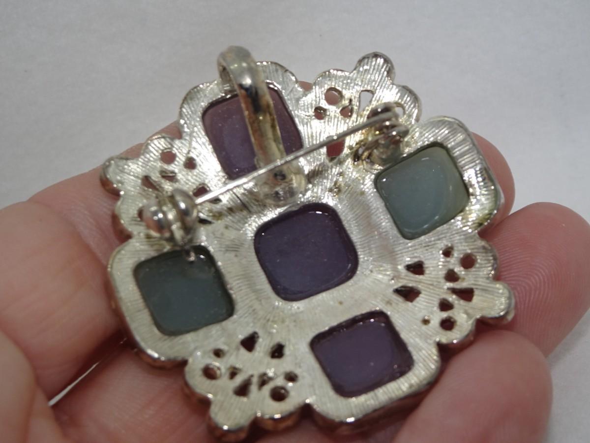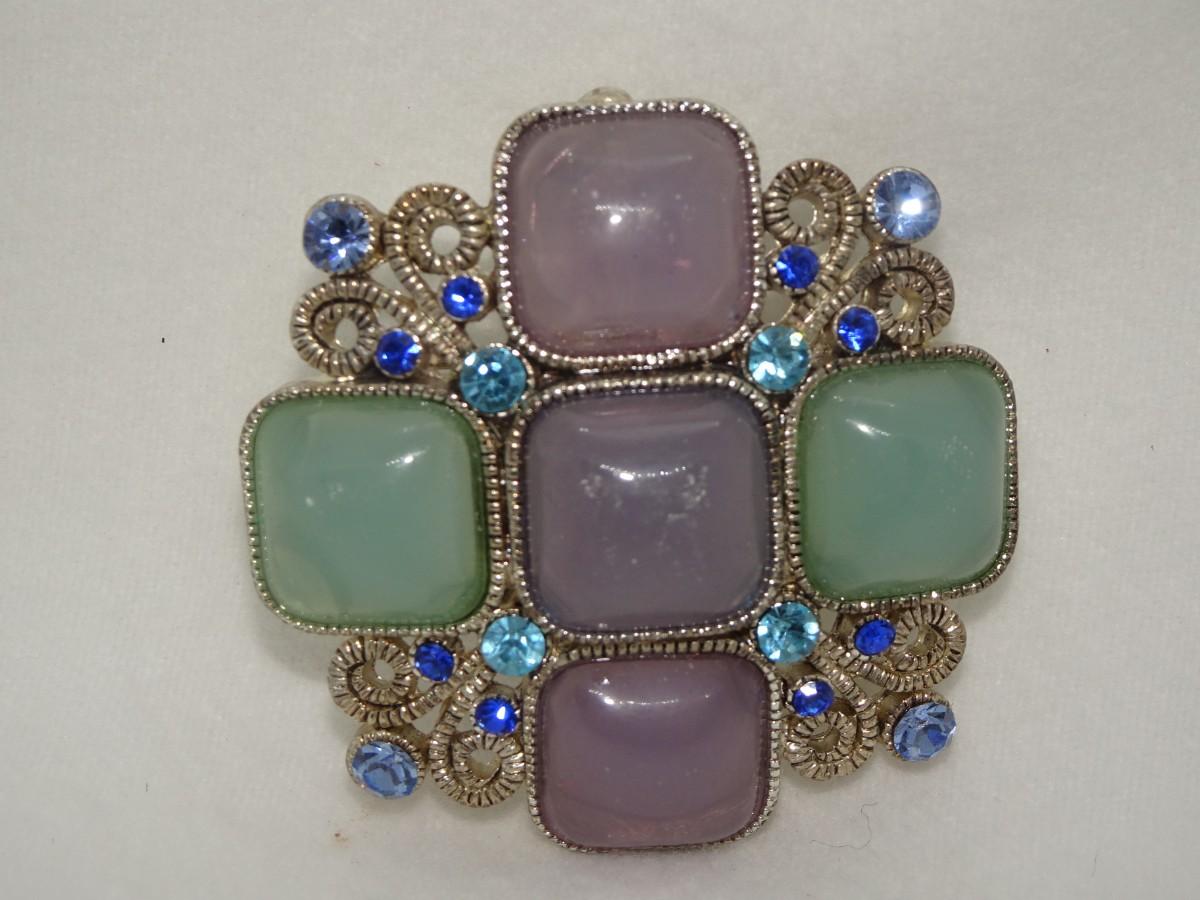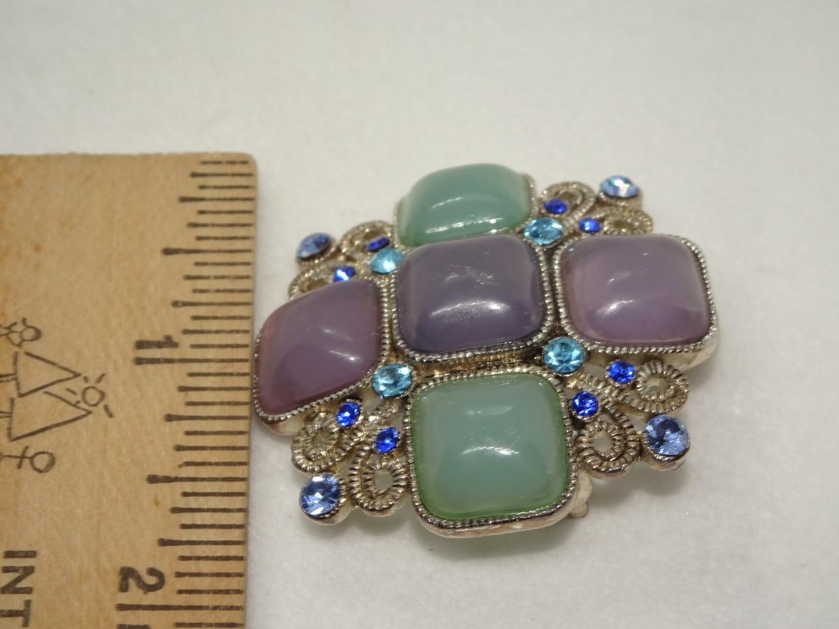 Silver Tone Blue Rhinestone Purple & Green Brooch