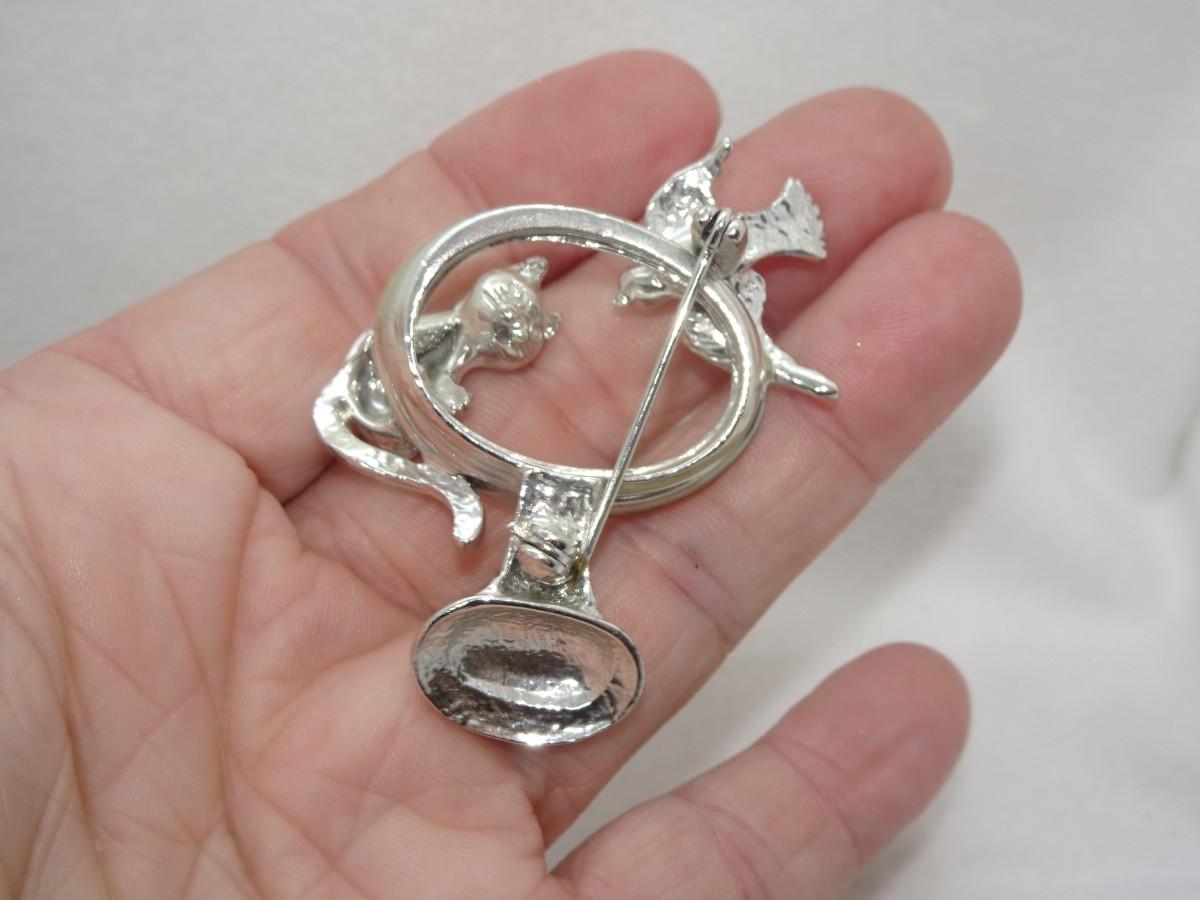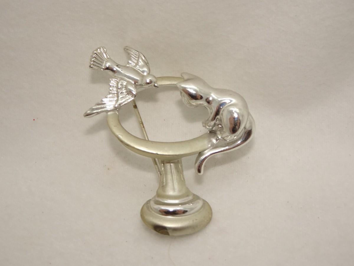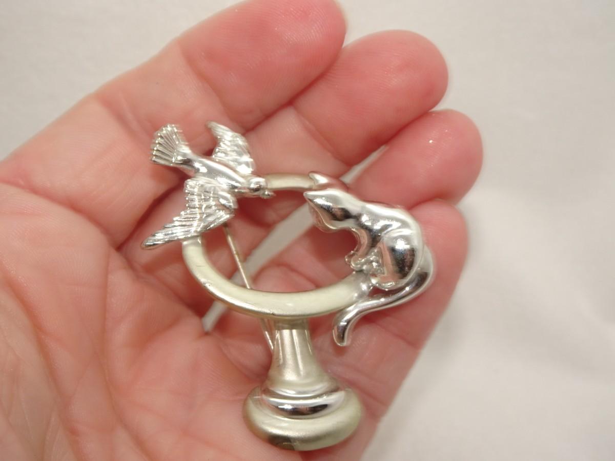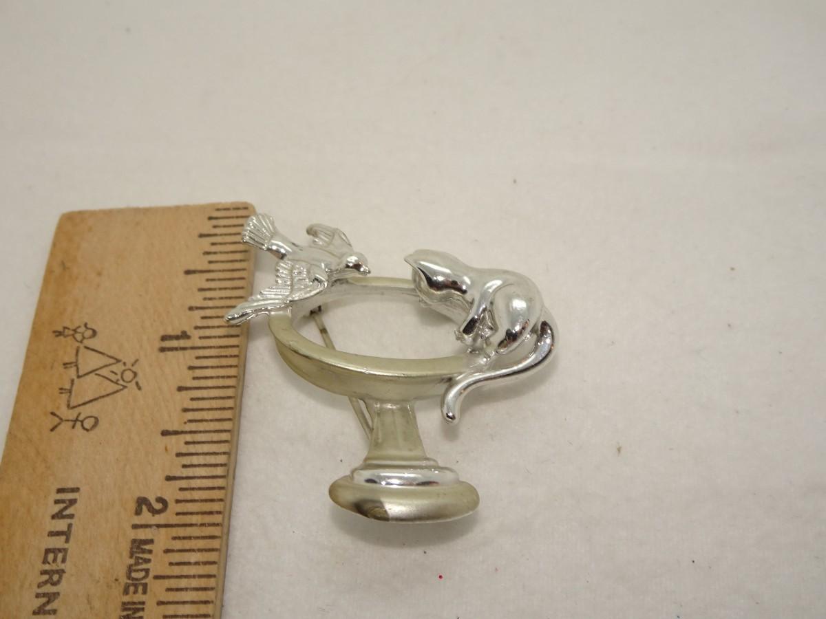 Silver Tone Cat & Bird, Bird Bath, Sparrow, Kitten Pin