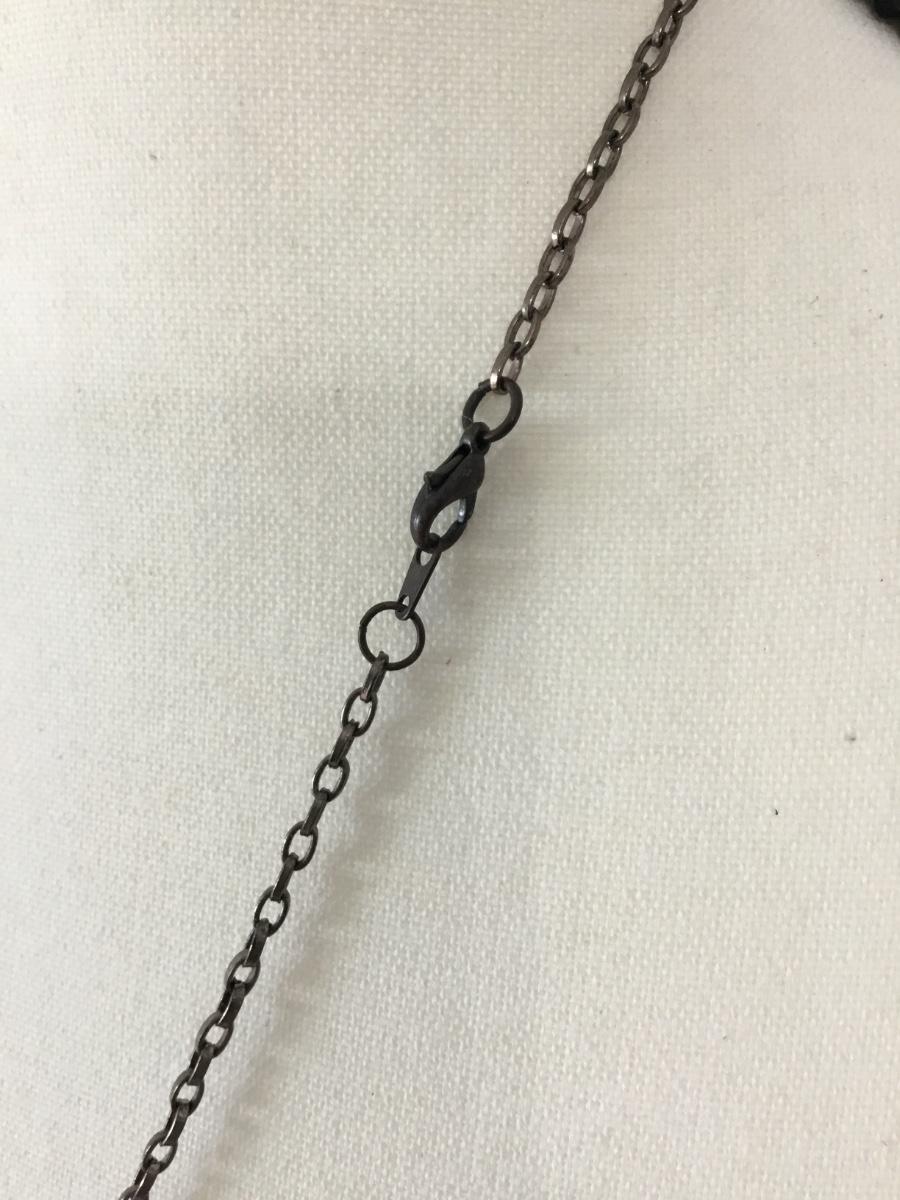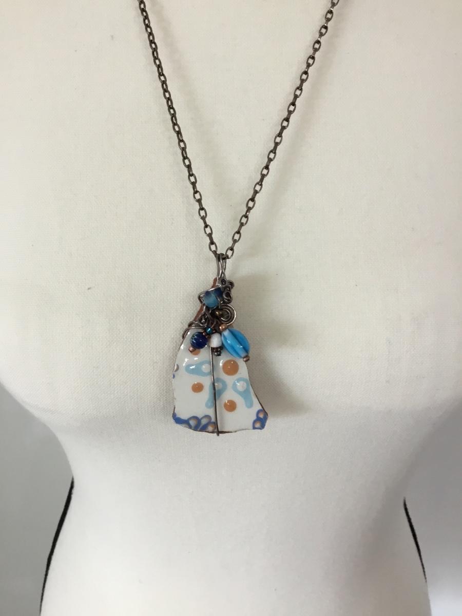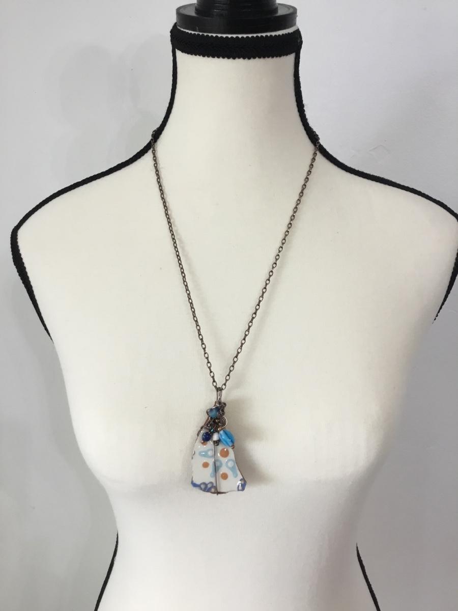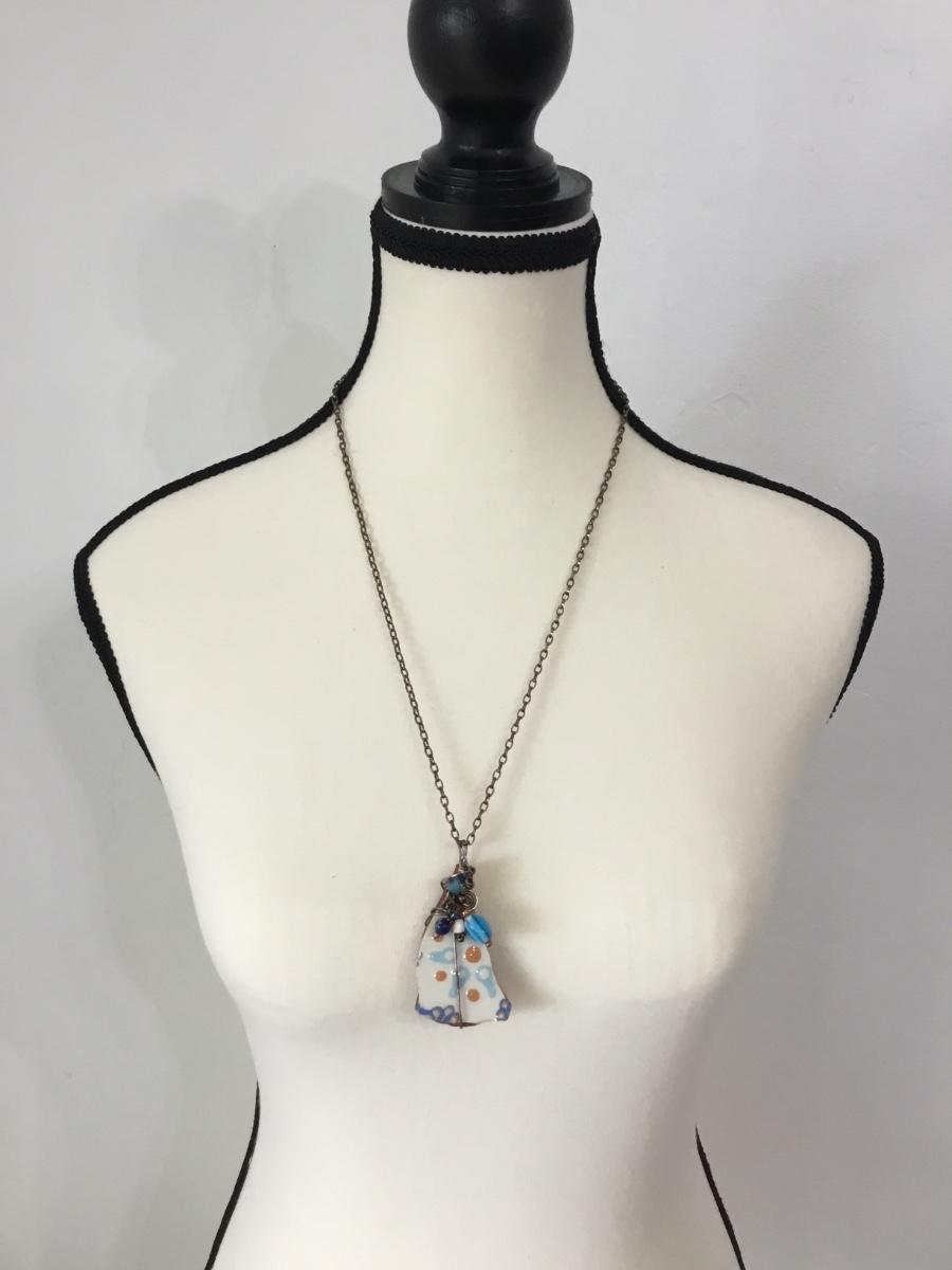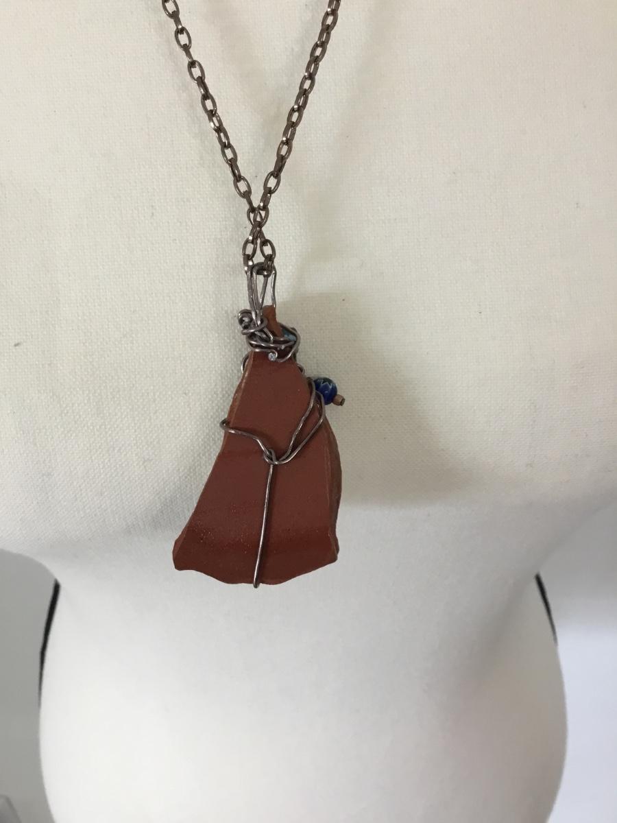 Silver tone chain necklace with clay pottery wire, wrapped pendant