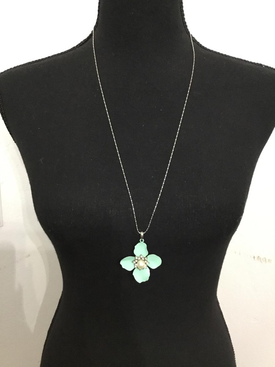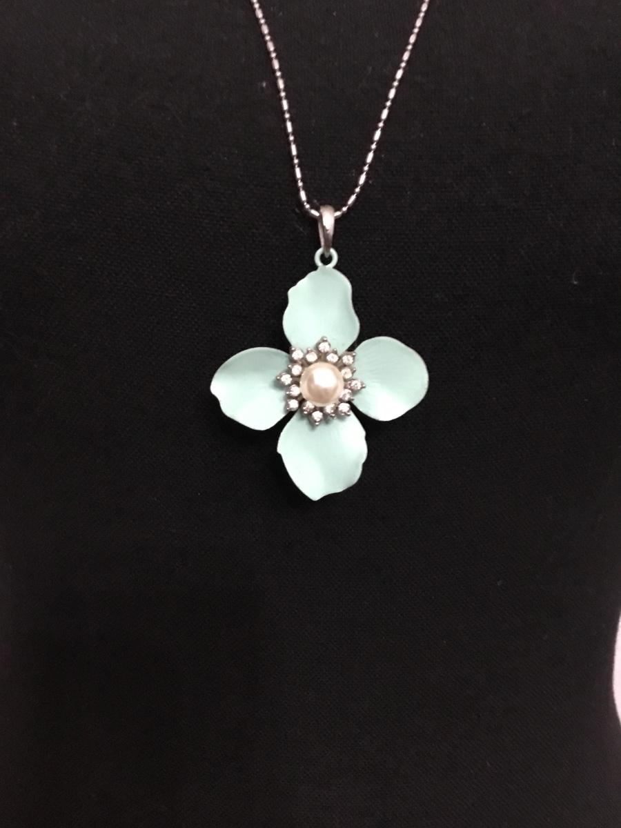 Silver tone chain with turquoise, rhinestone flower pendant, statement, necklace