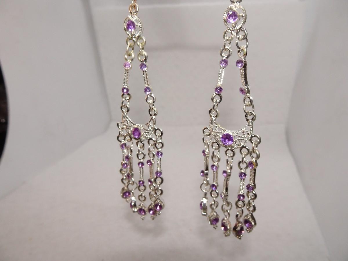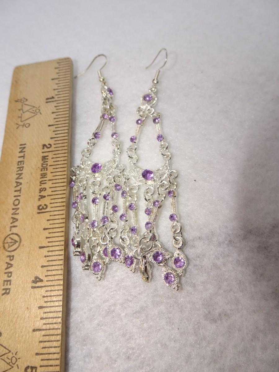Silver Tone Chandelier Purple Rhinestone Earrings