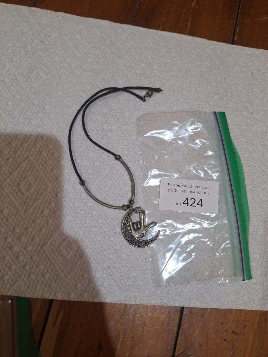 silver tone charm necklace with a pendant and hand making the I love you sign in American Sign Language.